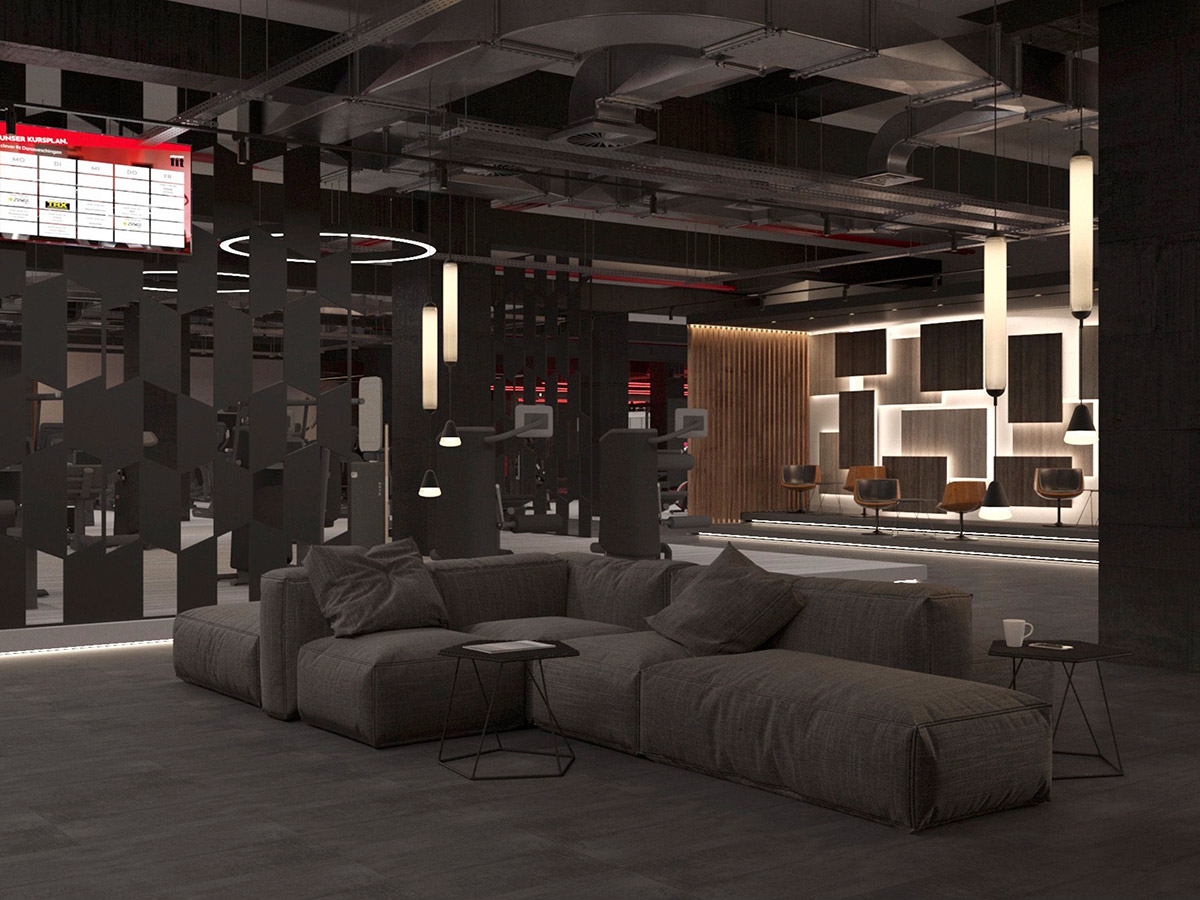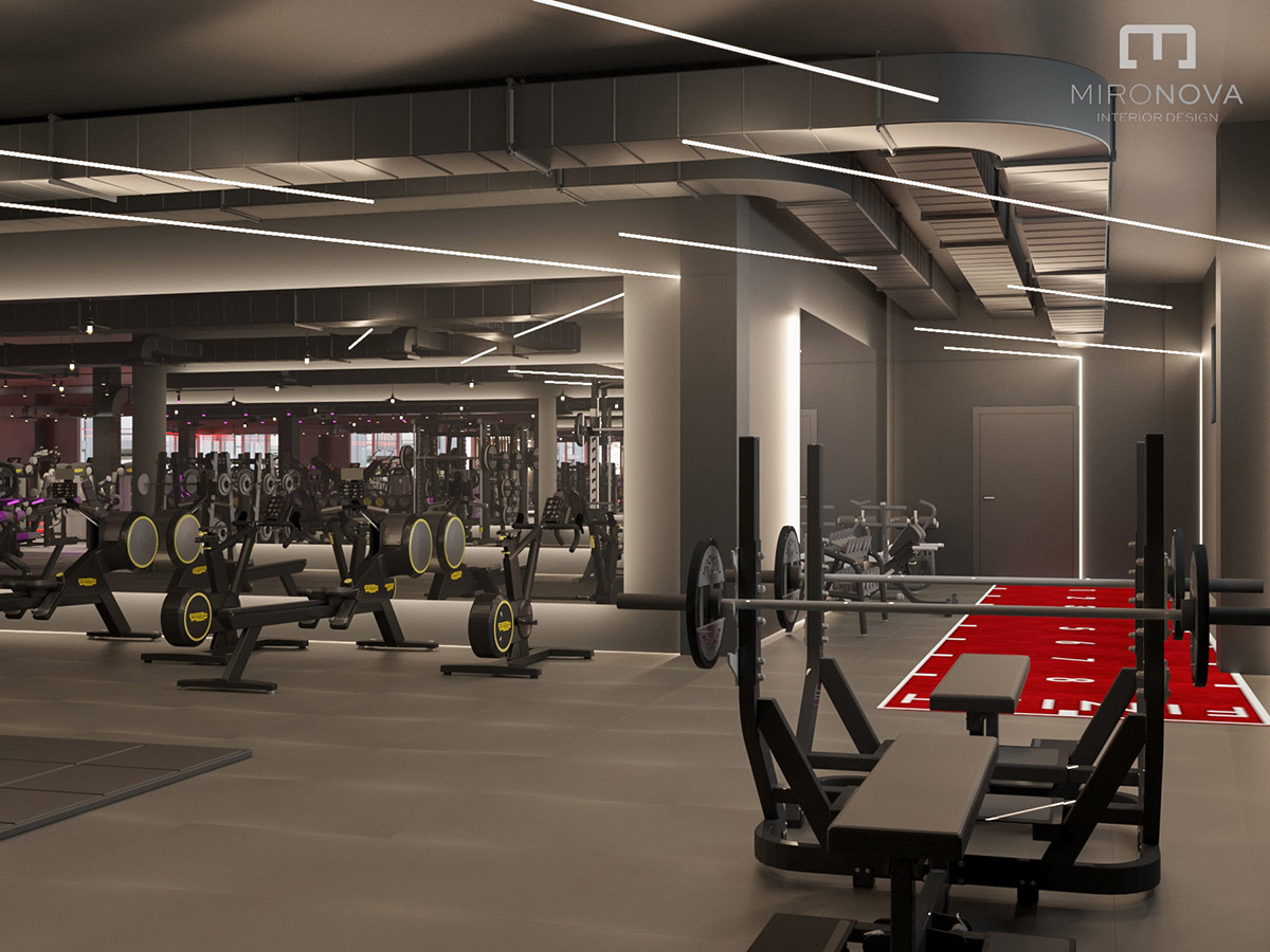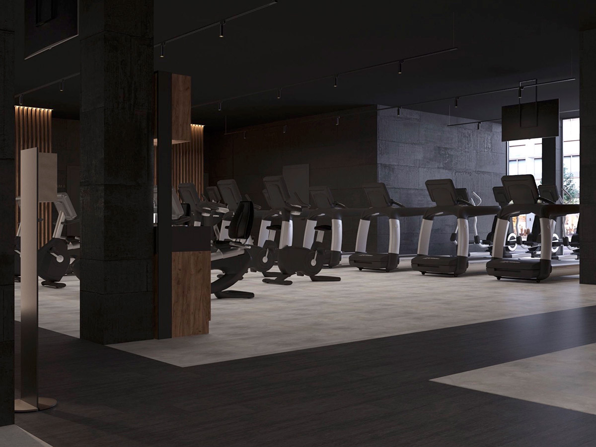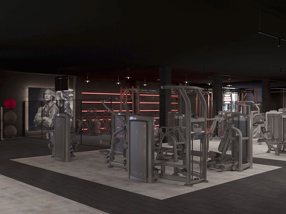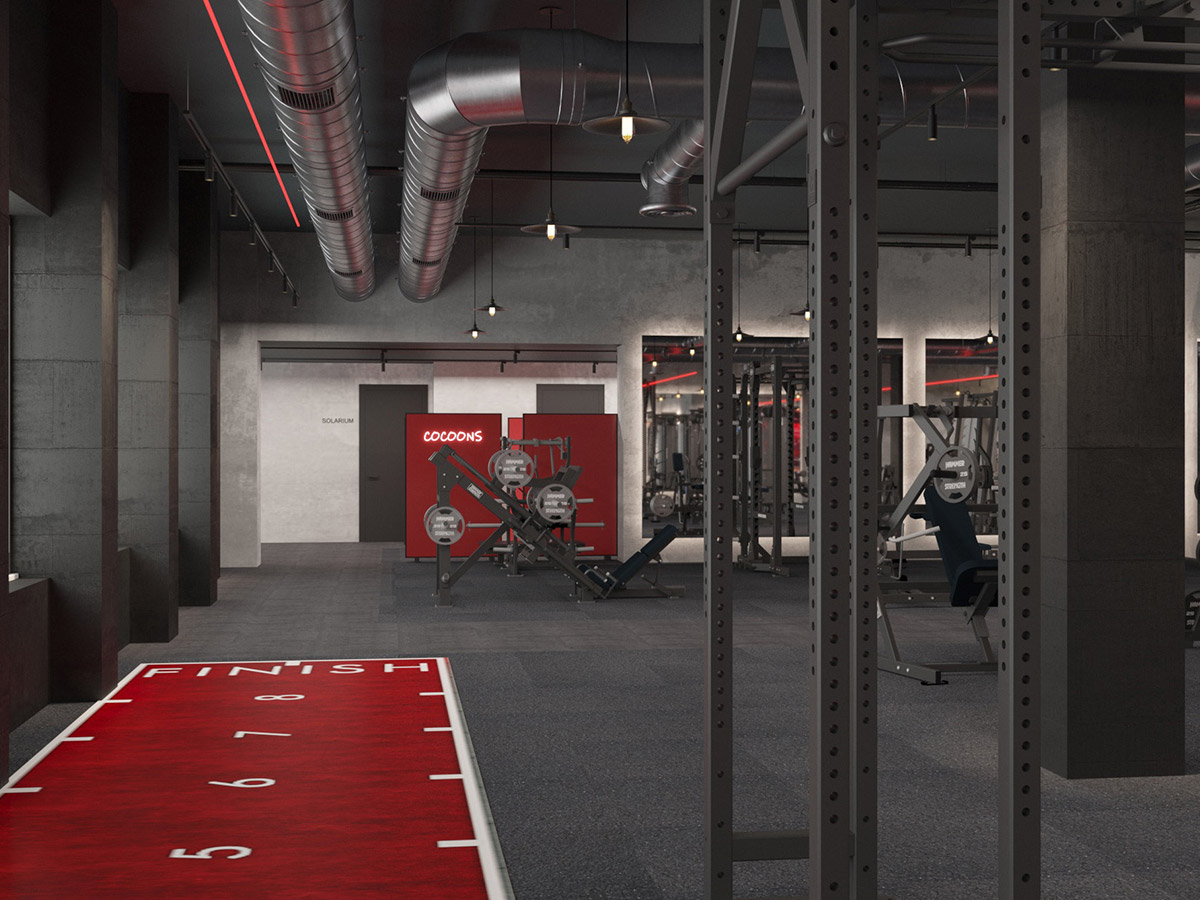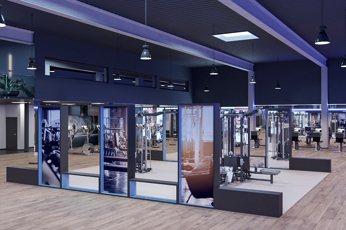 Die versteckten Lichtquellen und freischwebenden Lampen tragen zum industriellen Ambiente bei. Die Trainings Flächen sind umgeben von großen Spiegeln, die den Raum größer wirken lassen, und durch helle Böden visuell abgegrenzt.