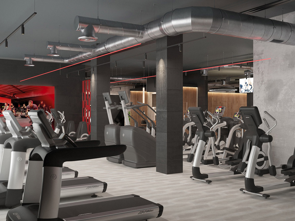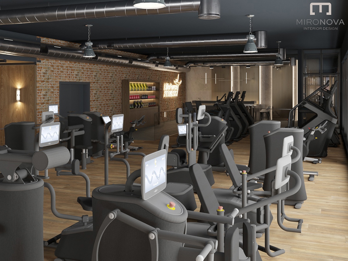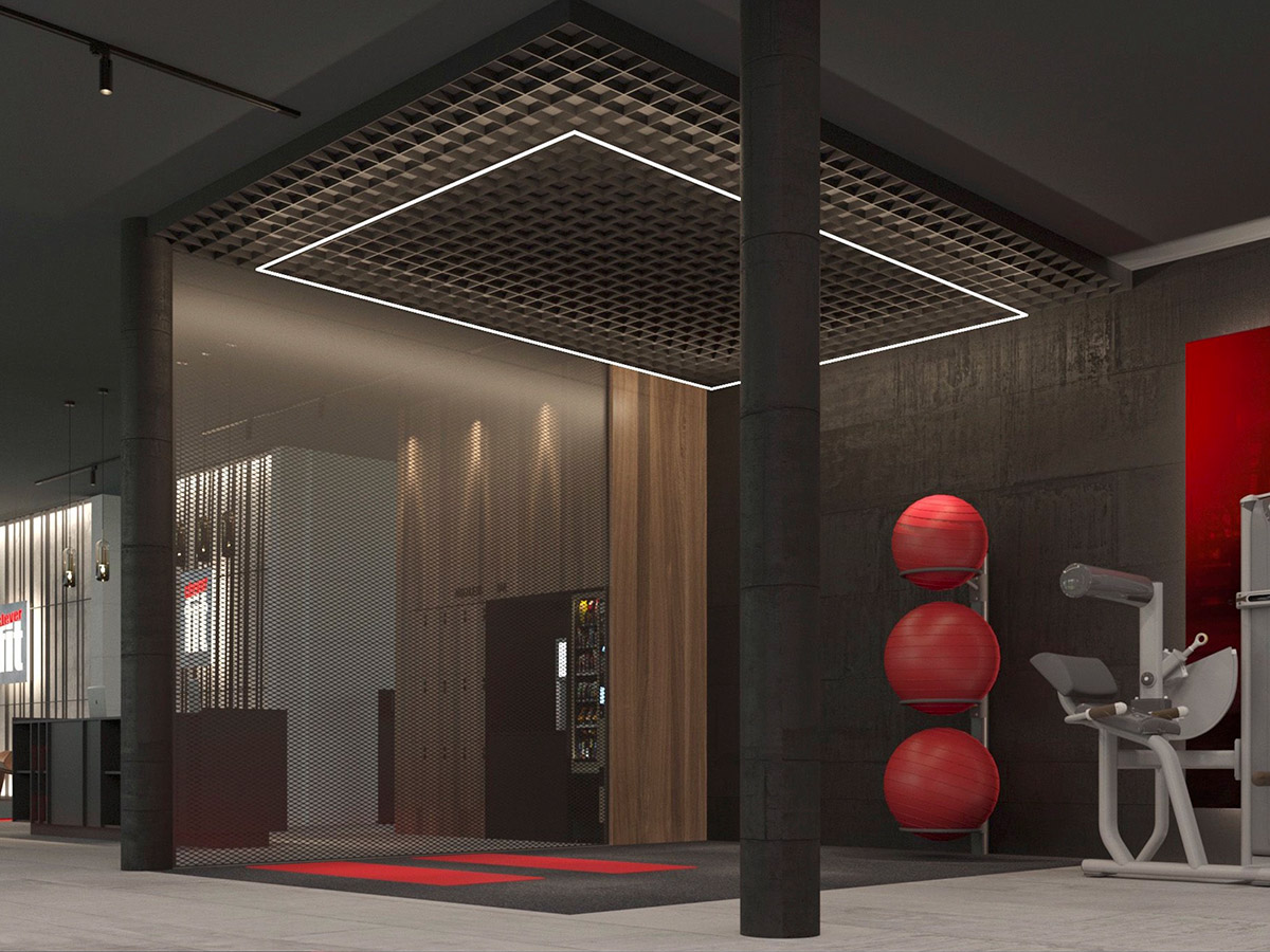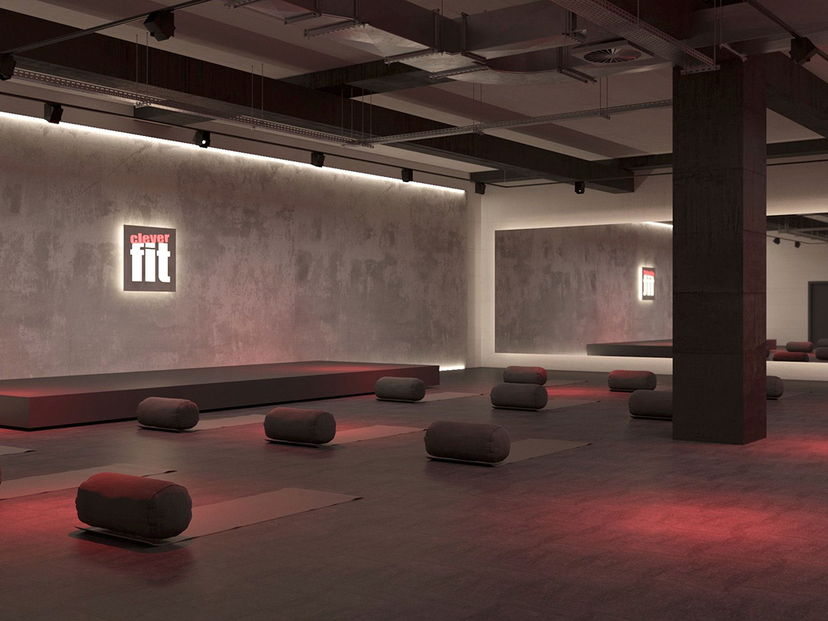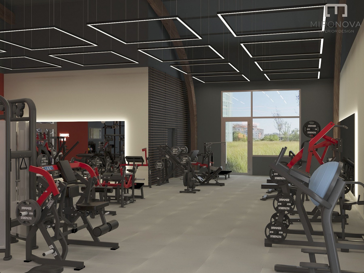 Die versteckten Lichtquellen und freischwebenden Lampen tragen zum industriellen Ambiente bei. Die Trainings Flächen sind umgeben von großen Spiegeln, die den Raum größer wirken lassen, und durch helle Böden visuell abgegrenzt.
