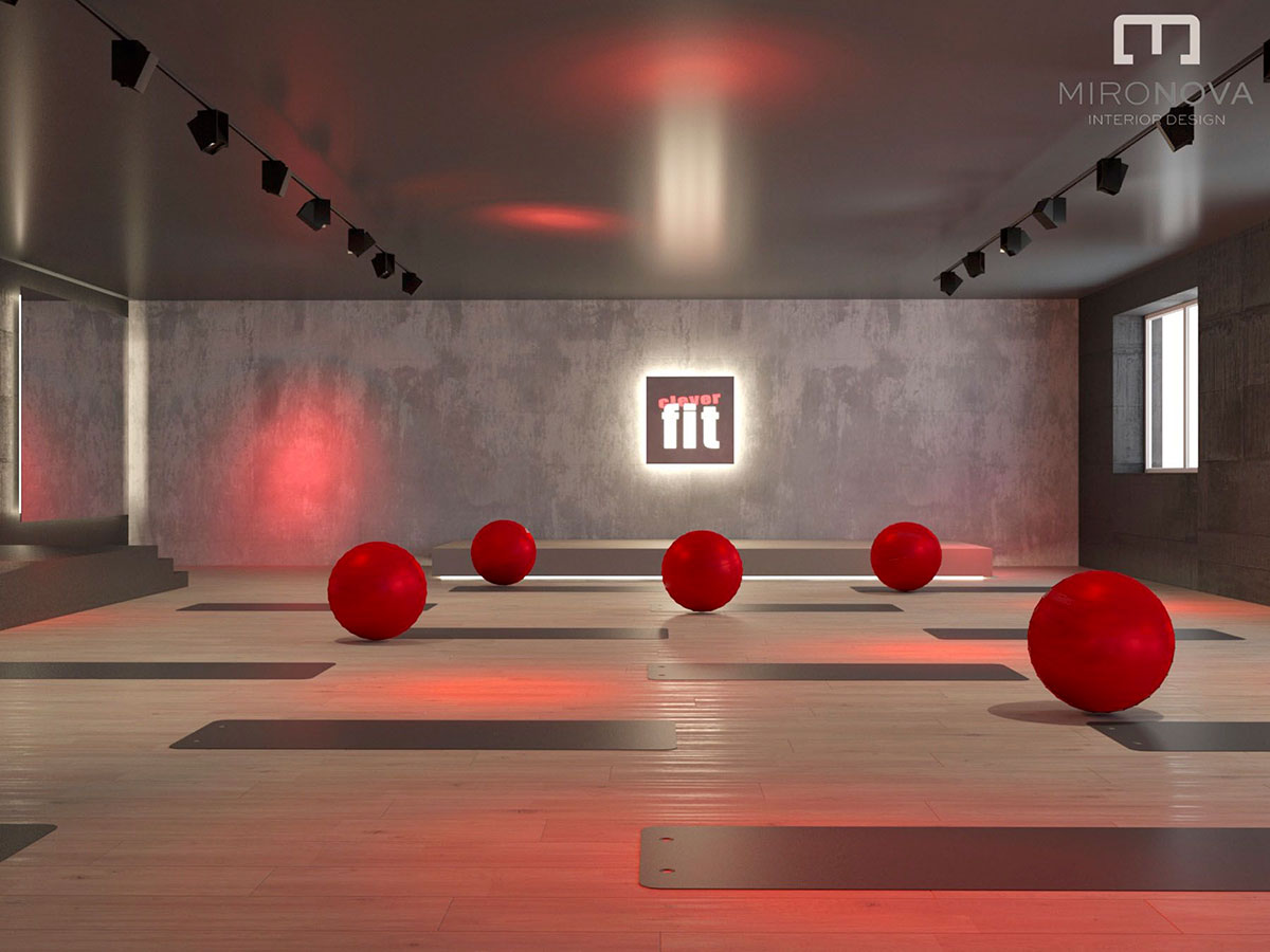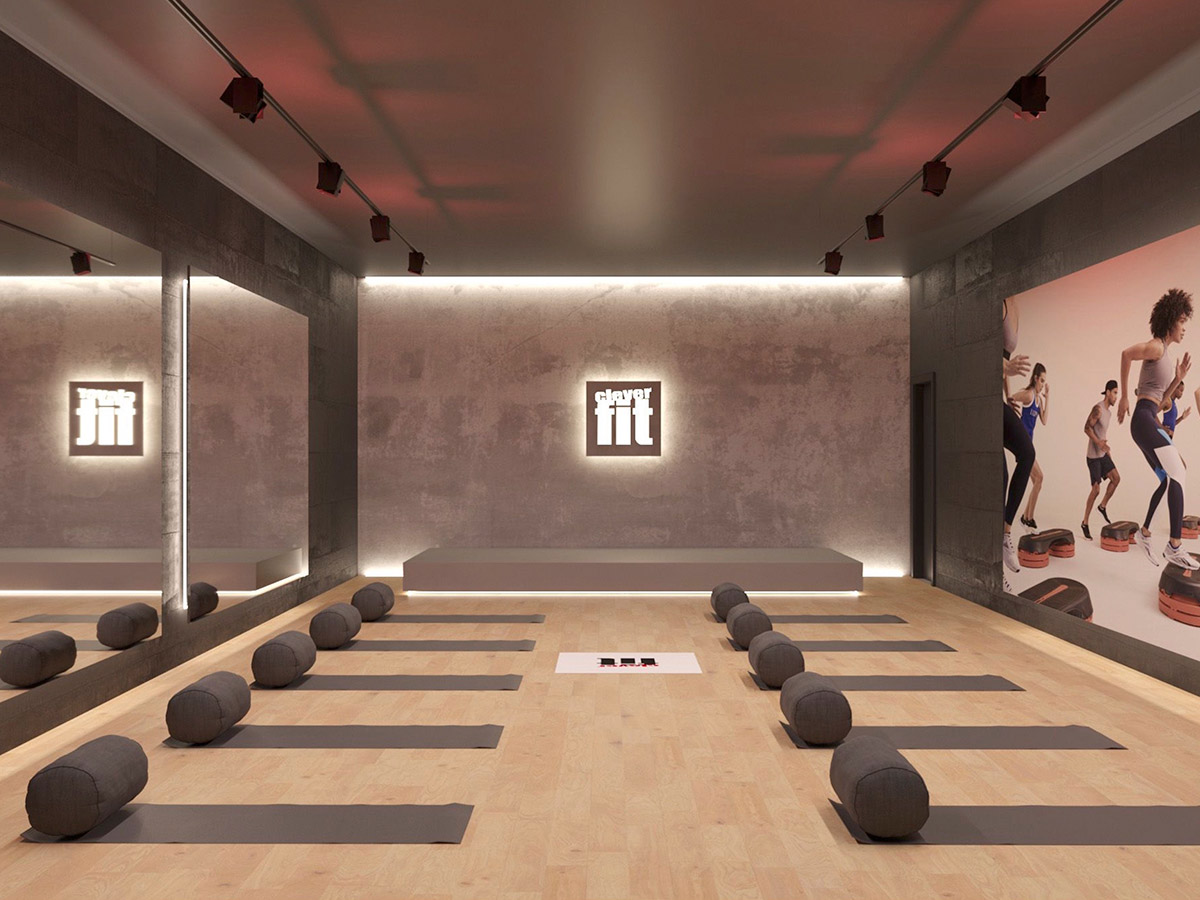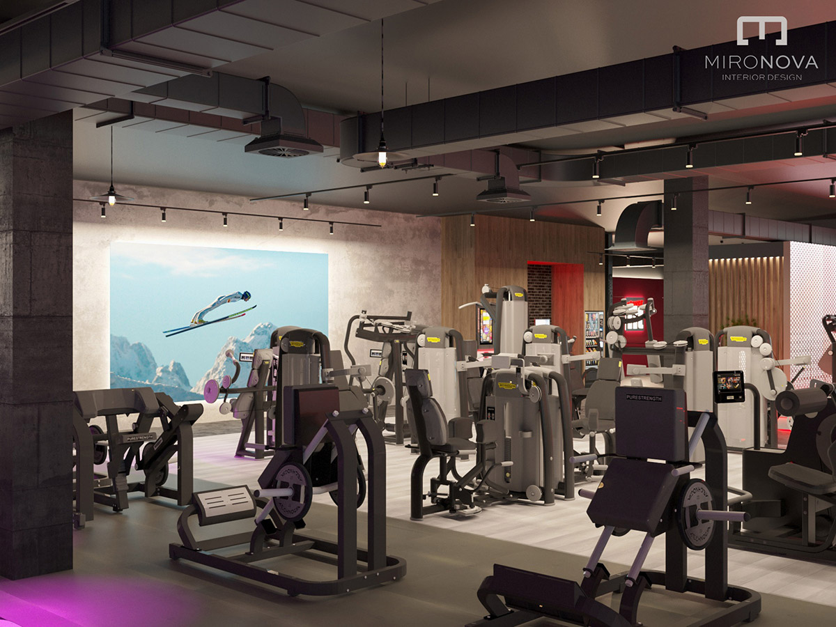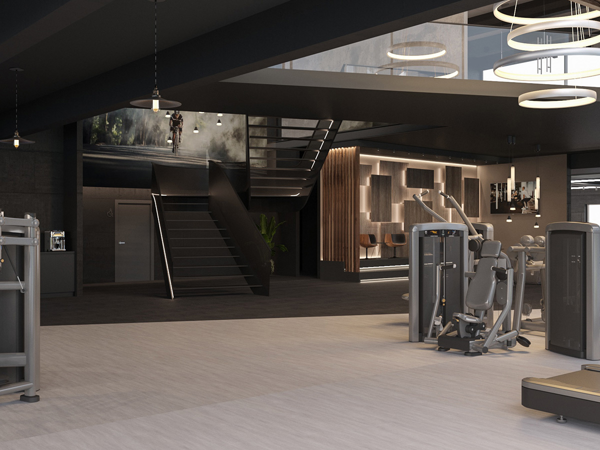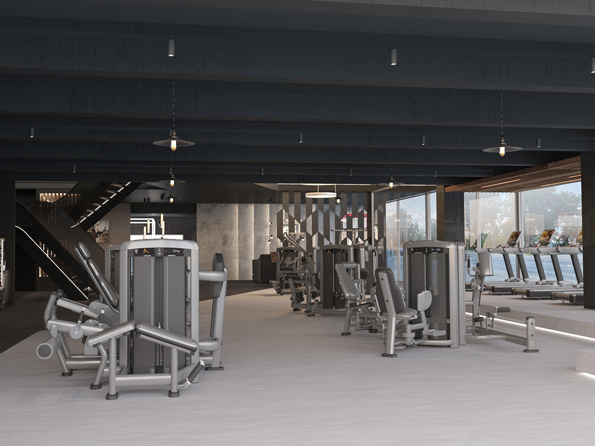 Die versteckten Lichtquellen und freischwebenden Lampen tragen zum industriellen Ambiente bei. Die Trainings Flächen sind umgeben von großen Spiegeln, die den Raum größer wirken lassen, und durch helle Böden visuell abgegrenzt.