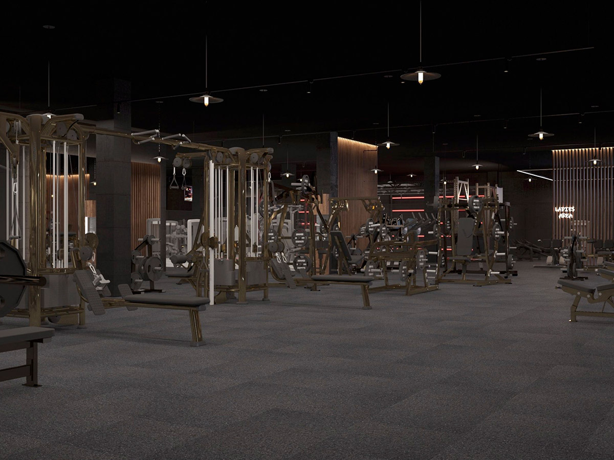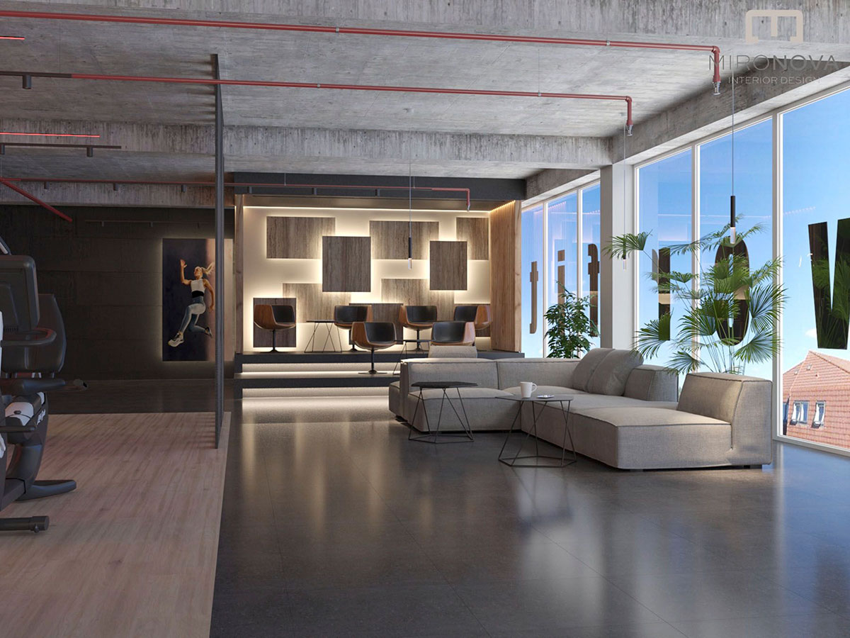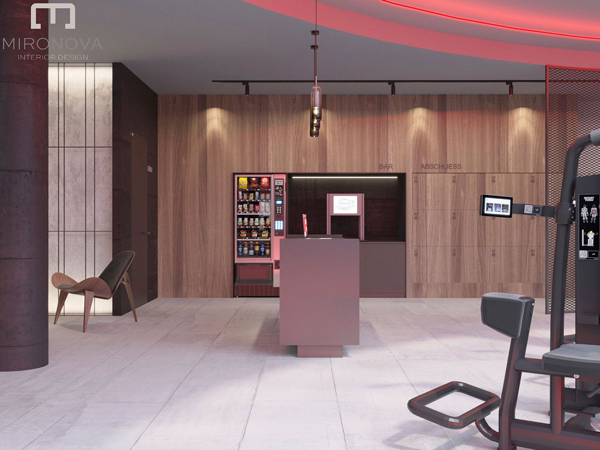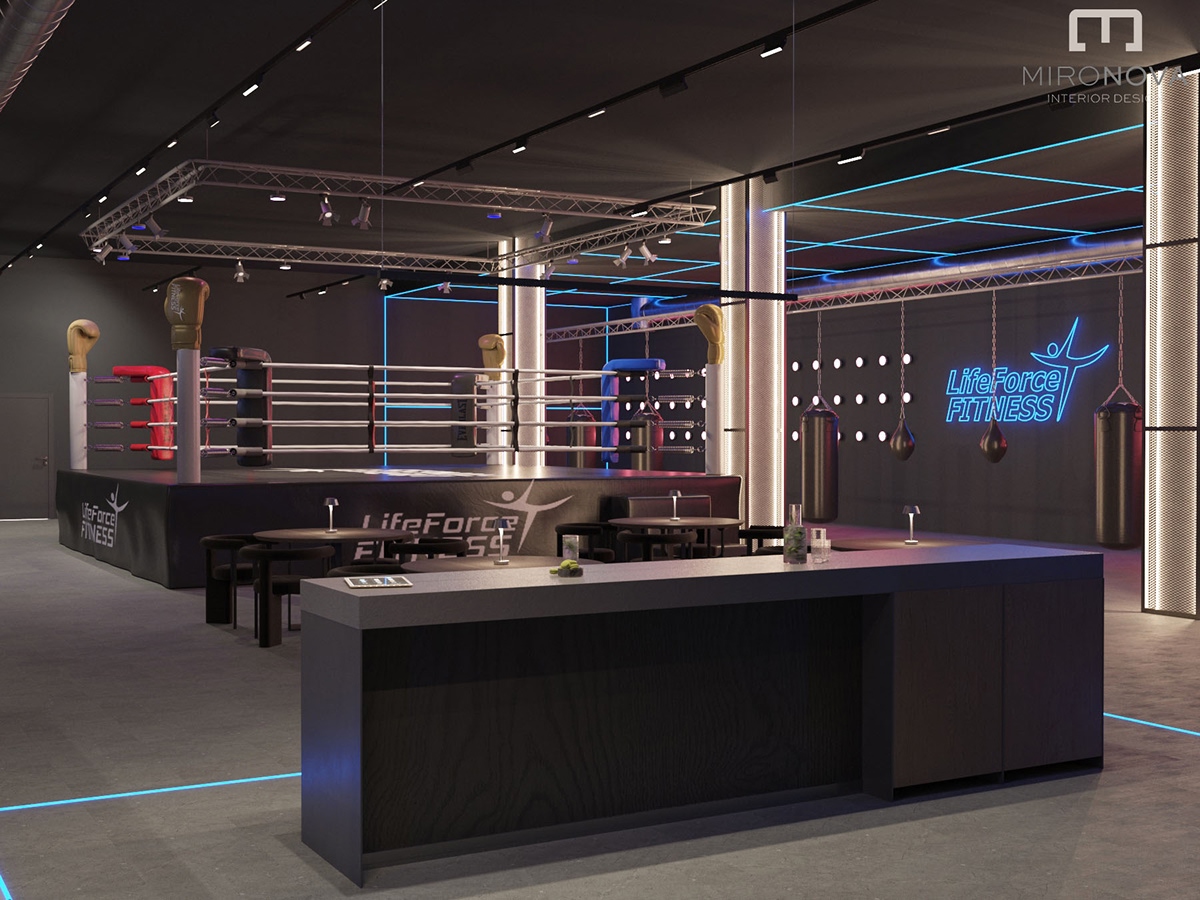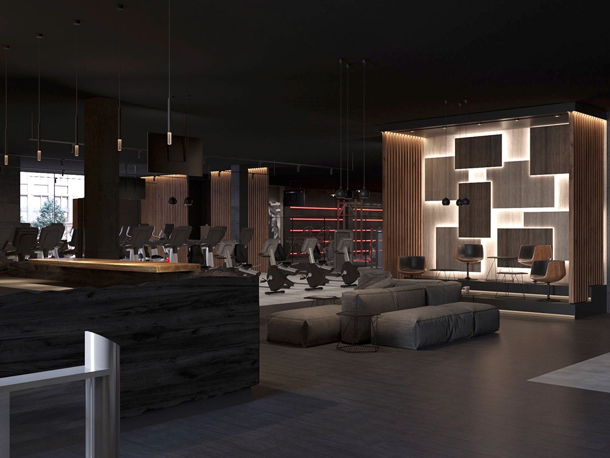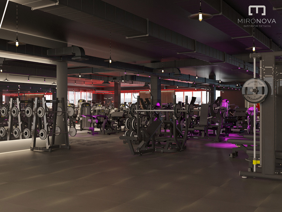 Die versteckten Lichtquellen und freischwebenden Lampen tragen zum industriellen Ambiente bei. Die Trainings Flächen sind umgeben von großen Spiegeln, die den Raum größer wirken lassen, und durch helle Böden visuell abgegrenzt.