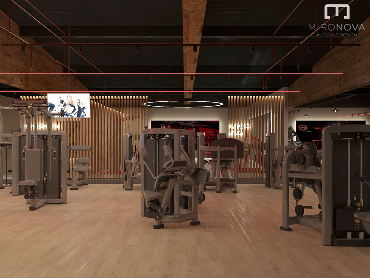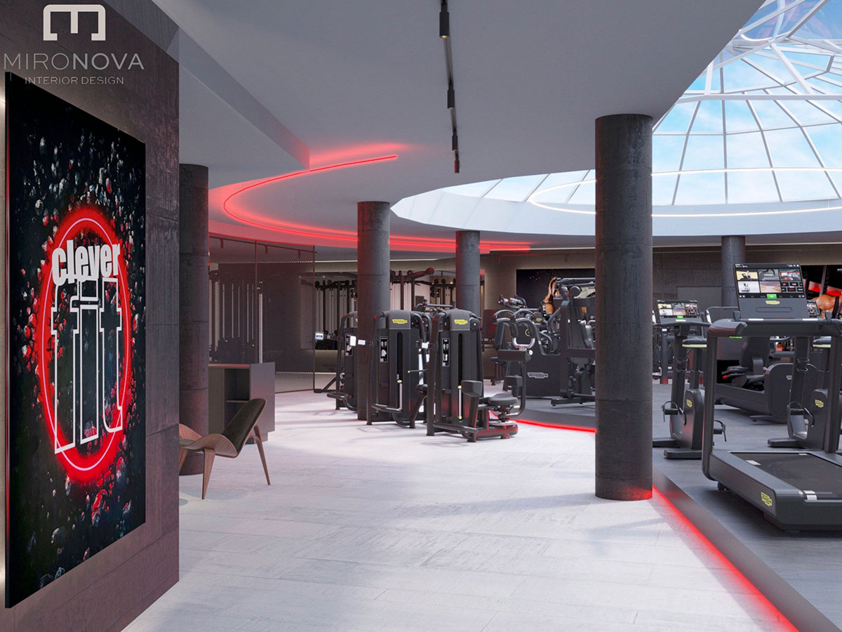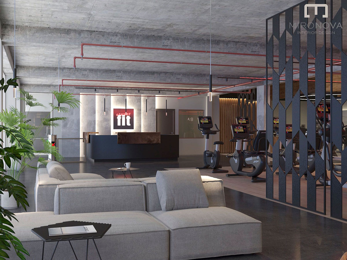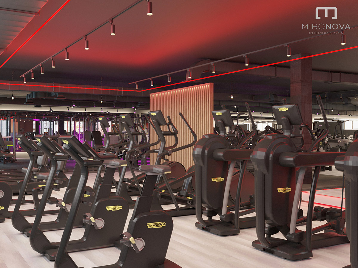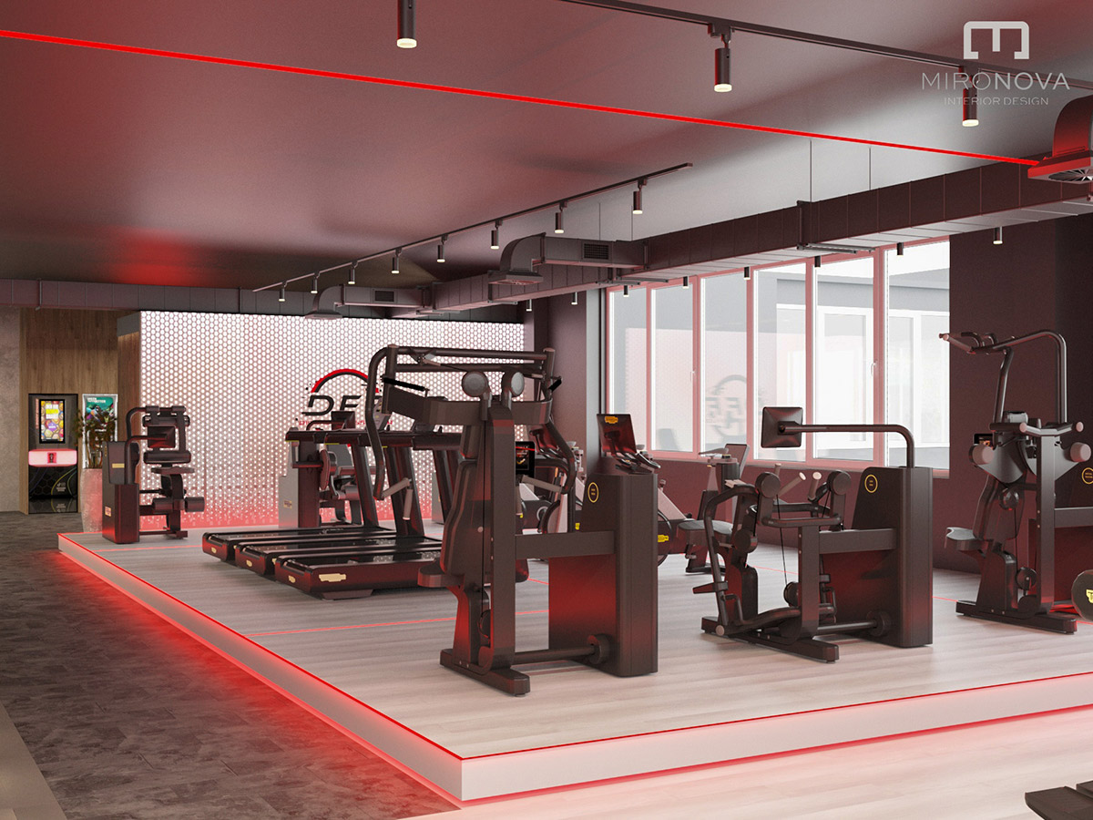 Die versteckten Lichtquellen und freischwebenden Lampen tragen zum industriellen Ambiente bei. Die Trainings Flächen sind umgeben von großen Spiegeln, die den Raum größer wirken lassen, und durch helle Böden visuell abgegrenzt.