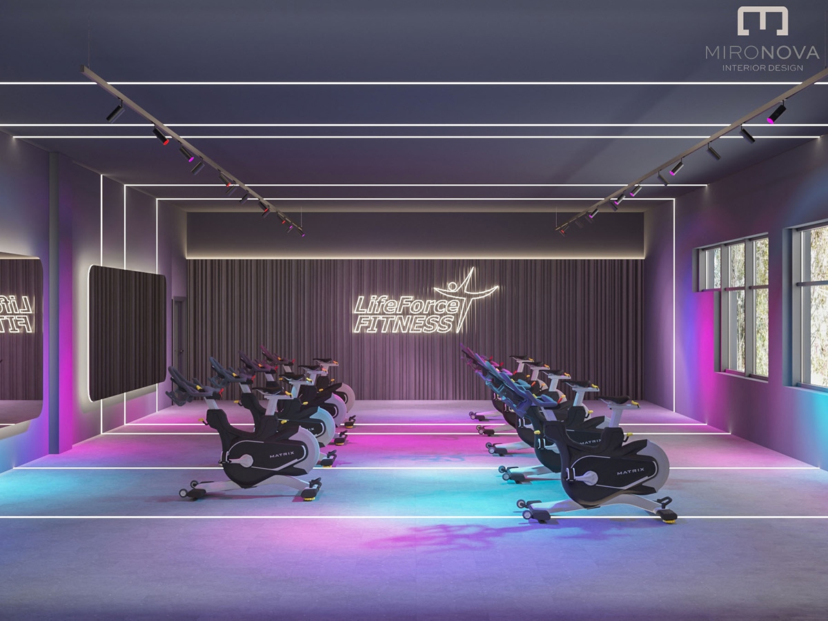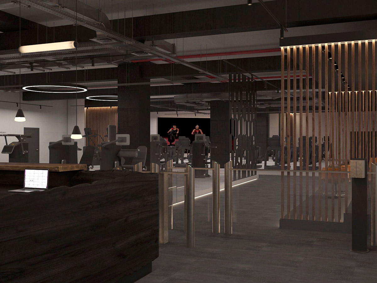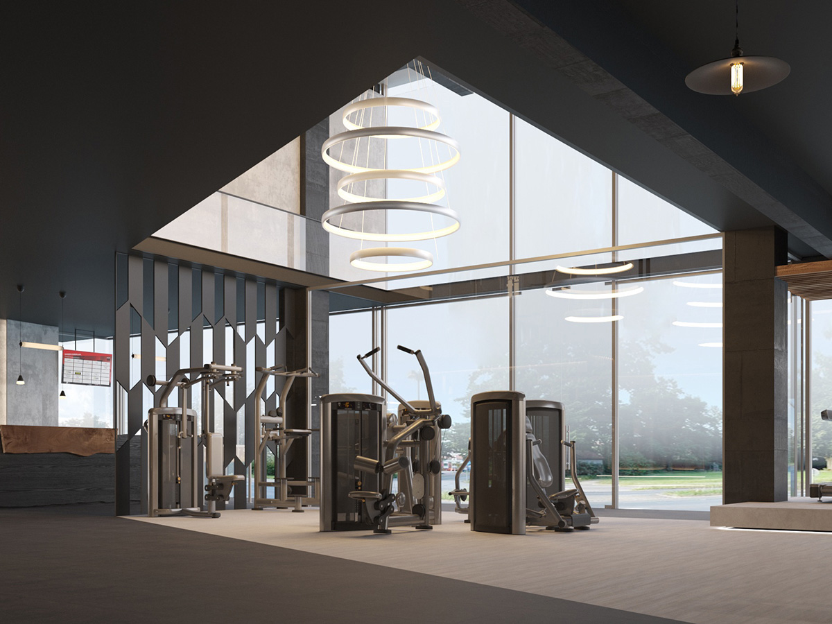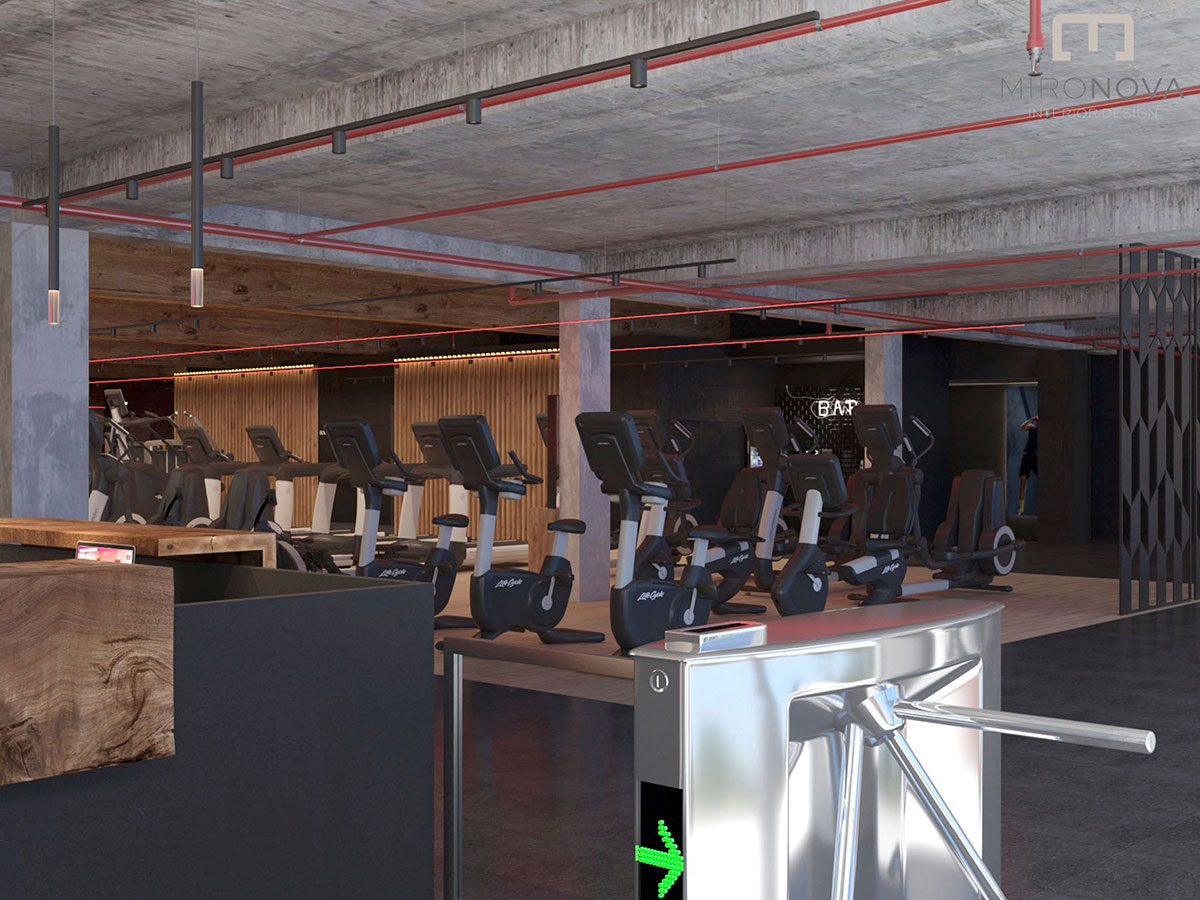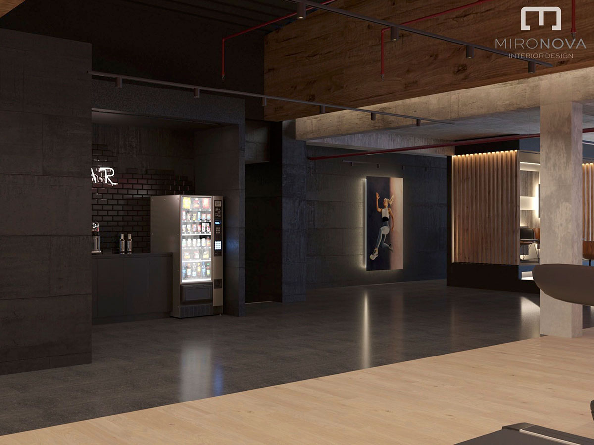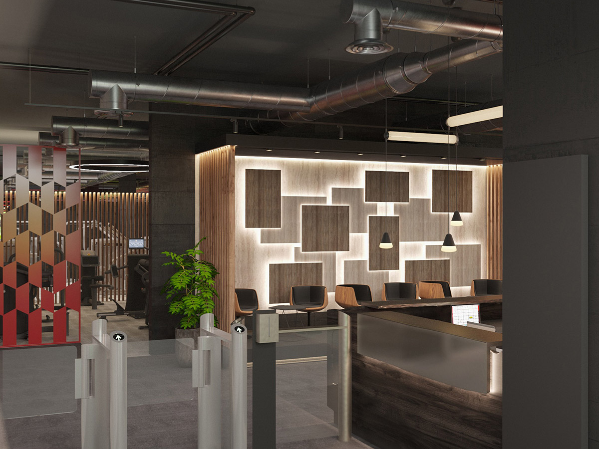 Die versteckten Lichtquellen und freischwebenden Lampen tragen zum industriellen Ambiente bei. Die Trainings Flächen sind umgeben von großen Spiegeln, die den Raum größer wirken lassen, und durch helle Böden visuell abgegrenzt.