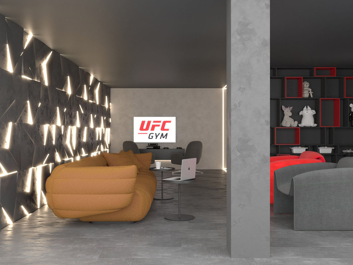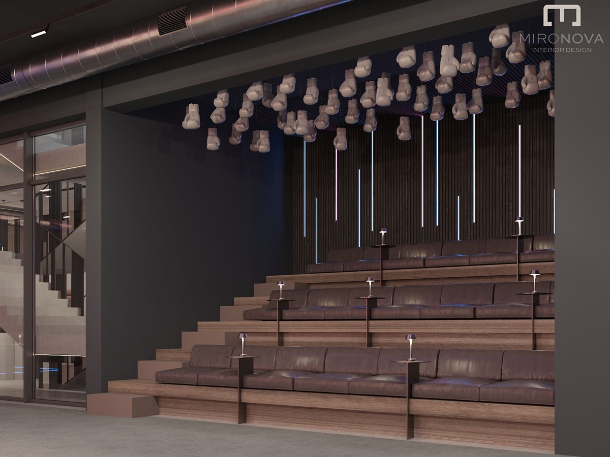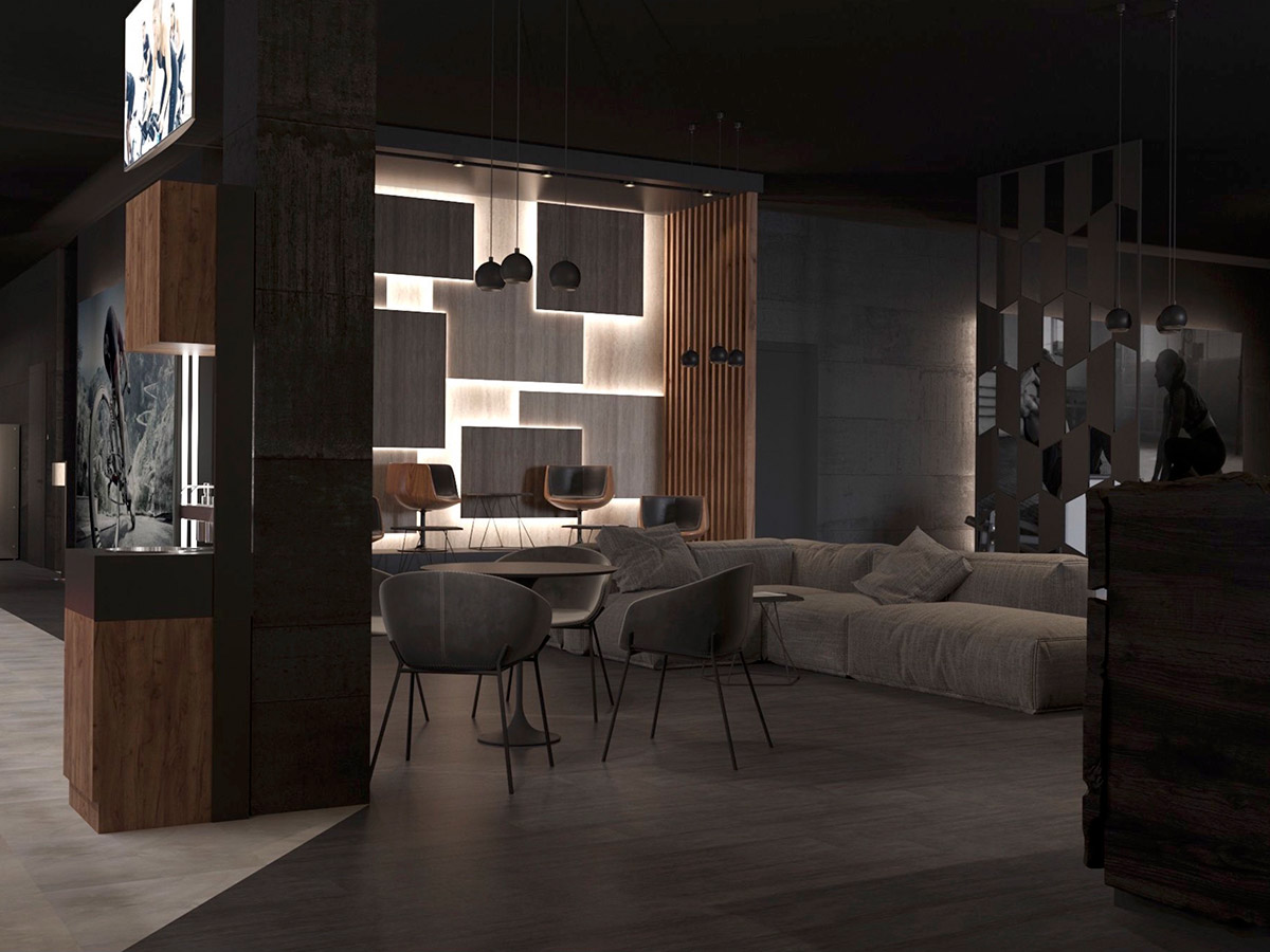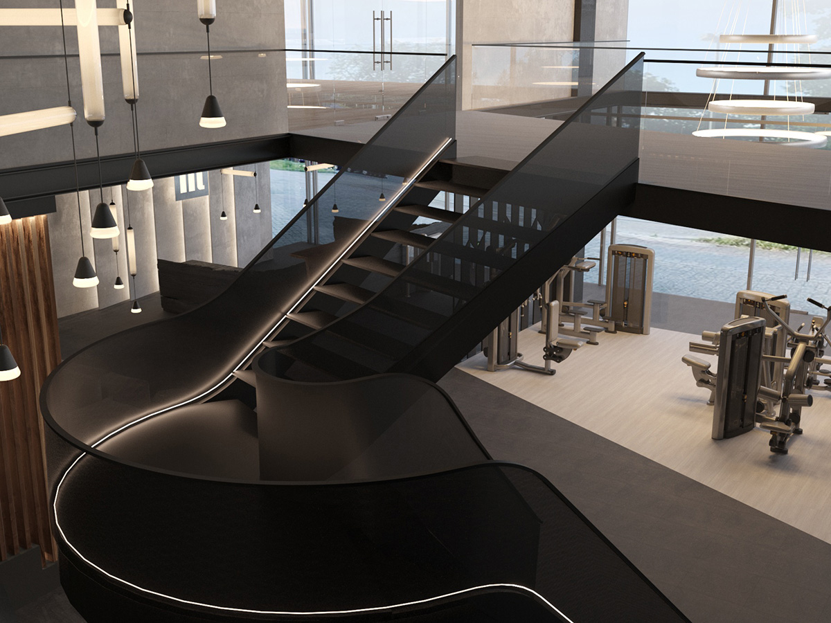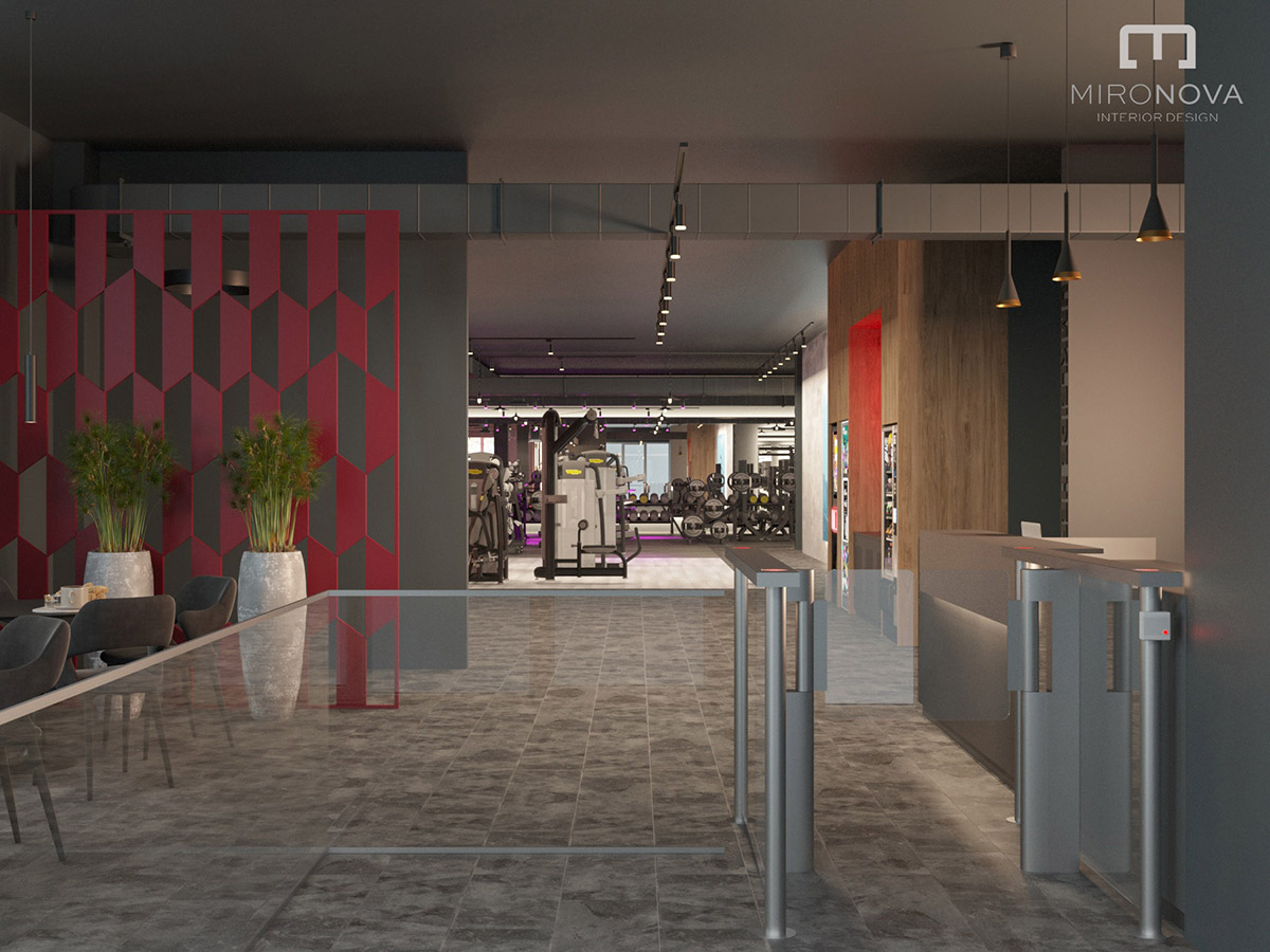 Die versteckten Lichtquellen und freischwebenden Lampen tragen zum industriellen Ambiente bei. Die Trainings Flächen sind umgeben von großen Spiegeln, die den Raum größer wirken lassen, und durch helle Böden visuell abgegrenzt.