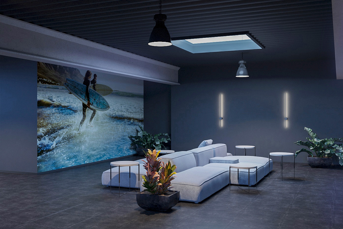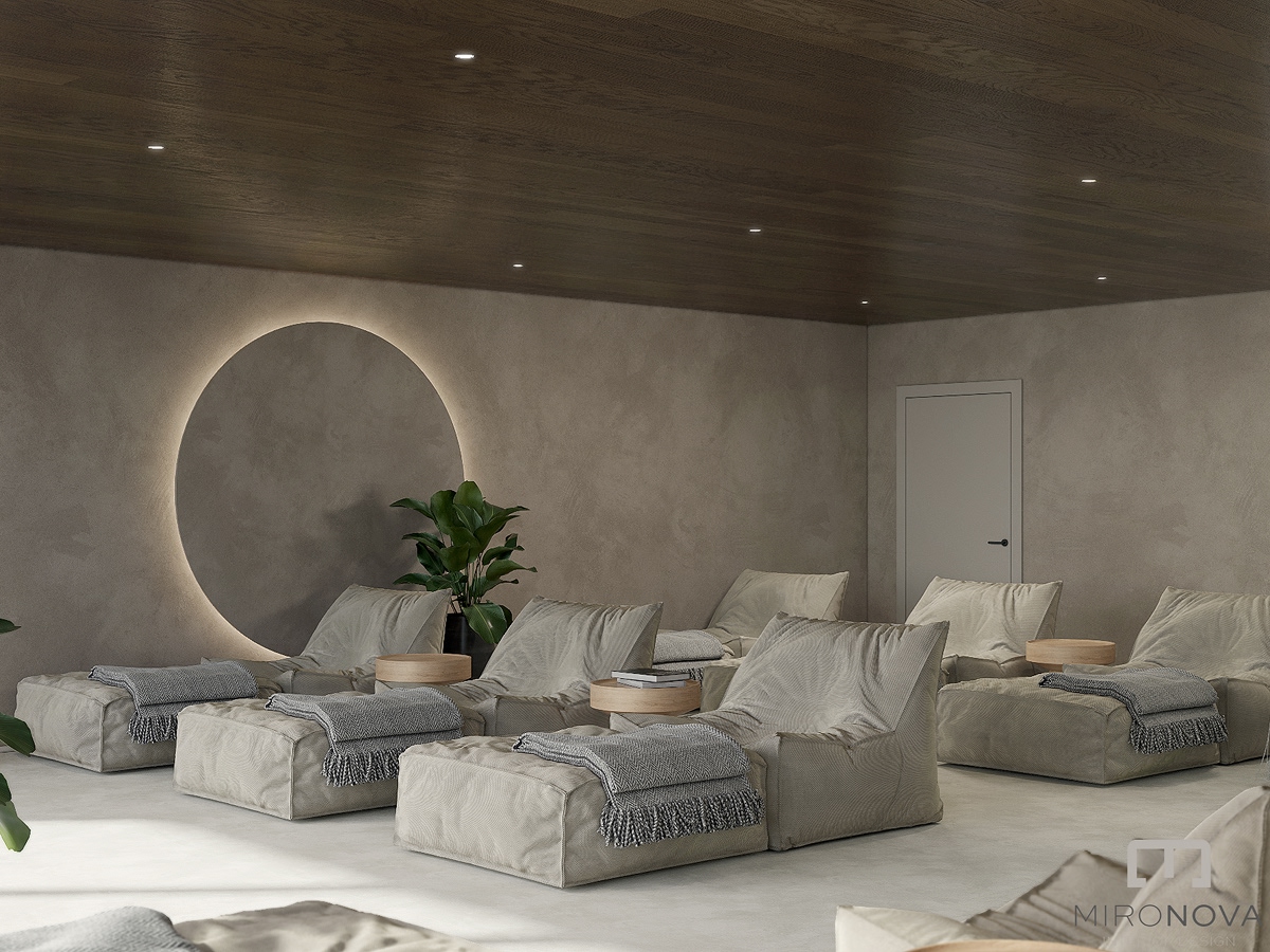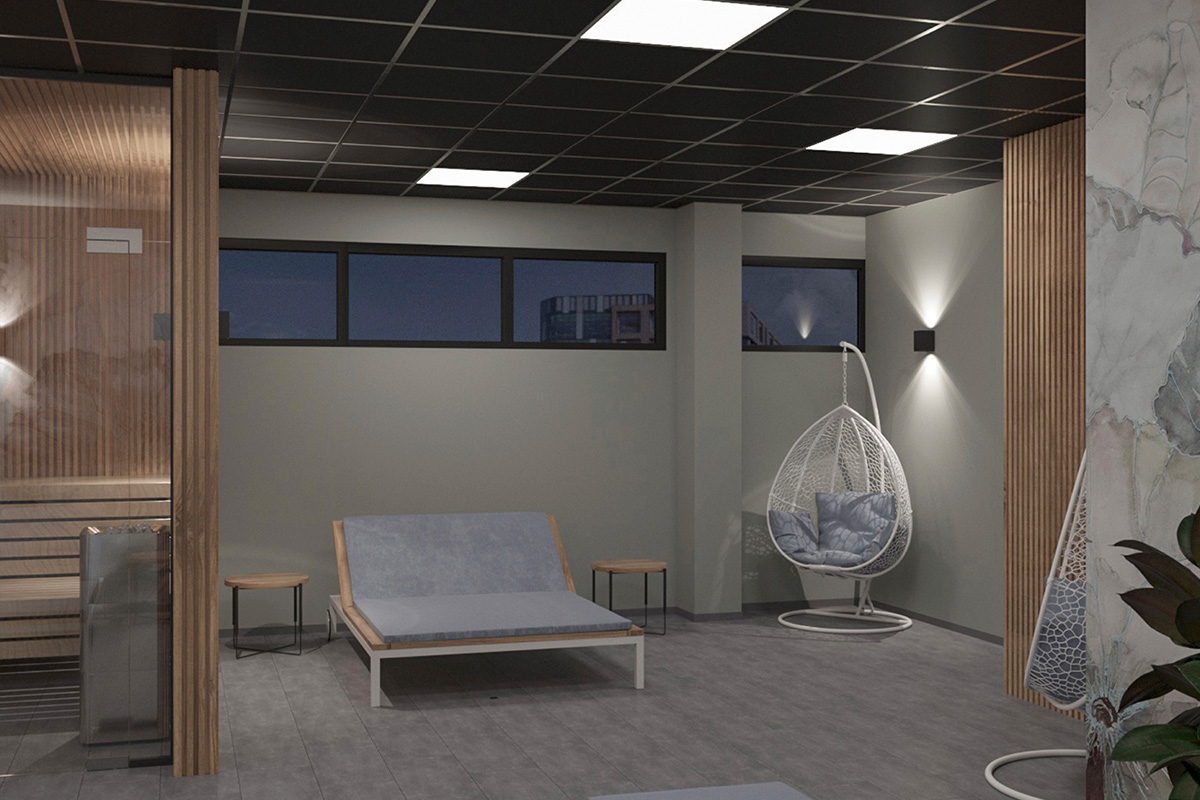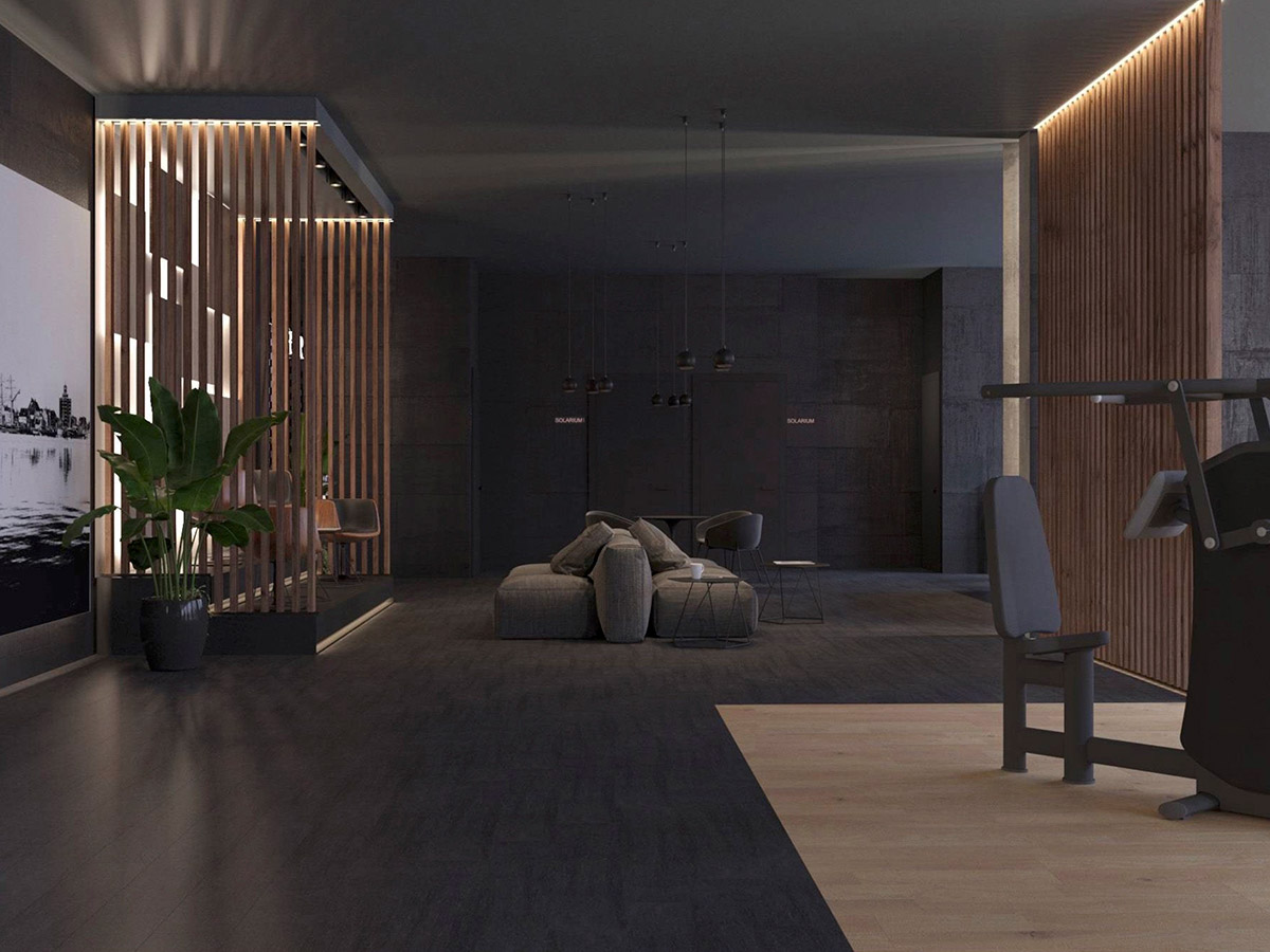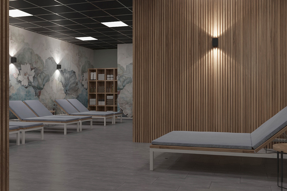 Im Erdgeschoss befinden sich neben dem Fitnessbereich auch die Umkleidekabinen und die Sauna. An den Wänden und der Decke des Ruhebereiches sind Holzlamellen befestigt, in denen Lichtstreifen eingelassen sind. Auch hier bietet die Lampe einen Eye-Catcher: aus Aluminium-Materialien hergestellt, schafft die Lampe durch das verchromte Metall eine Verbindung zu den Stein- und Holzwänden. Dadurch entsteht eine dynamische und entspannende Raumatmosphäre.