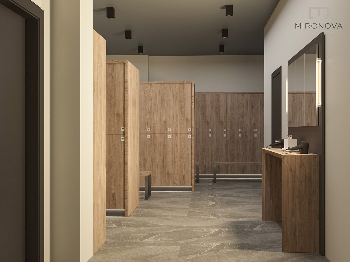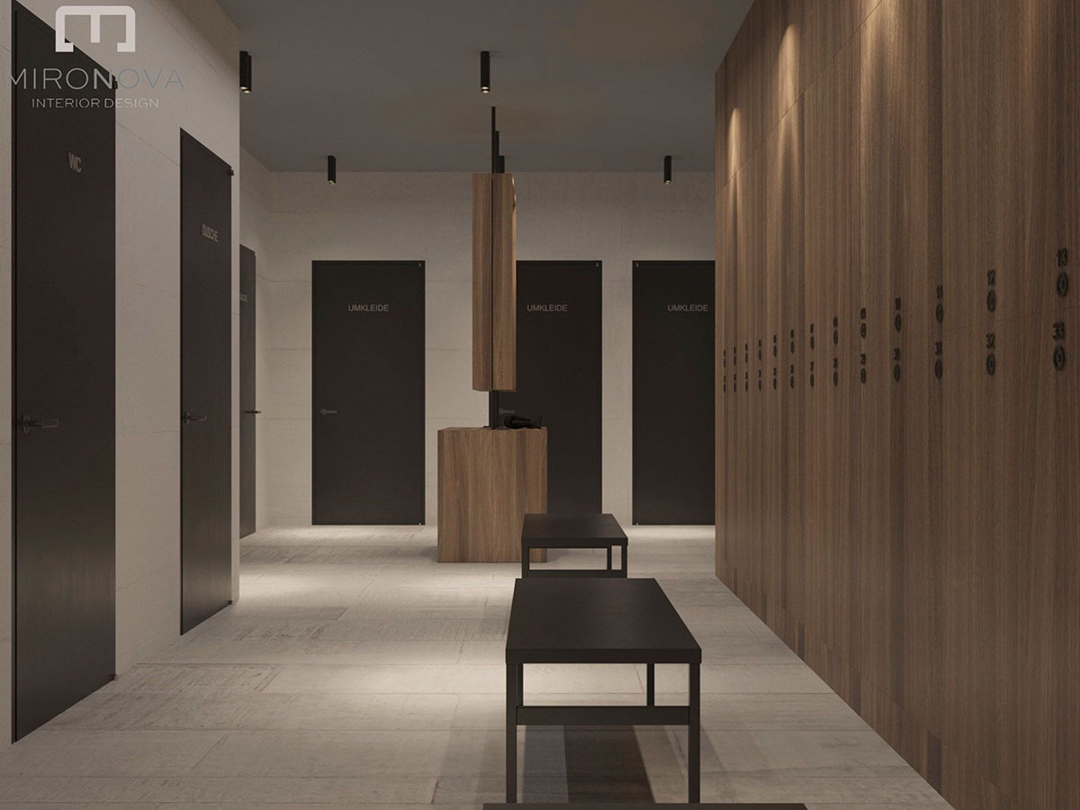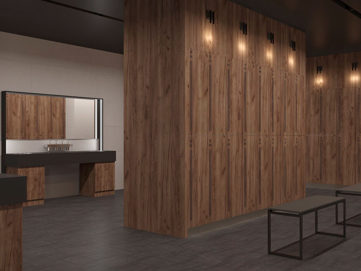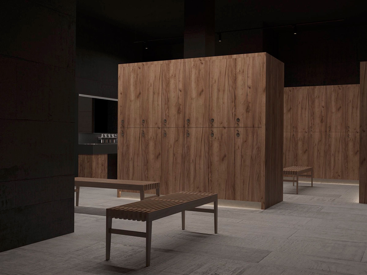 Die Umkleiden nehmen ebenfalls das Holz-Licht-Design auf. Die Holzoberflächen der Schränke werden durch die hellen Wände und Böden und die vielen Lampen aufgelockert.