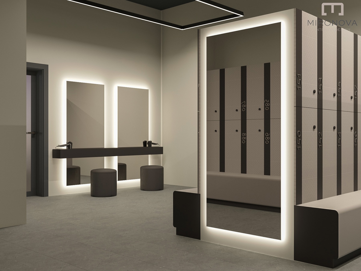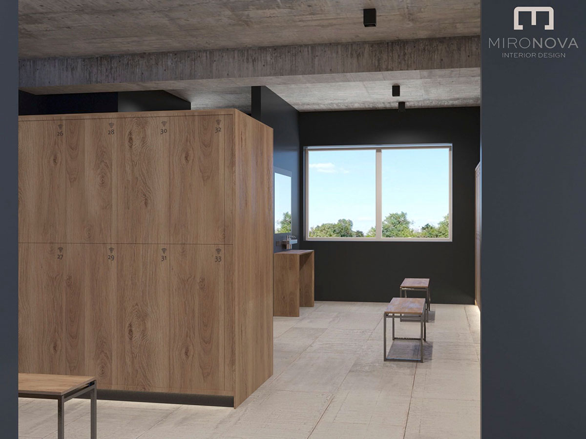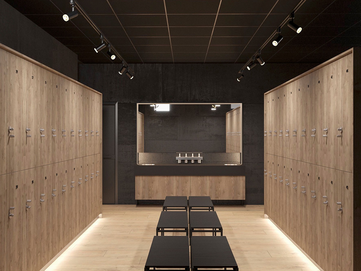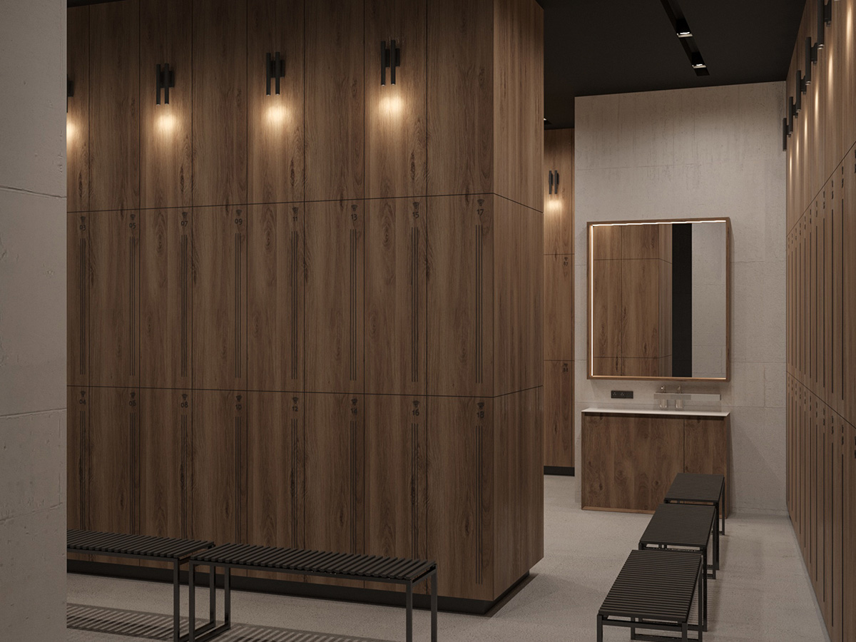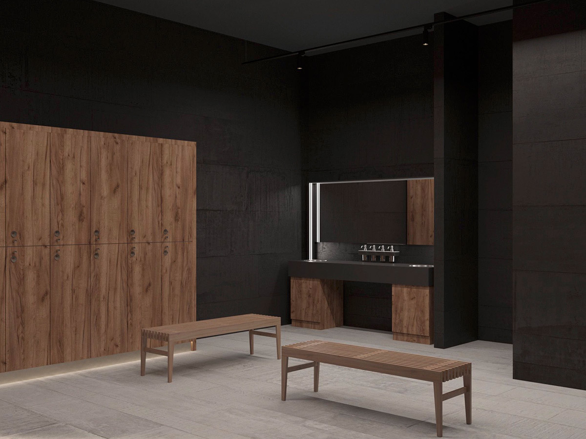 Die Umkleiden nehmen ebenfalls das Holz-Licht-Design auf. Die Holzoberflächen der Schränke werden durch die hellen Wände und Böden und die vielen Lampen aufgelockert.