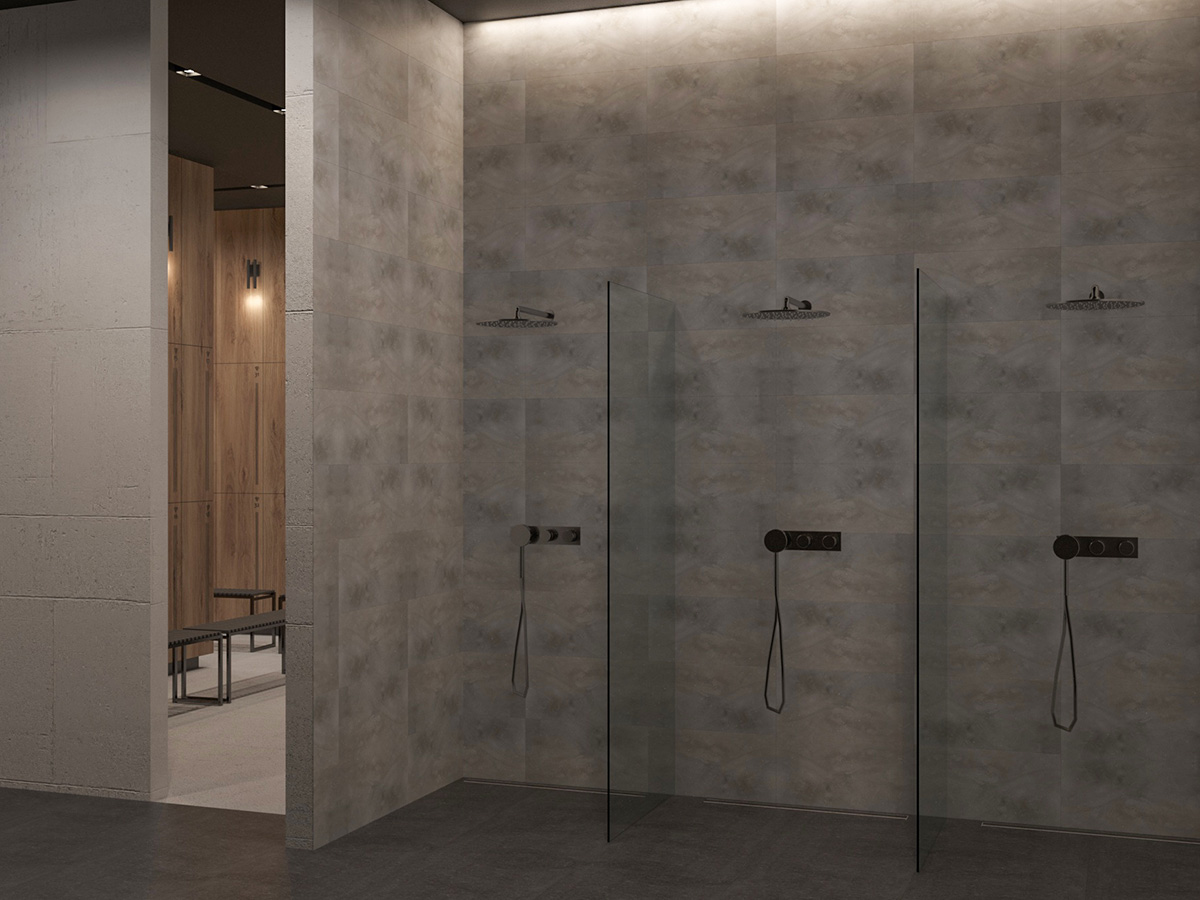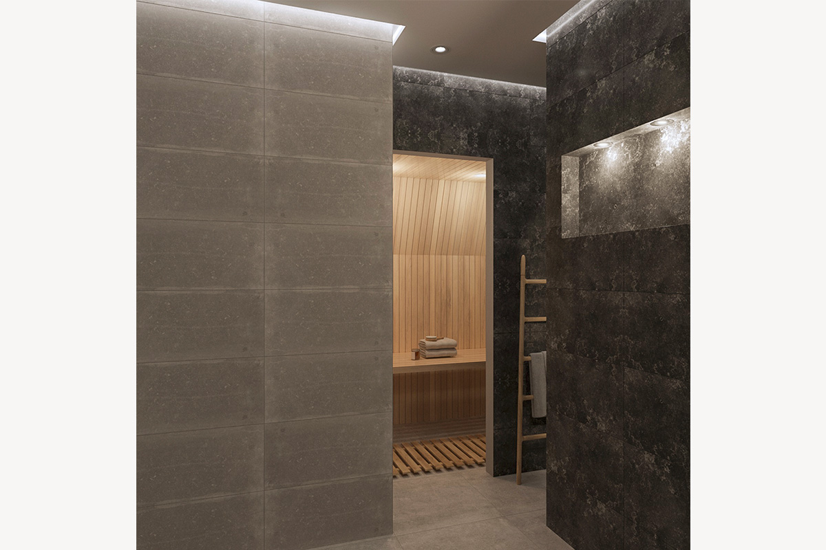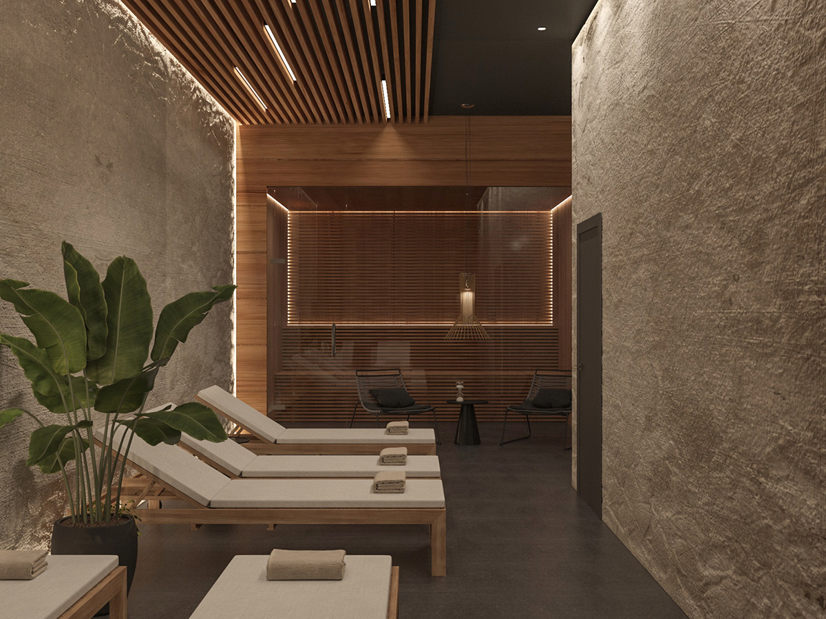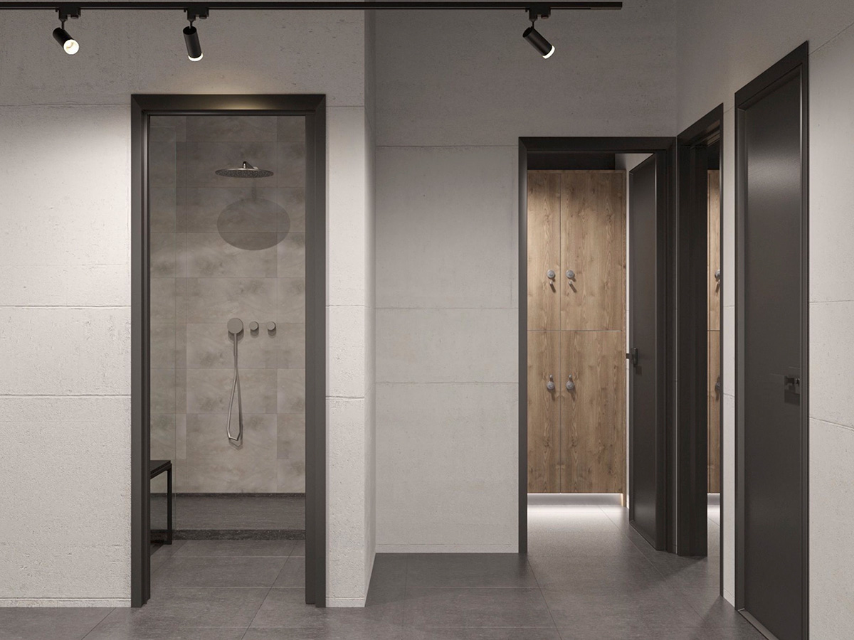Auch die Umkleidekabinen sowie der Sauna-Bereich sind schlicht konzipiert. Grau und Beige durchziehen die Räume und tragen, genau wie die eingelassenen Lampen, zur minimalistischen Kulisse bei.