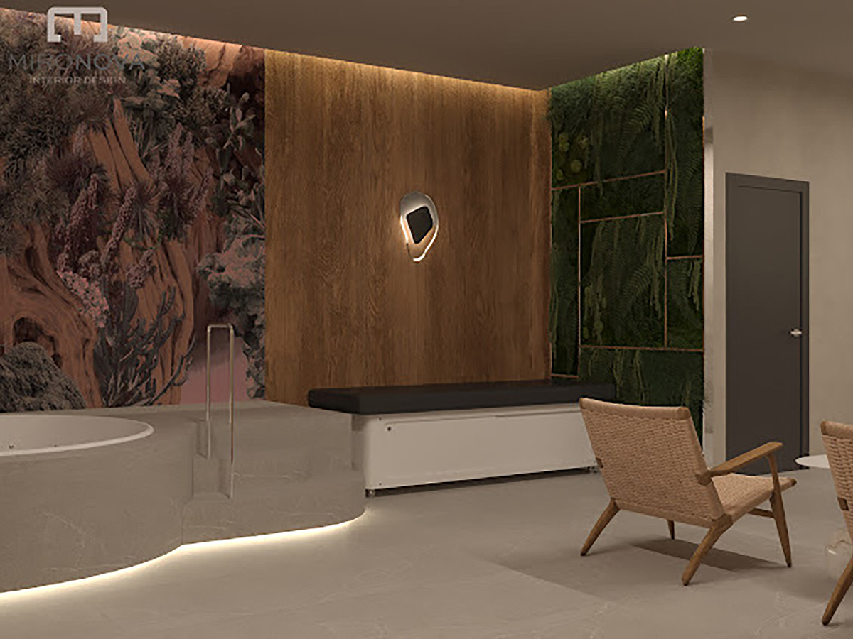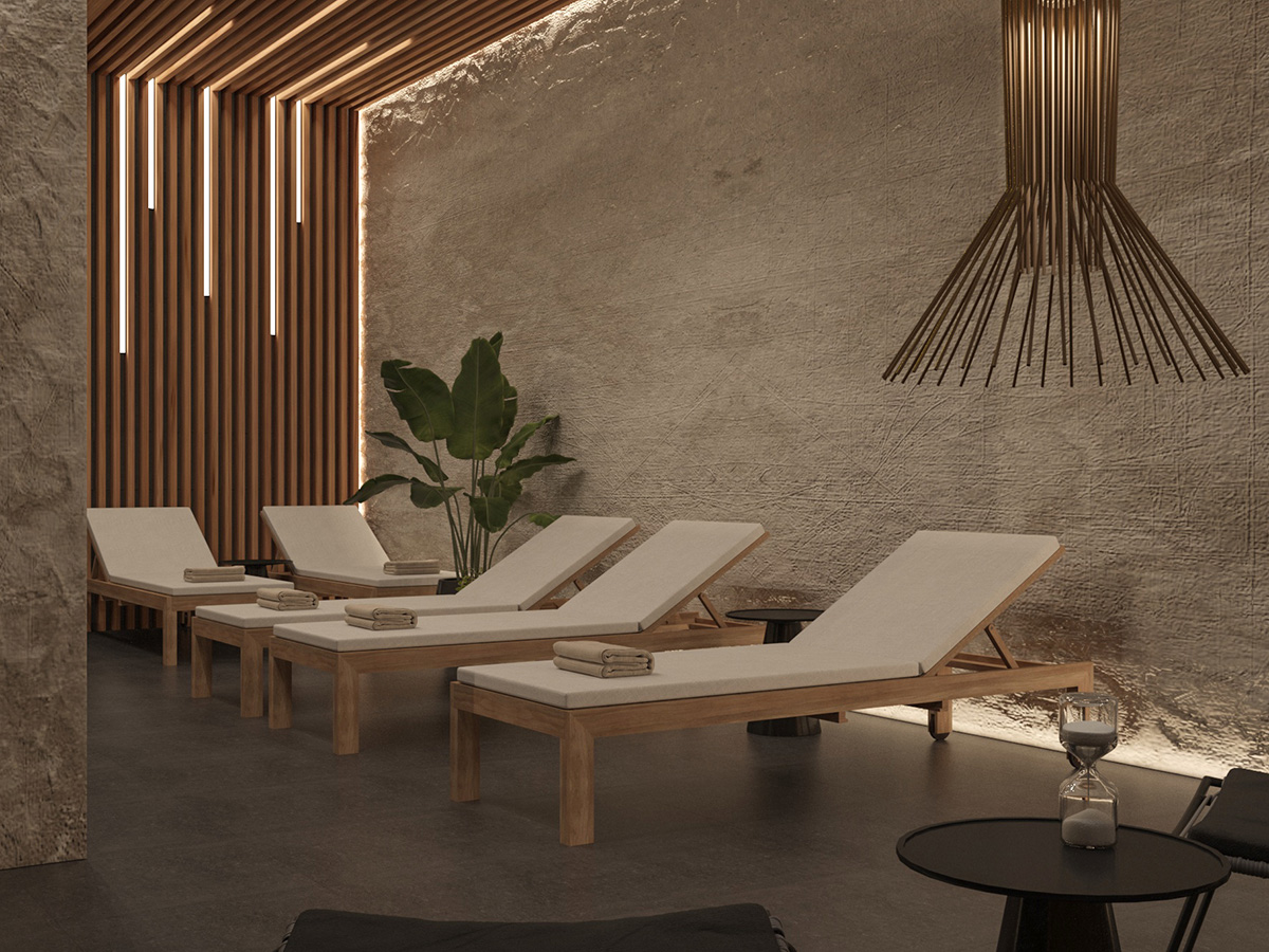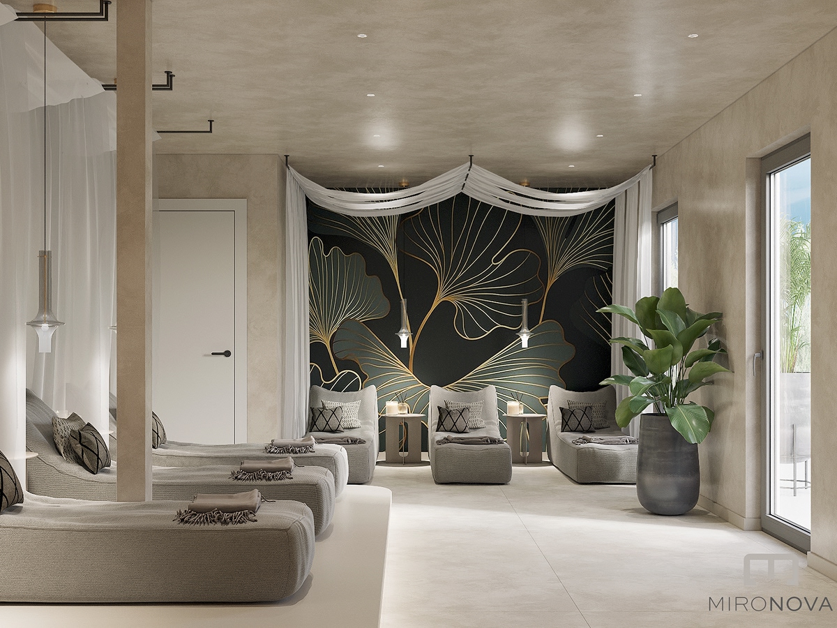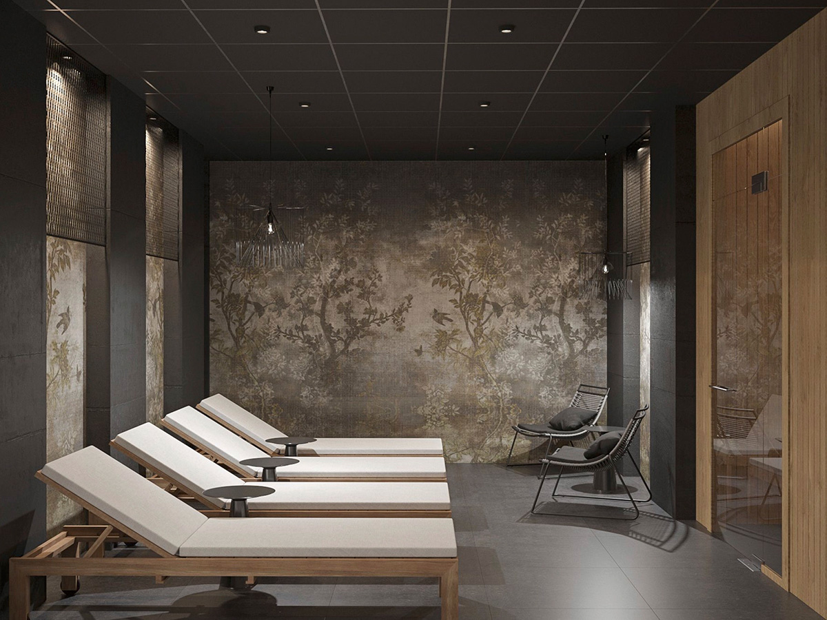 Im Saunabereich ist hervorzuheben, dass es für Männer und Frauen getrennte Räume gibt, die individuell gestaltet wurden. Der Saunabereich für Frauen wurde mit einem femininerem Touch designed. Die dunkelbraune Tapete schmiegt sich elegant an die Holz-Liegen und den dunklen Stein an.