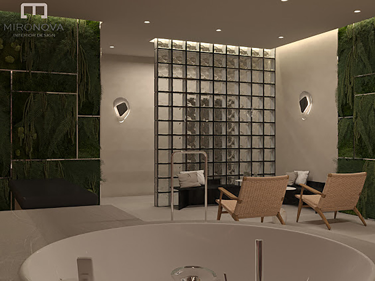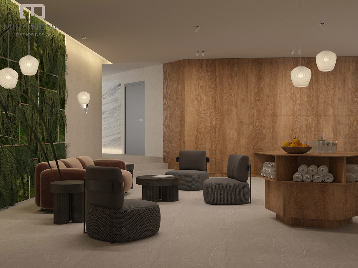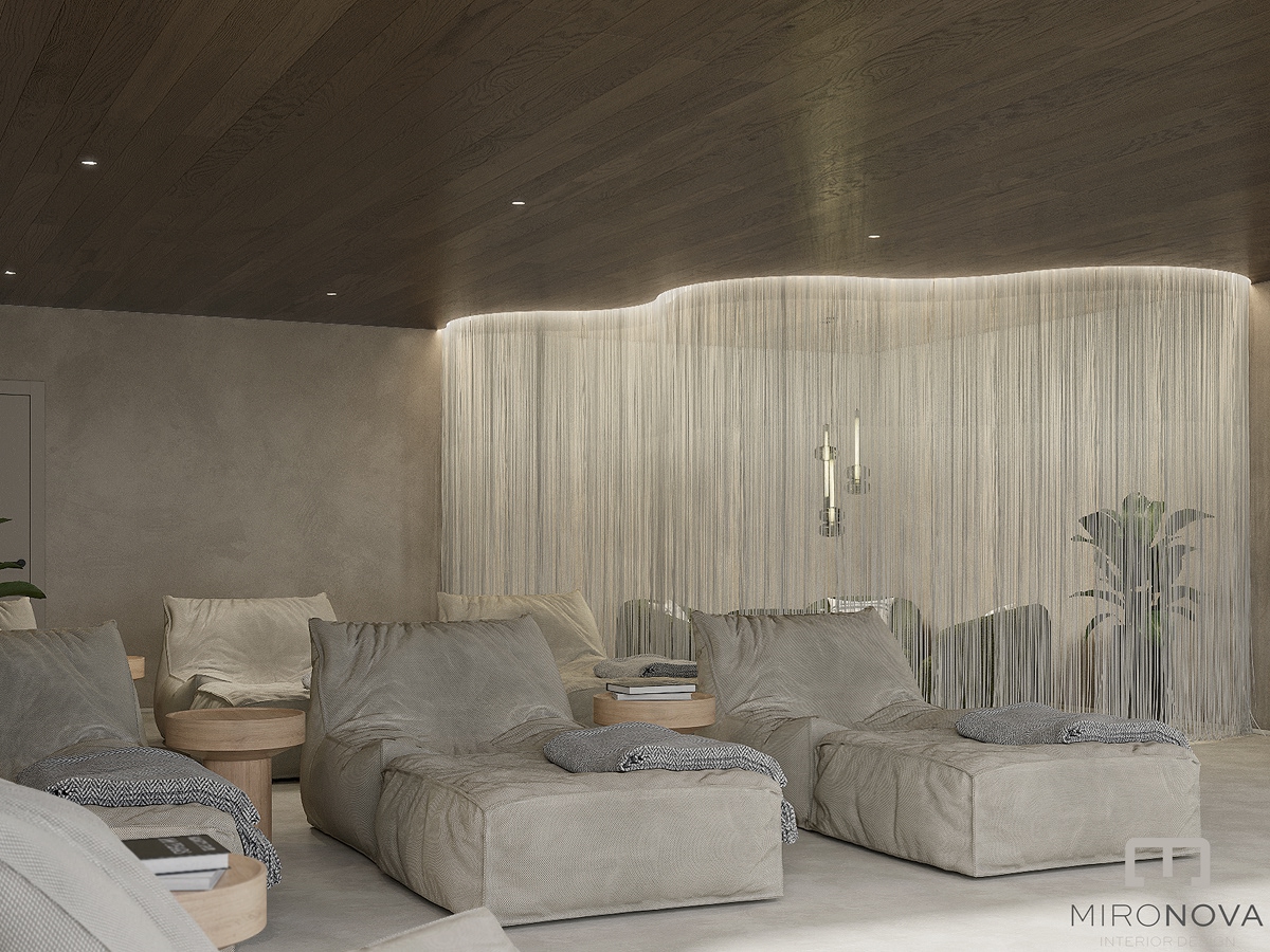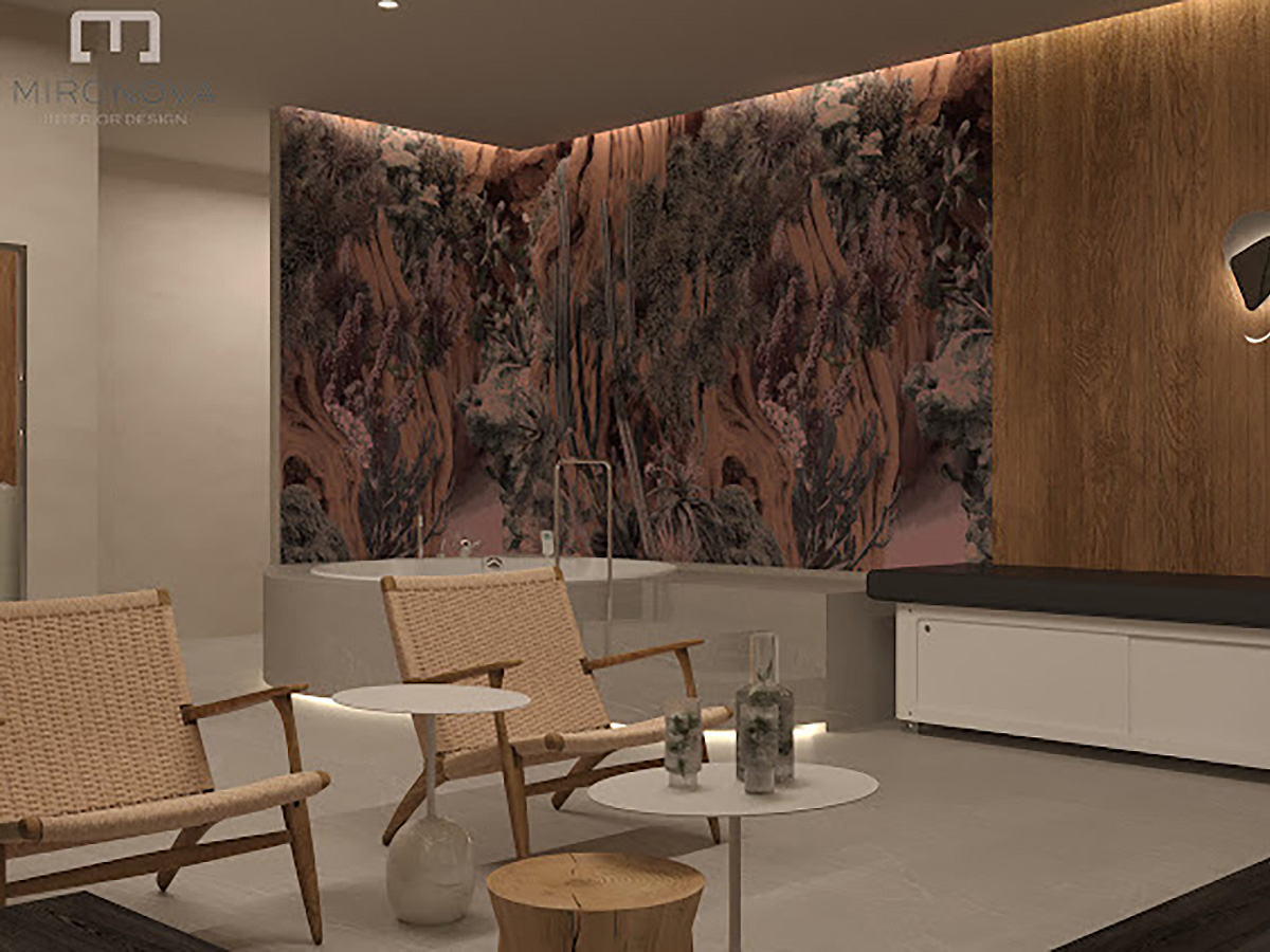 Im Saunabereich ist hervorzuheben, dass es für Männer und Frauen getrennte Räume gibt, die individuell gestaltet wurden. Der Saunabereich für Frauen wurde mit einem femininerem Touch designed. Die dunkelbraune Tapete schmiegt sich elegant an die Holz-Liegen und den dunklen Stein an.