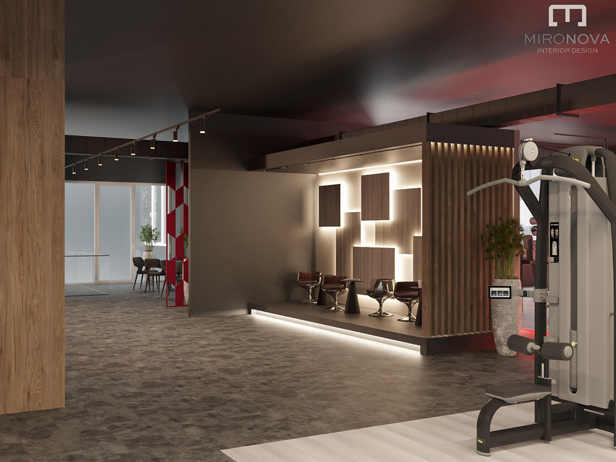 Bei der Bar wurden Metro-Fliesen an der Wand angebracht, um eine optische Abgrenzung zu erschaffen. Durch die Trennwand aus Holzlamellen wird die große Fläche geschickt zwischen Sitz- und Trainings-Bereich unterteilt.