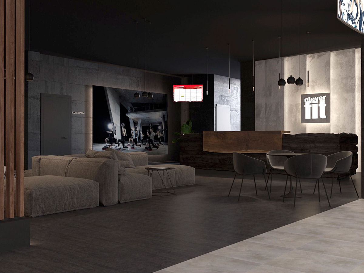 Das gesamte Design vom Clever Fit Uelzen ist in dunklen und modernen Farben mit braunen Highlights gehalten. Der lockere und stylische Look verwandelt das Studio in eine Art Lounge. Die Beleuchtung wurde präzise platziert, wie hinter den großen Spiegeln an der Wand. Diese verleihen dem Studio eine gewisse Tiefe.