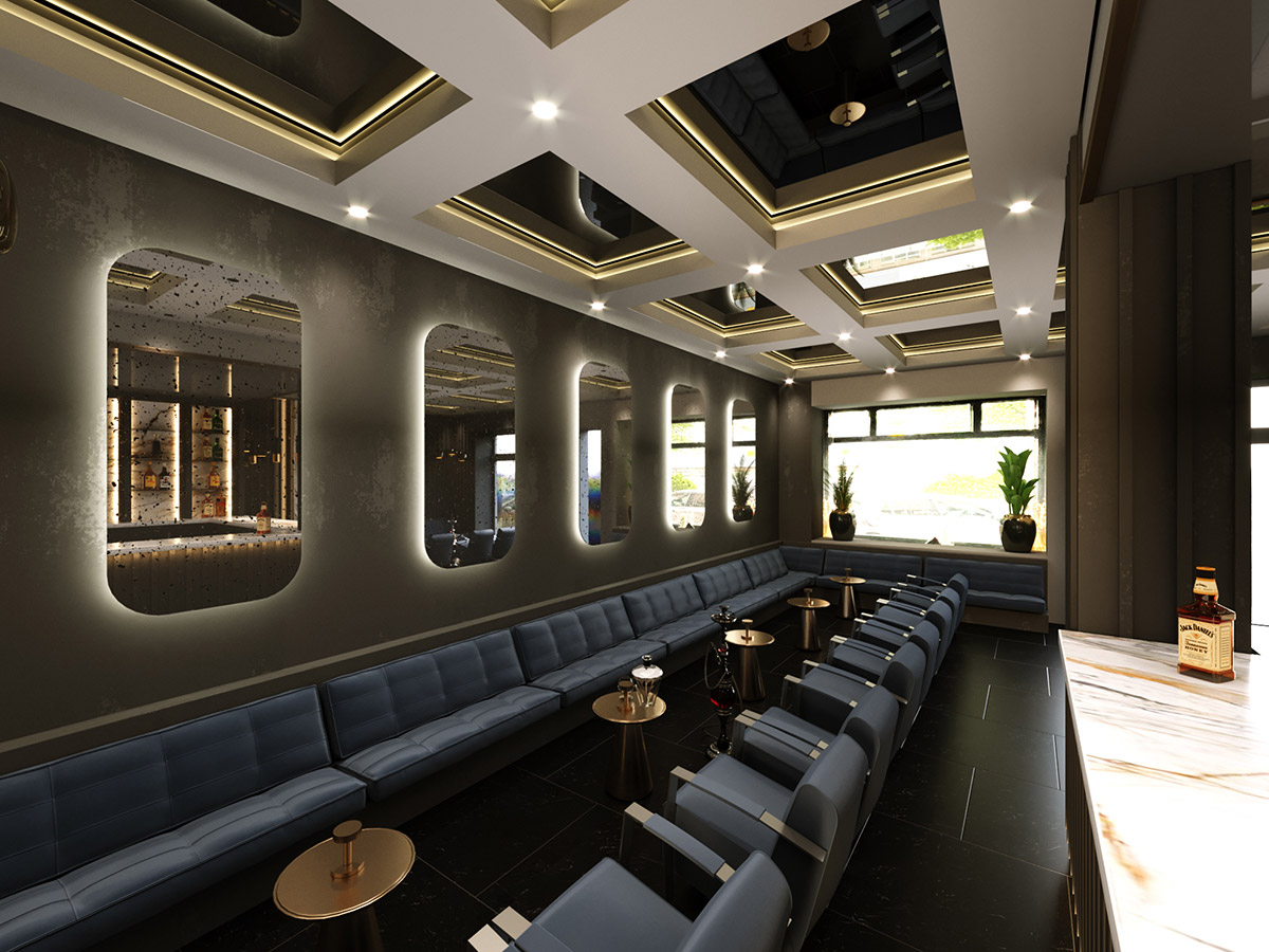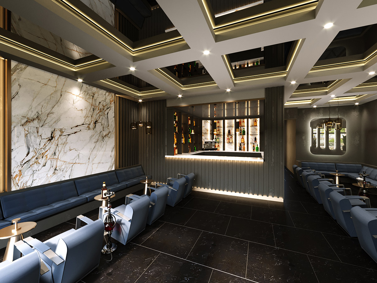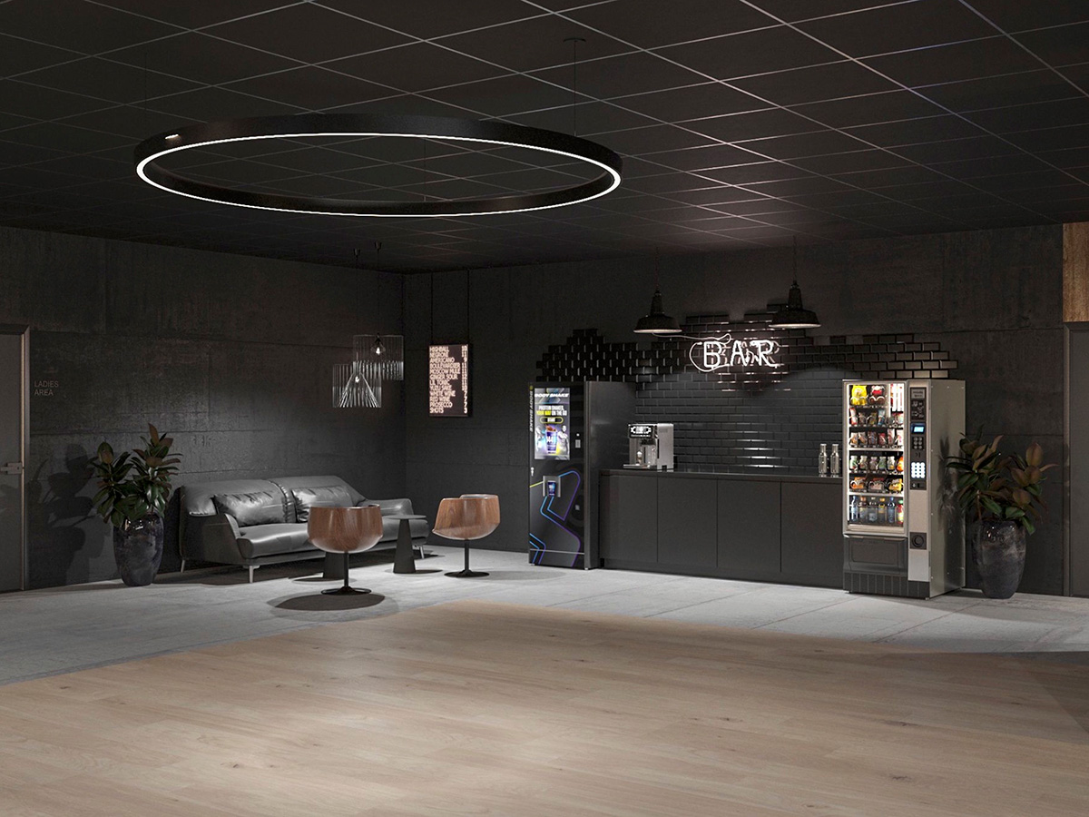 Begrüßt wird man im Eingang von einer kleinen Lounge-Ecke sowie einem Sitzbereich auf einem Podest. In den Stufen und unter den 3D-Paneelen ist Licht eingelassen. Neben dem Podest sowie im Tresenbereich befinden sich Fernseher an den Wänden.