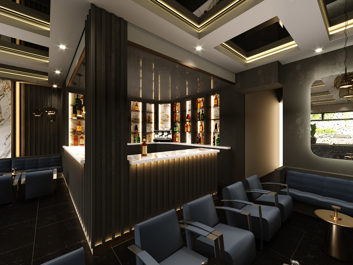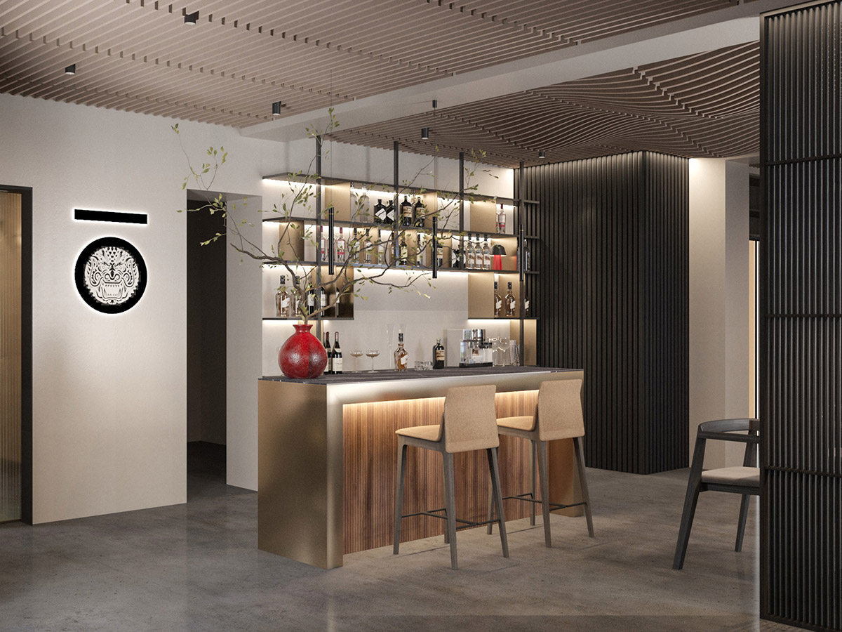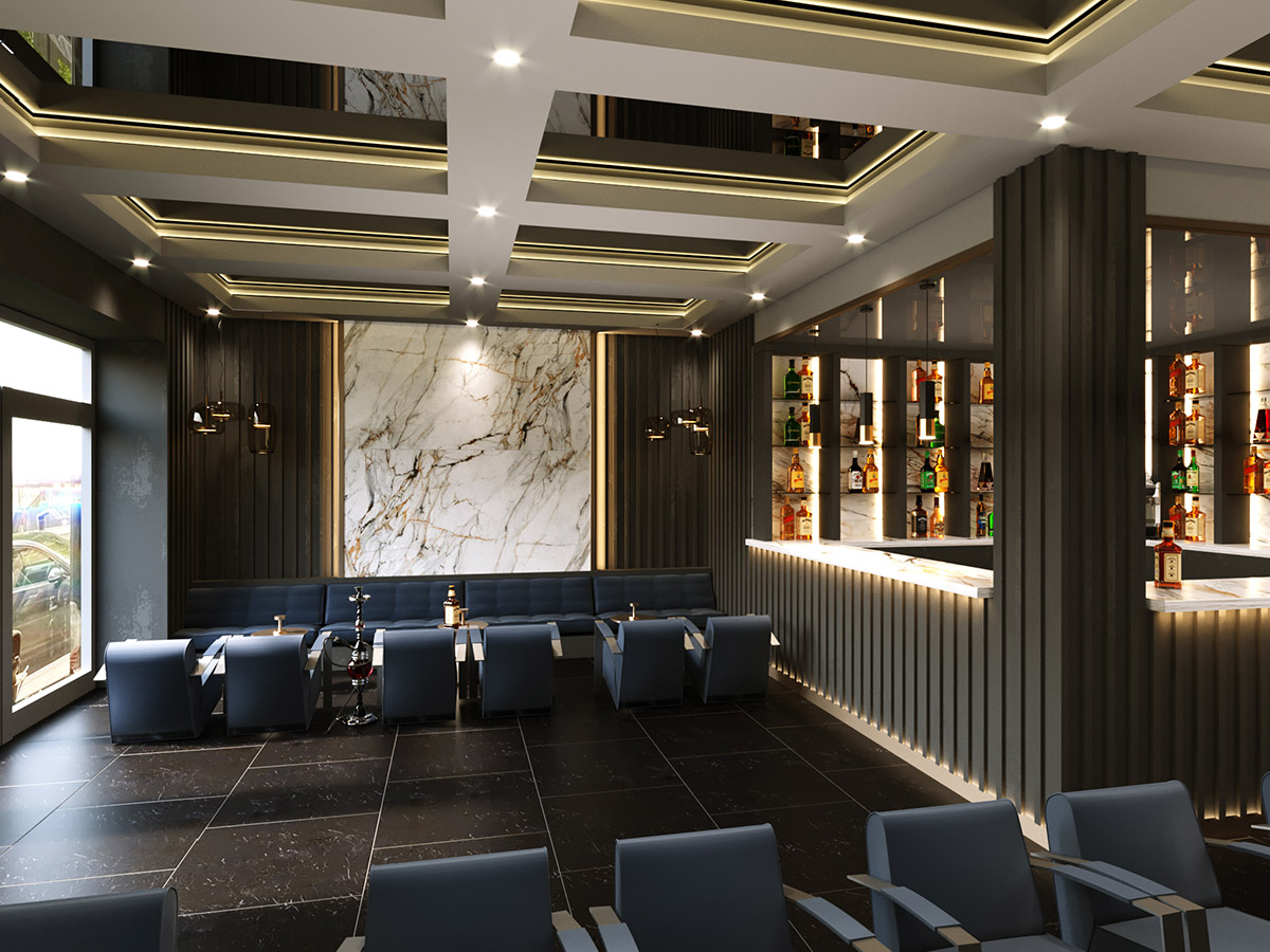 Begrüßt wird man im Eingang von einer kleinen Lounge-Ecke sowie einem Sitzbereich auf einem Podest. In den Stufen und unter den 3D-Paneelen ist Licht eingelassen. Neben dem Podest sowie im Tresenbereich befinden sich Fernseher an den Wänden.