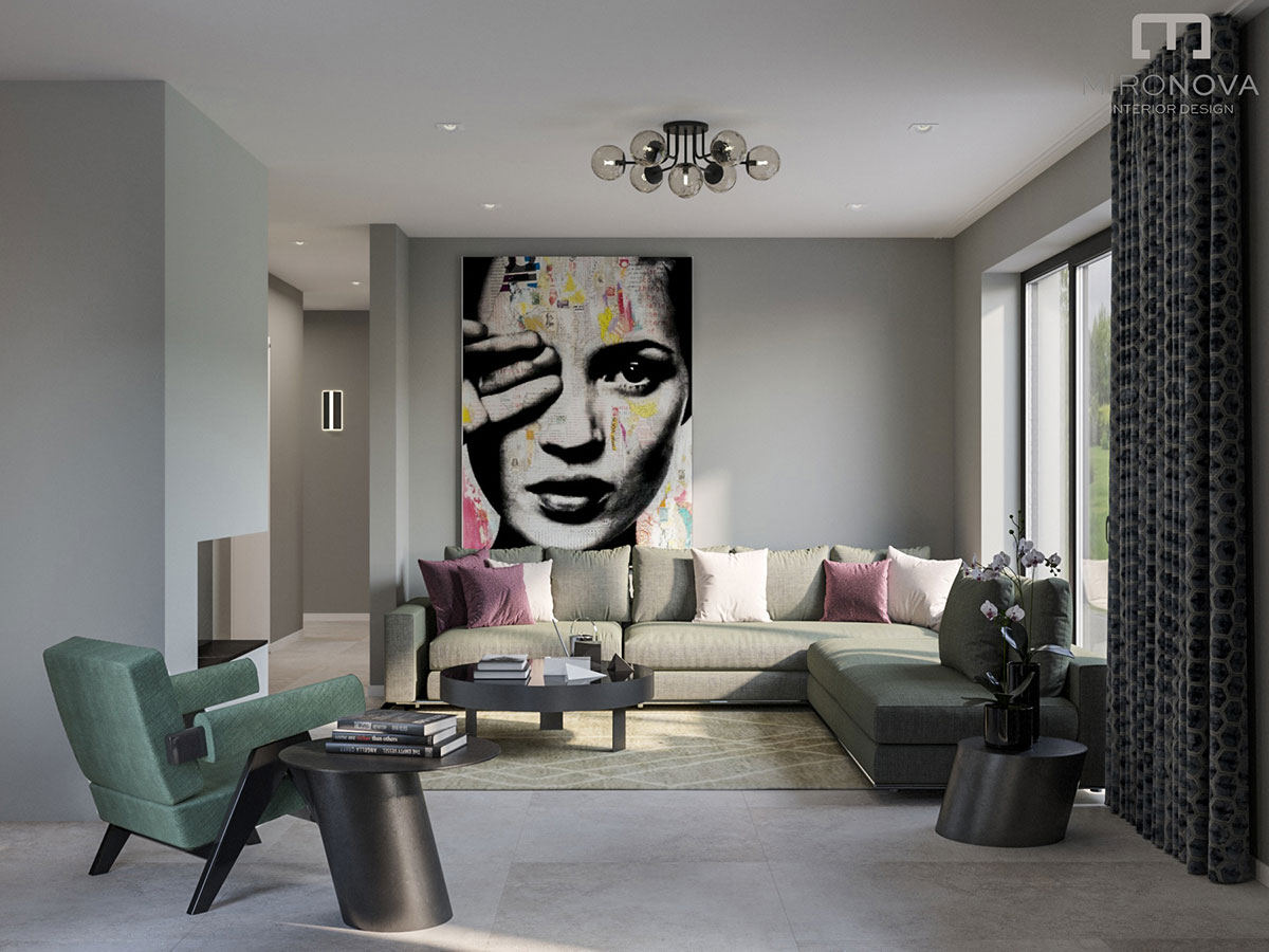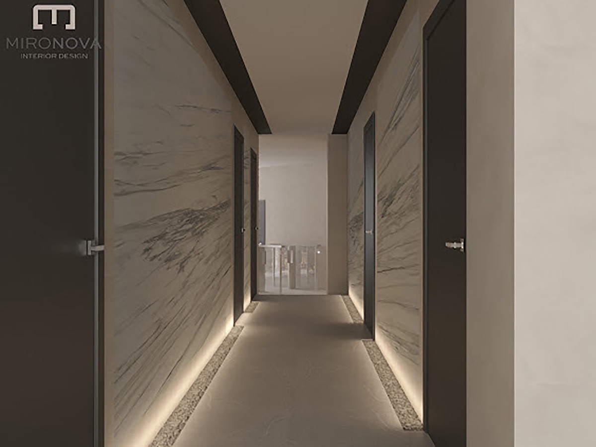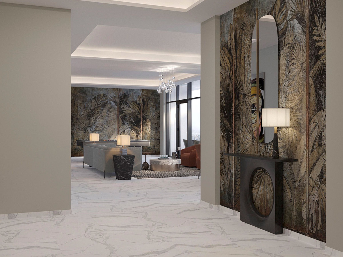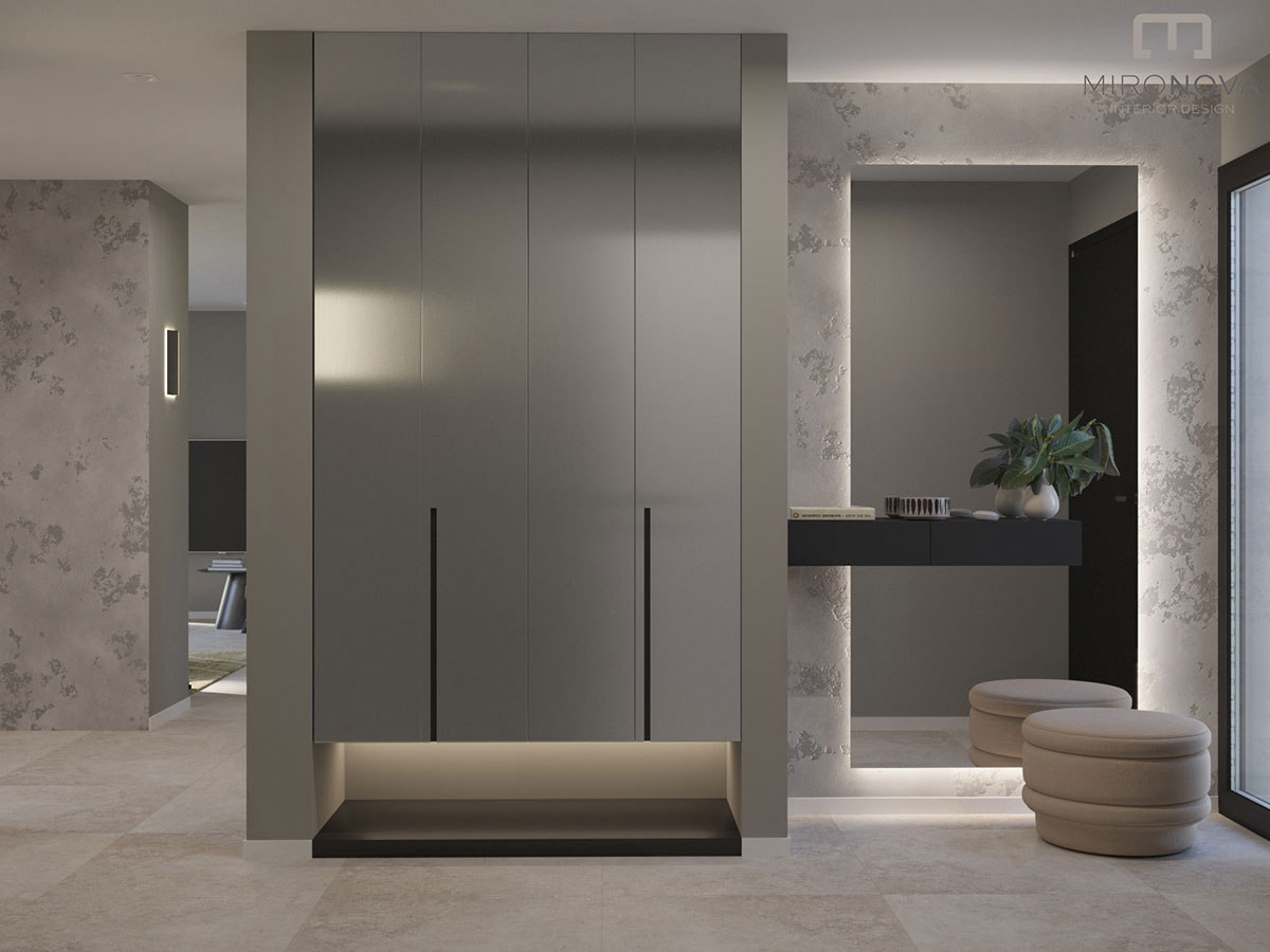 Das Design dieser Penthousewohnung basiert auf einem ausgefallenen Licht- und Farbkonzept! Im Wohn- und Durchgangsbereich setzt besonders die Wandtapete ein dynamisches Highlight. Die schlamm- und graufarbigen Wandtöne finden sich ebenfalls in den Möbeln und Dekorationselementen wieder.