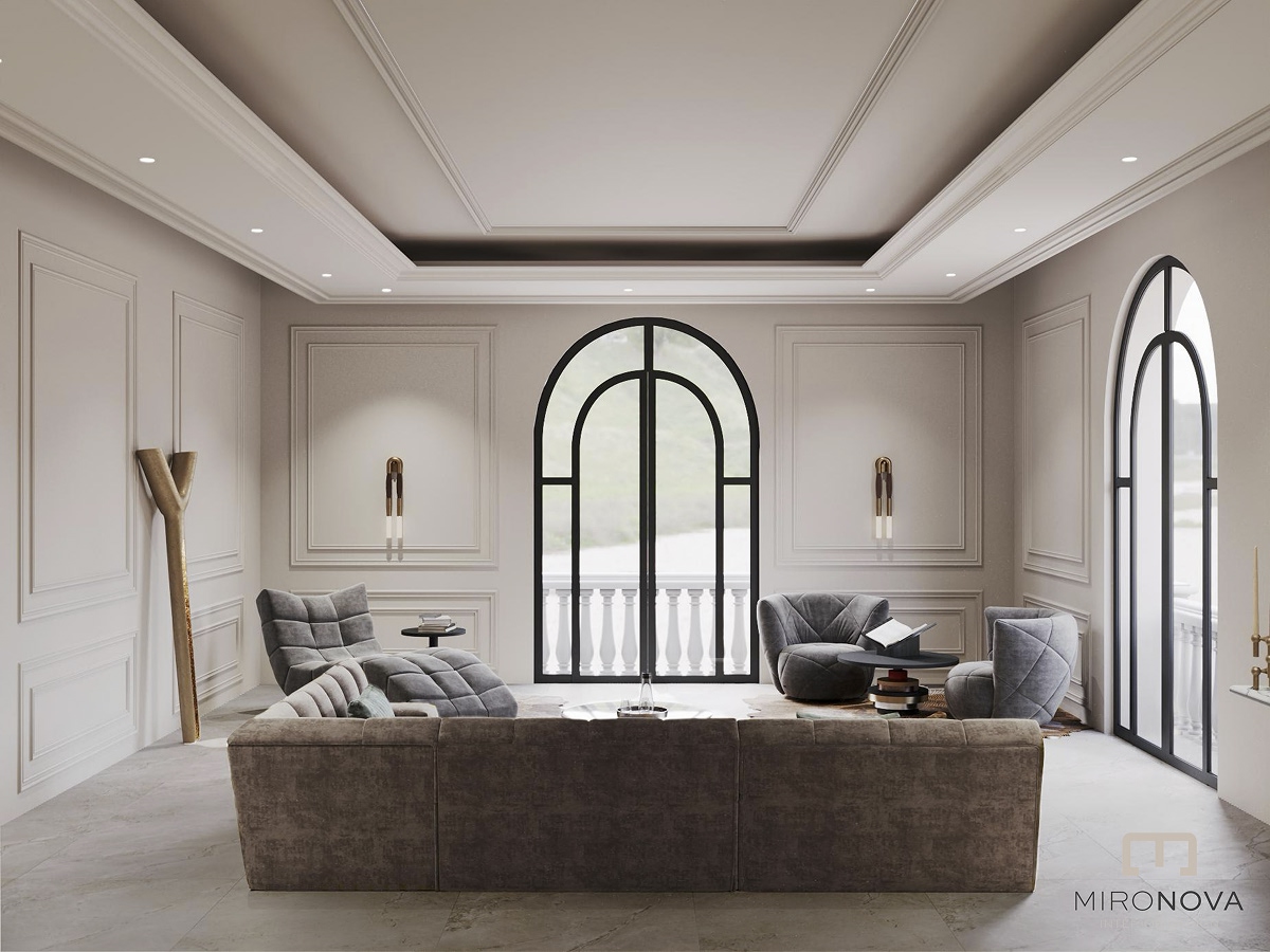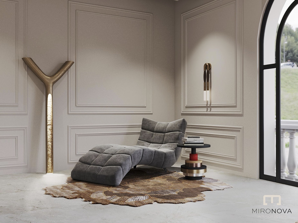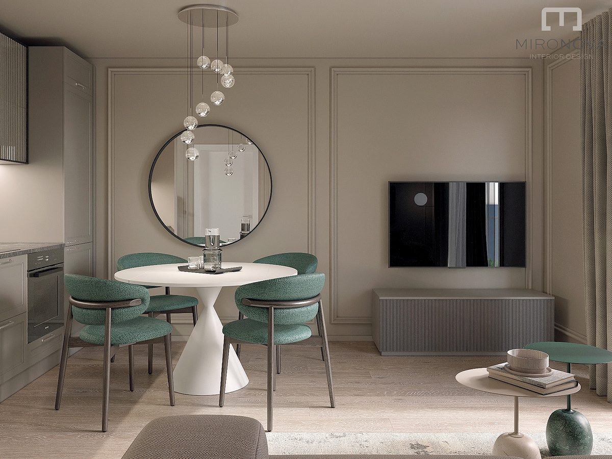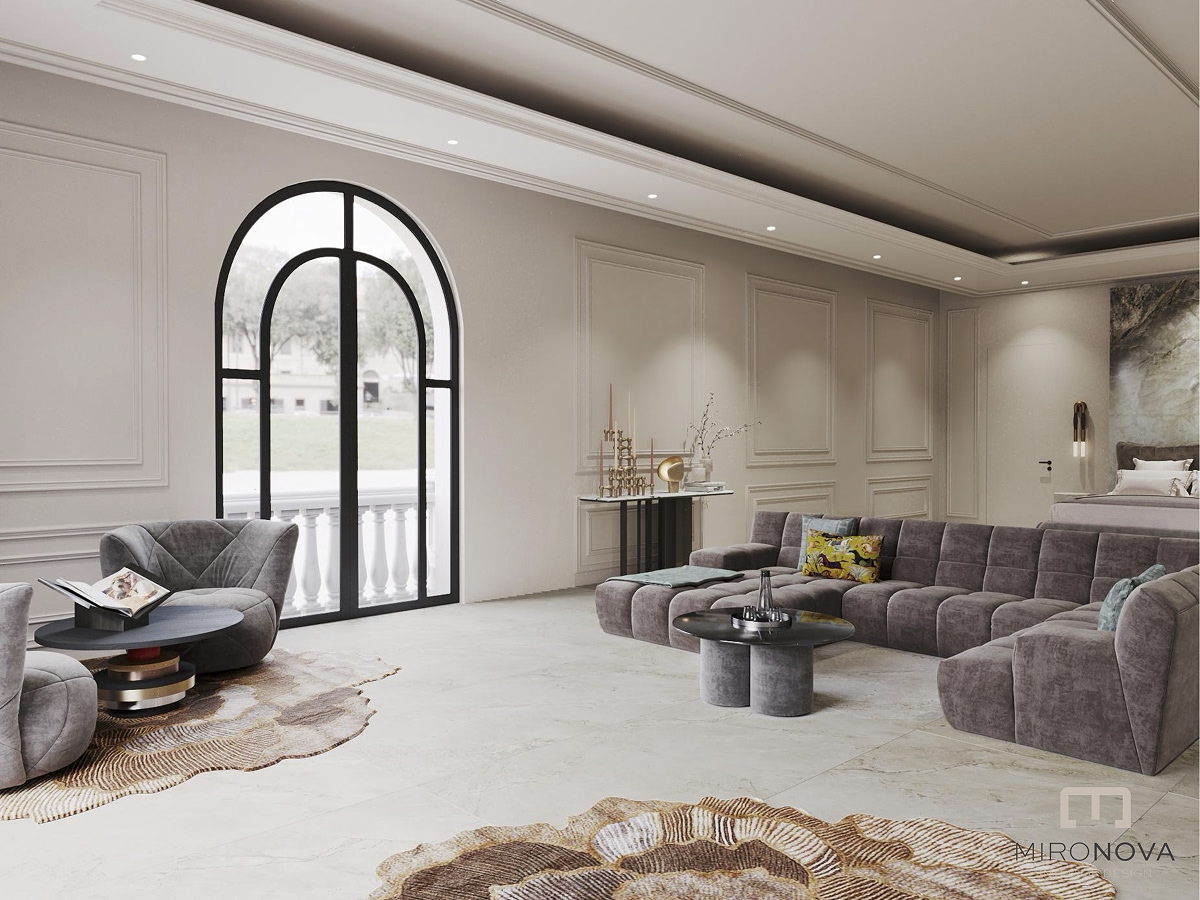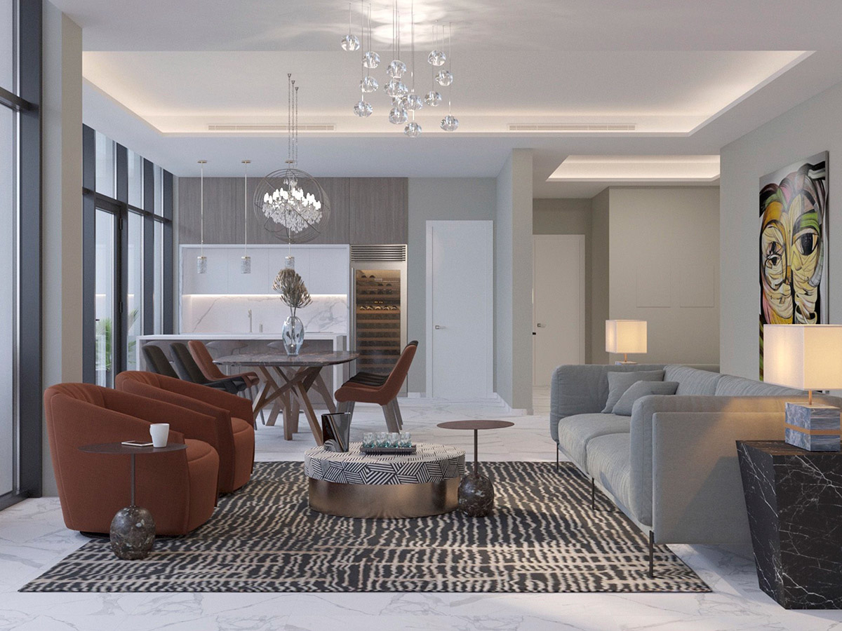 Das Design dieser Penthousewohnung basiert auf einem ausgefallenen Licht- und Farbkonzept! Im Wohn- und Durchgangsbereich setzt besonders die Wandtapete ein dynamisches Highlight. Die schlamm- und graufarbigen Wandtöne finden sich ebenfalls in den Möbeln und Dekorationselementen wieder.