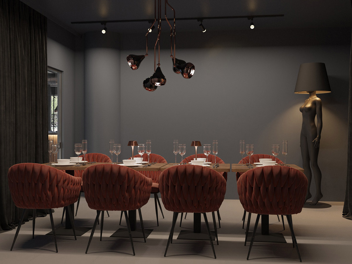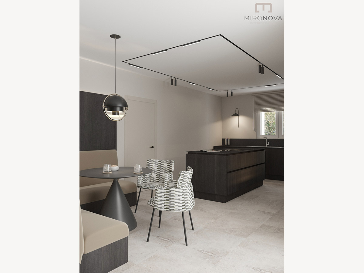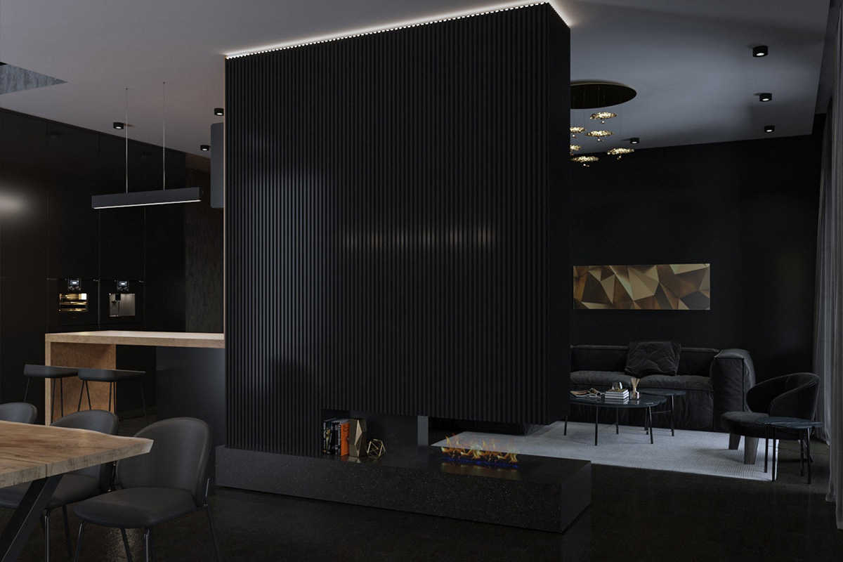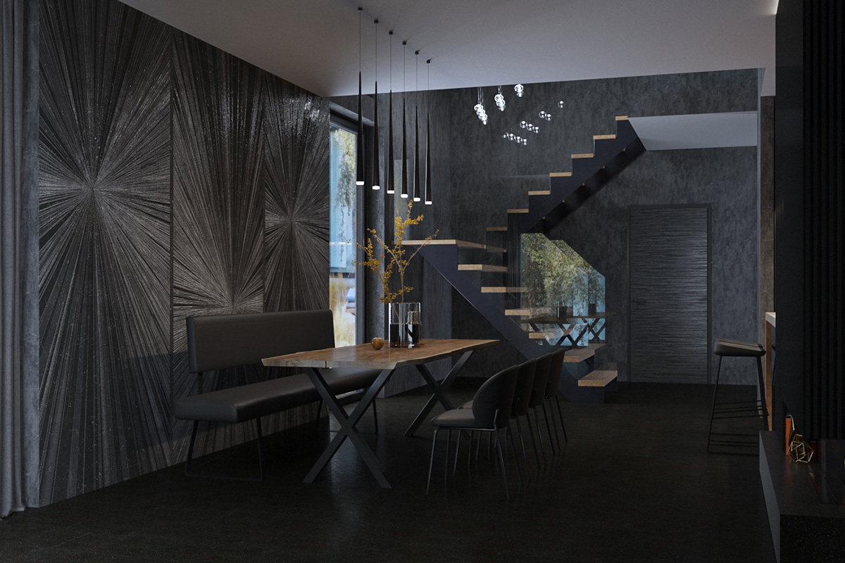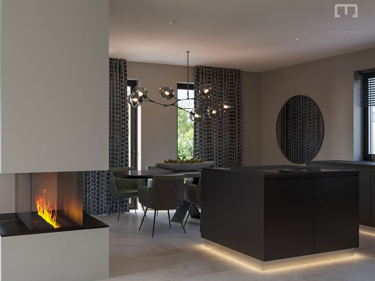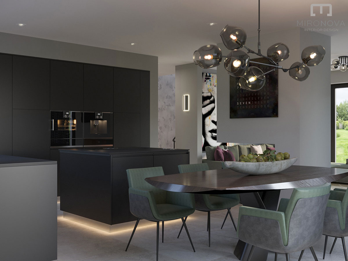Im Erdgeschoss sind die Küche, der Boden, die Wände und Möbel im Wohn- und Essbereich in dunklen Farben gestaltet. Die großen Fenster und die abgestimmten Lichtquellen, wirken den Farbtönen entgegen und sorgen für eine angenehme Atmosphäre.