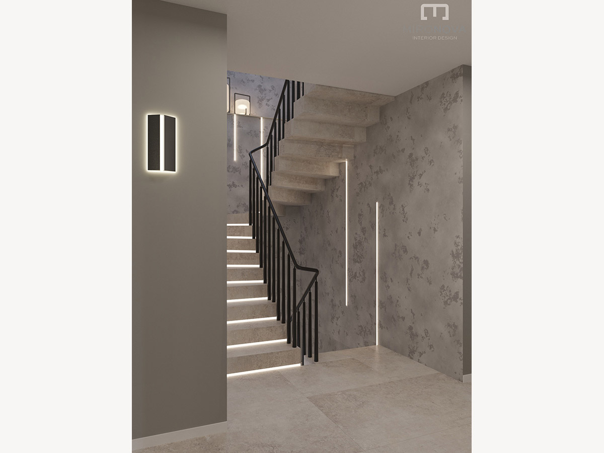 Durch die Treppe gelangt man ins obere Stockwerk. Das dunkle Material der Treppe ergibt einen harmonischen Kontrast zur Lichterleiste sowie zu den durchsichtigen Geländern. Die Pendelleuchten schaffen eine Verbindung zwischen den hellen Lichtquellen und dem modernen Dekor.