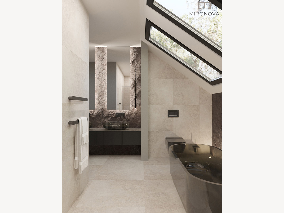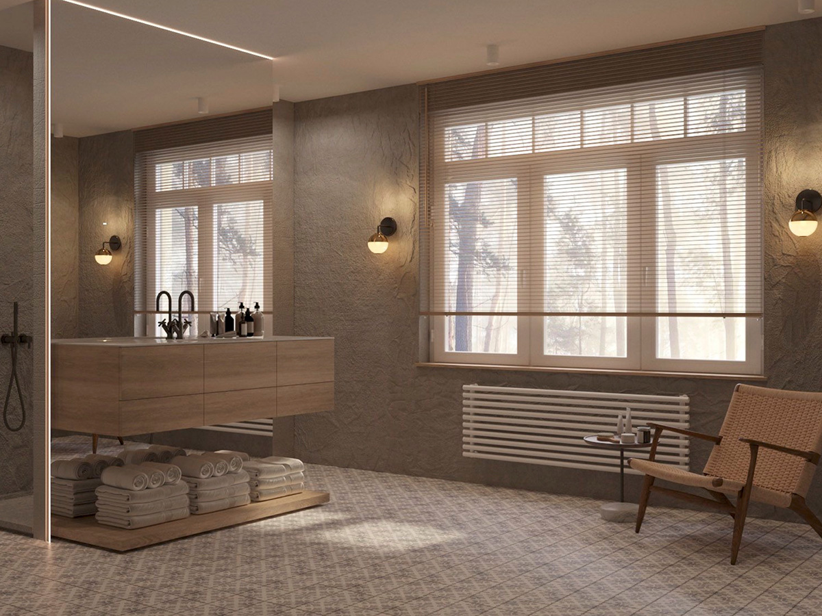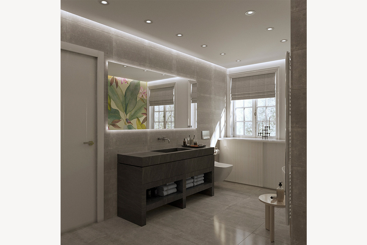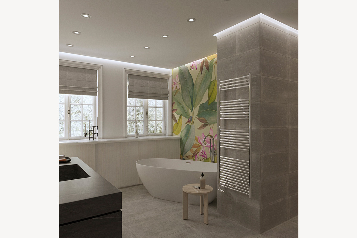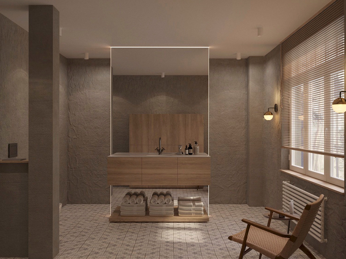 Veredelt wird die Gestaltung durch den Einsatz unterschiedlicher Oberflächenstrukturen. So wurden ausgewählte Wände im Erdgeschoss, im Treppenhaus und auch im Bad mit einer Spachteltechnik als durchgängiges Designelement umgesetzt.