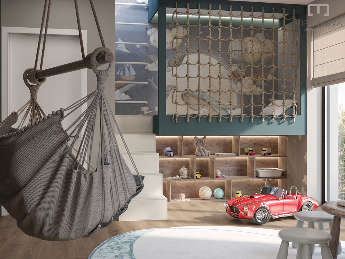 Bei der Planung der beiden Kinderzimmer wurde darauf geachtet, dass es klar getrennte Spiel- und Schlafbereiche auf zwei Etagen gibt, die jeweils über eingebaute Stufen erreicht werden können.