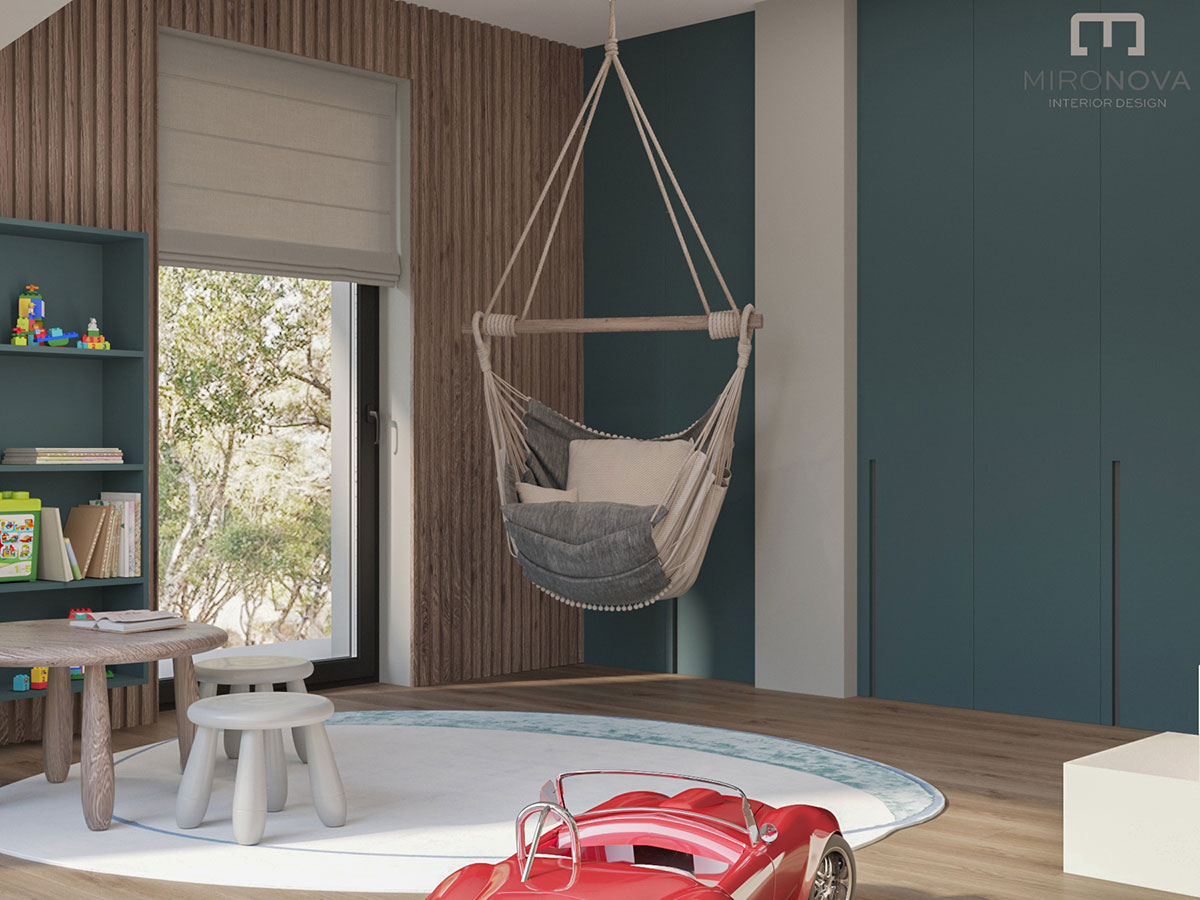 Abgestimmt auf die verschiedenen Wandfarben, finden sind entsprechende Motivtapeten wieder, die optisch das Jungen- von dem Mädchenzimmer unterscheiden.