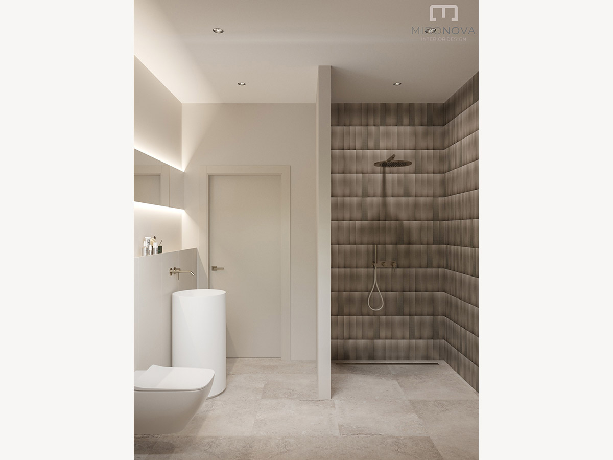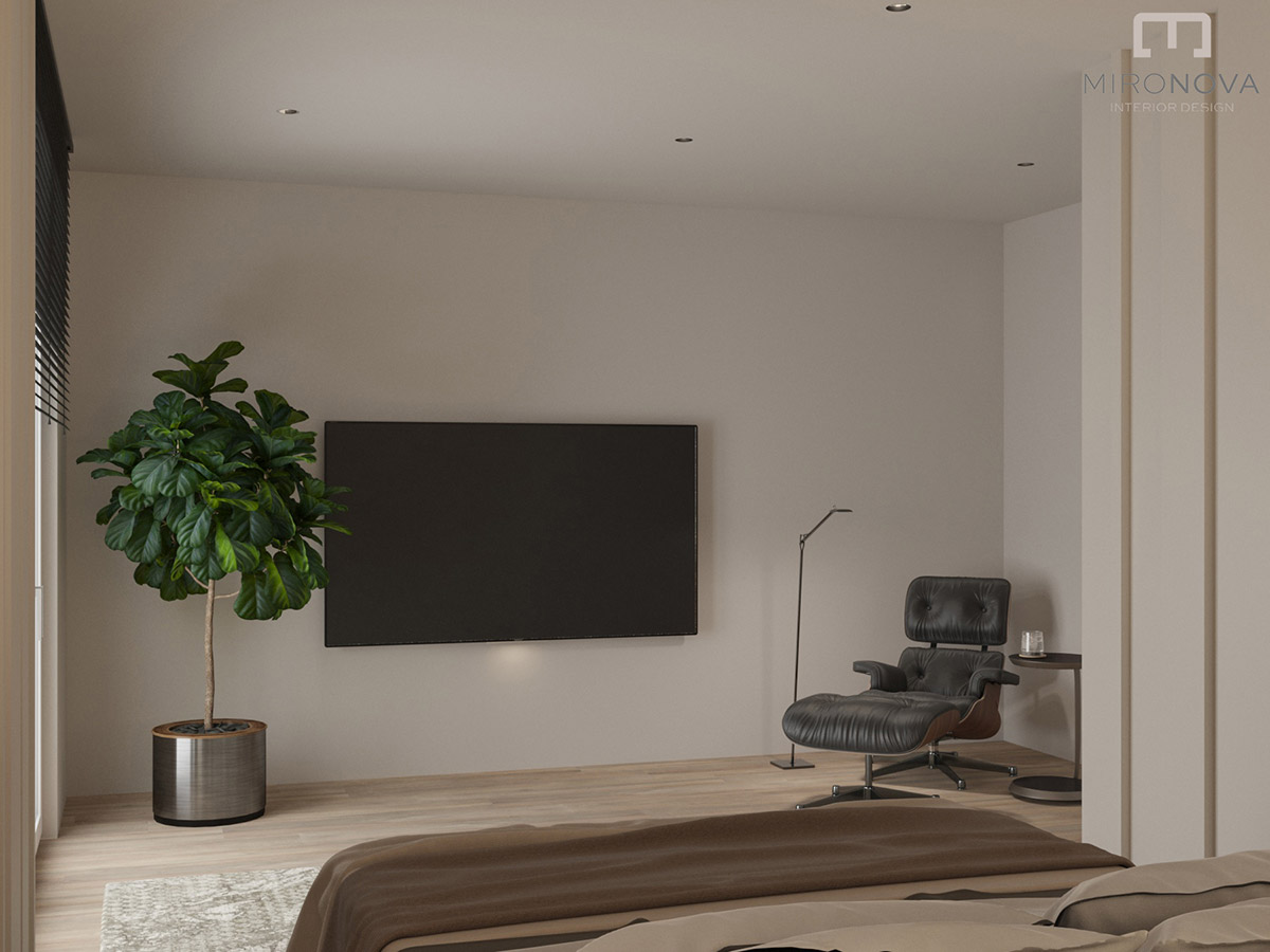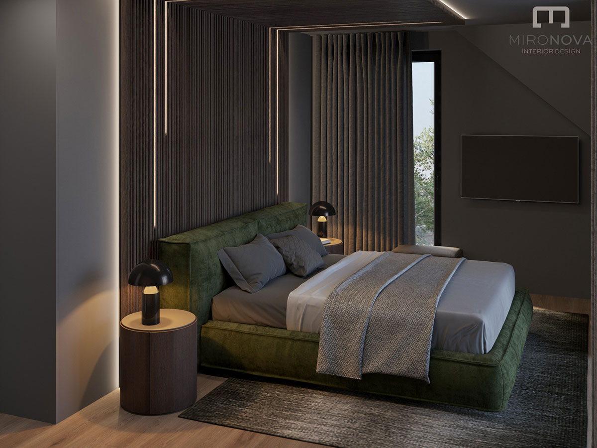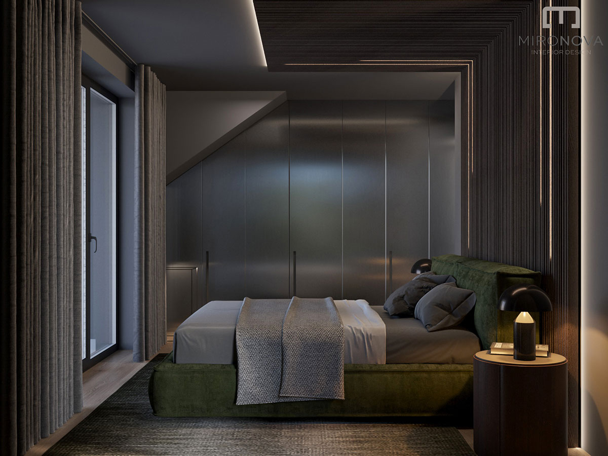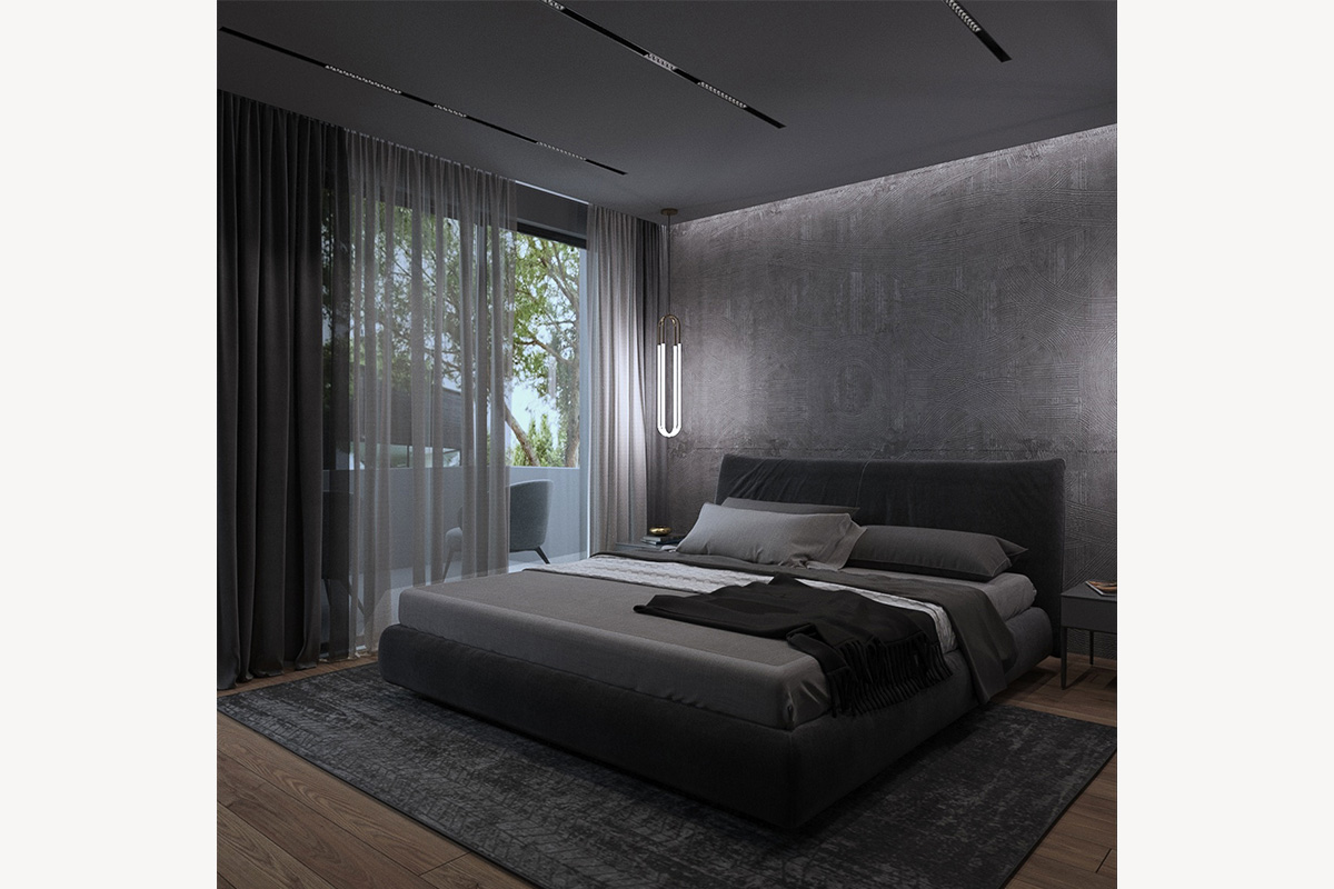 Auch das Schlafzimmer, der begehbare Kleiderschrank, sowie das anliegende Bad, wurden in dunklen Tönen mit mehreren Graustufen gestaltet.