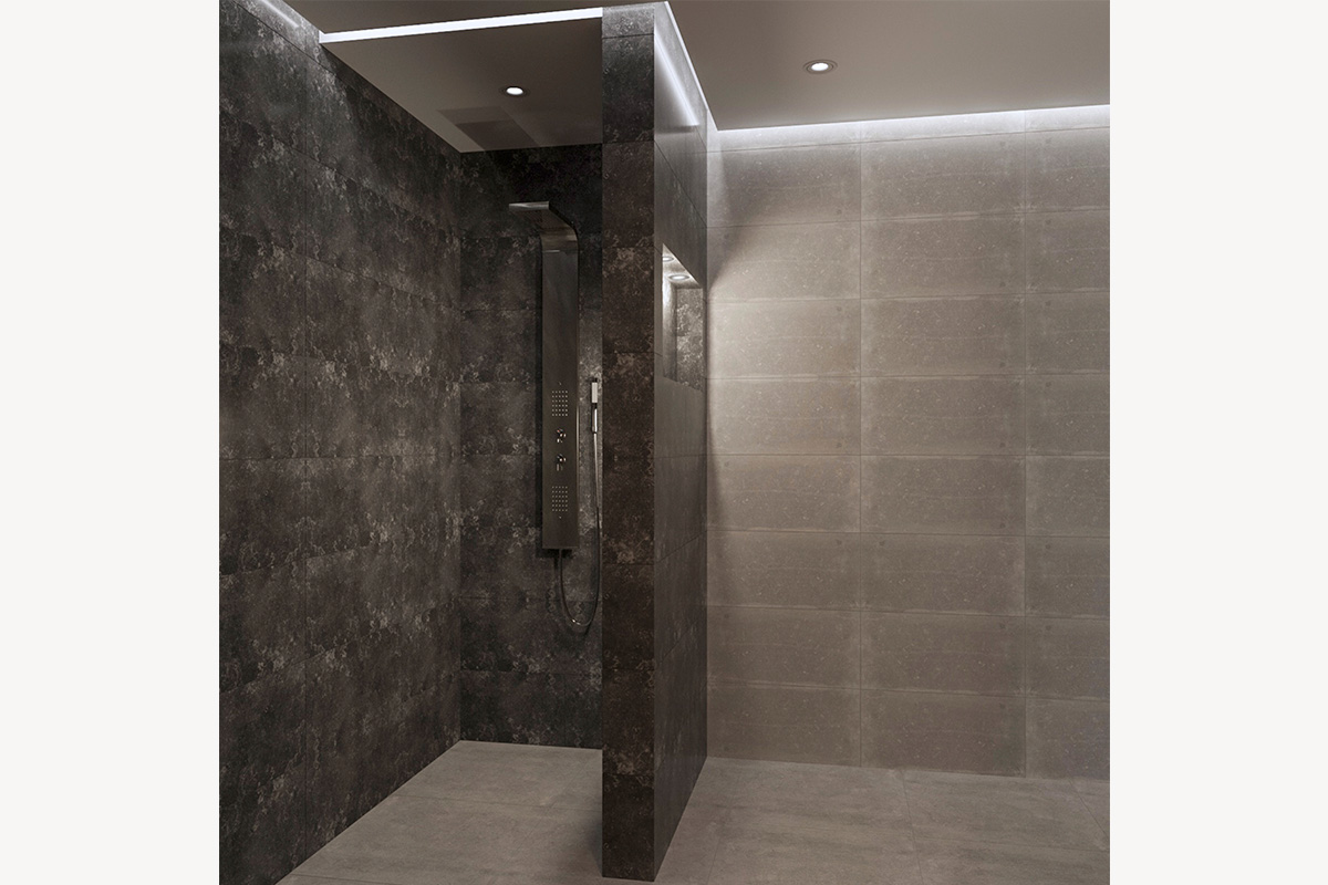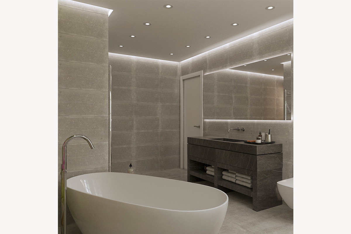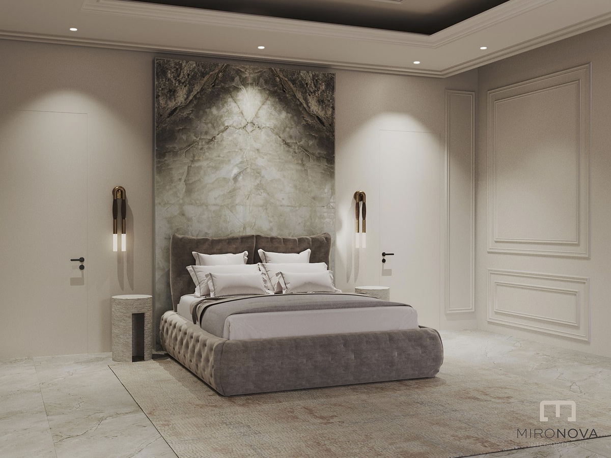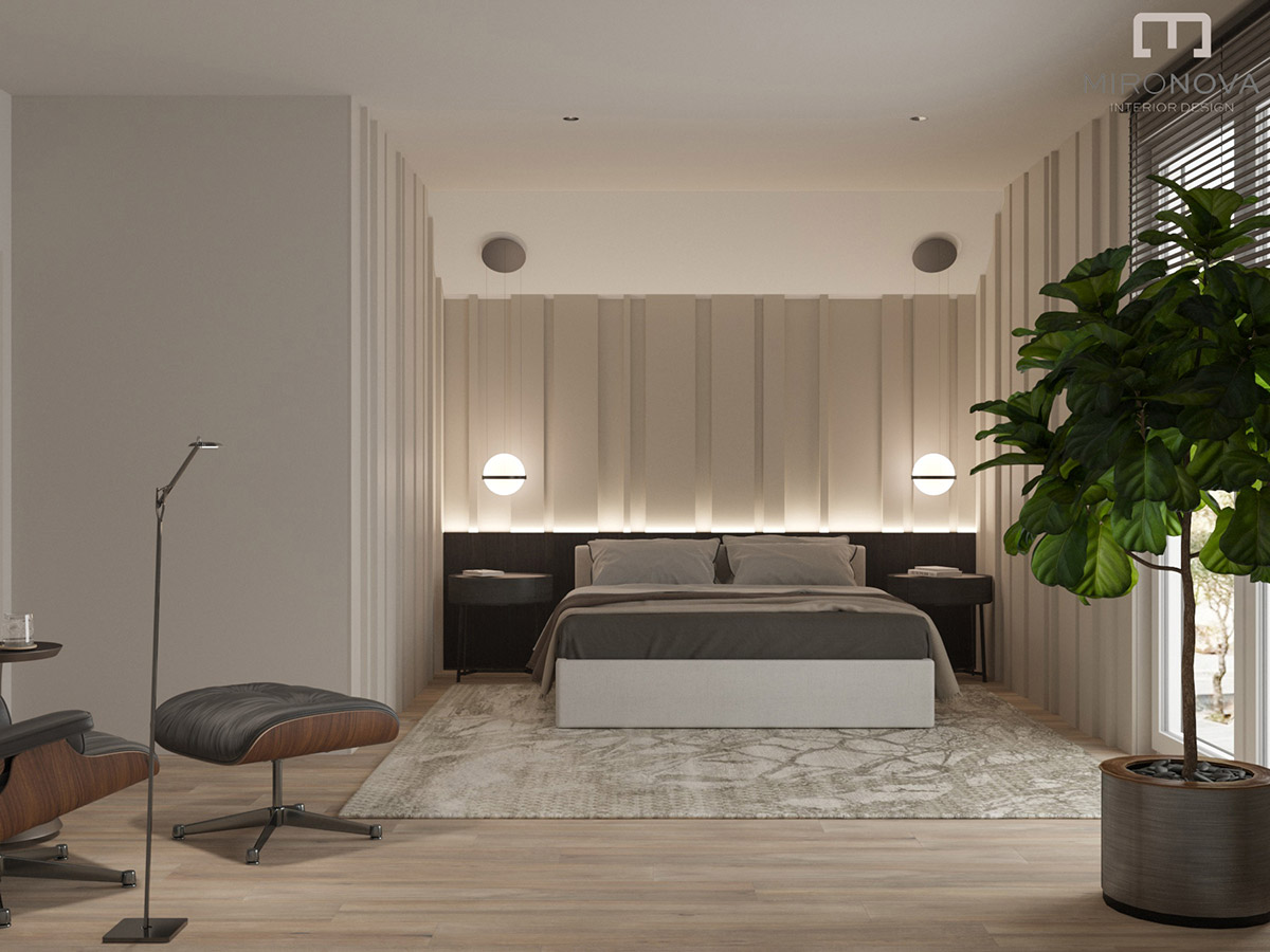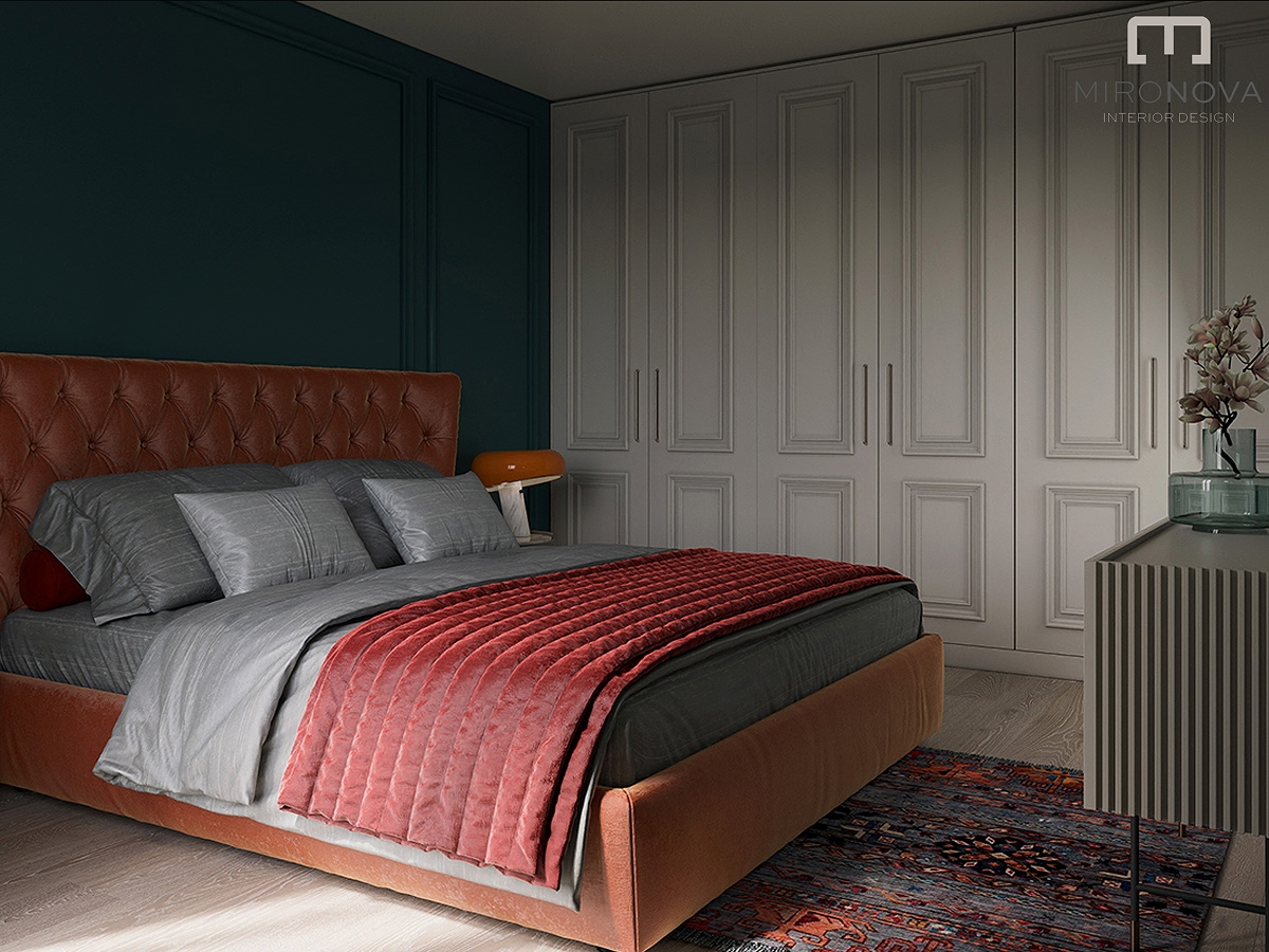 Auch das Schlafzimmer, der begehbare Kleiderschrank, sowie das anliegende Bad, wurden in dunklen Tönen mit mehreren Graustufen gestaltet.