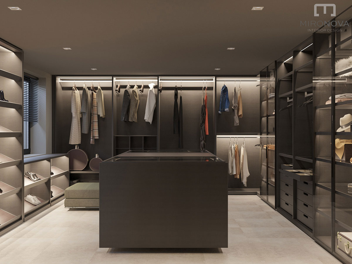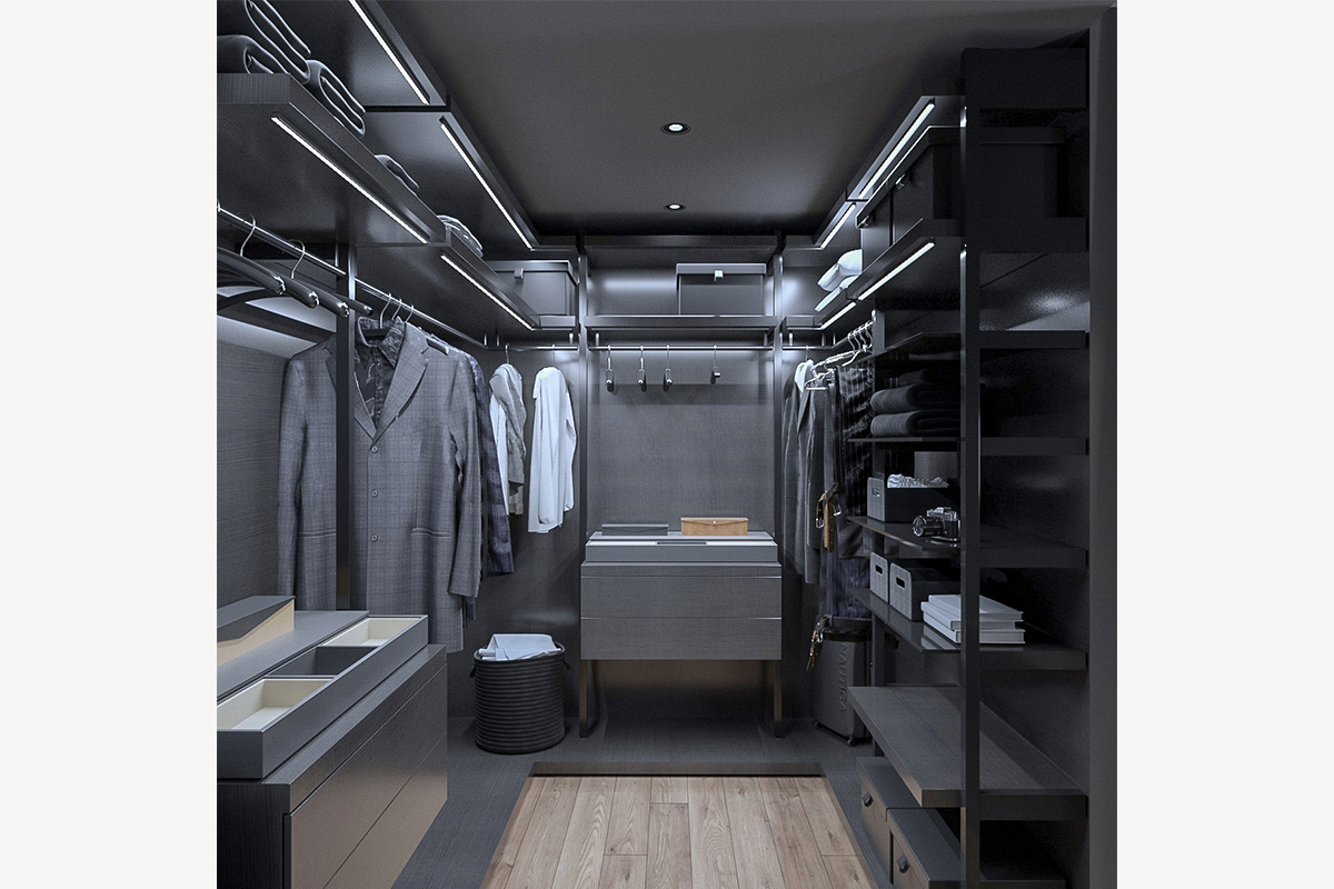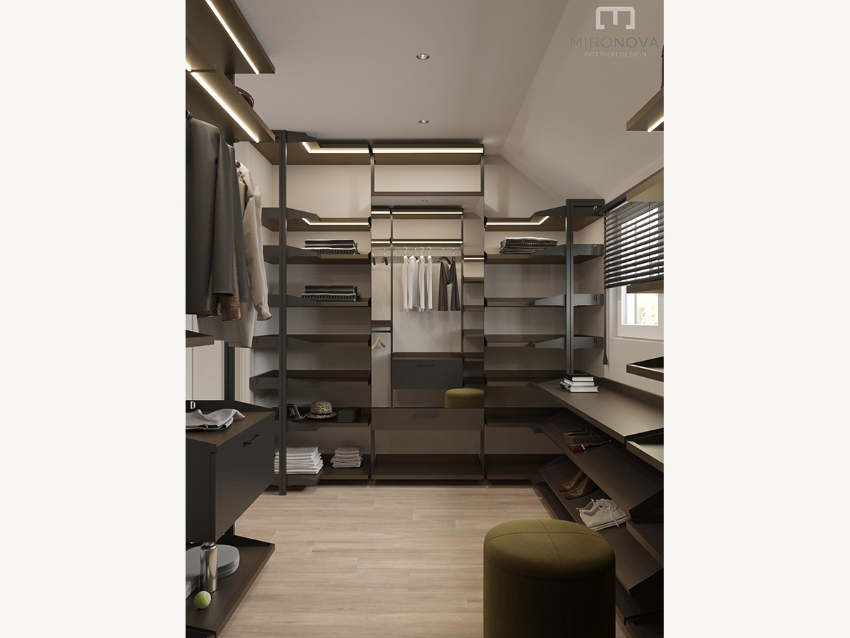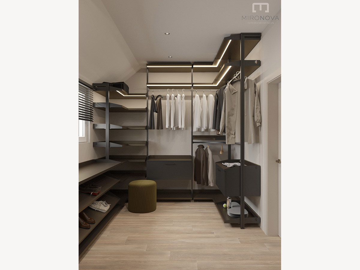 Das individuell gestaltete Schranksystem bietet genug Raum und unterschiedlich hohe, große Fächer, damit alle Arten von Bekleidung, Schuhen und Accessoires Ihren Platz haben. Zusätzlich zu den Deckenstrahlern, kommen in den einzelnen Schrankelementen indirekte Lichtquellen zum Einsatz. Im Zusammenspiel mit den Grautönen und dem hellen Boden ist ein gemütlicher, einladender Raum entstanden.