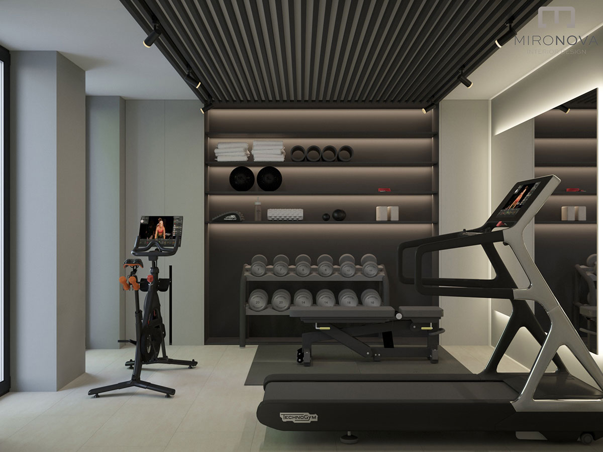 Neben der abgestimmten Farbauswahl sticht die Lamellendecke mit der integrierten Linienbeleuchtung hervor. Dazu farblich passend findet sich ein individuell geplantes Regalsystem wieder, in dem Handtücher und Fitnessgeräte aufbewahrt werden können.