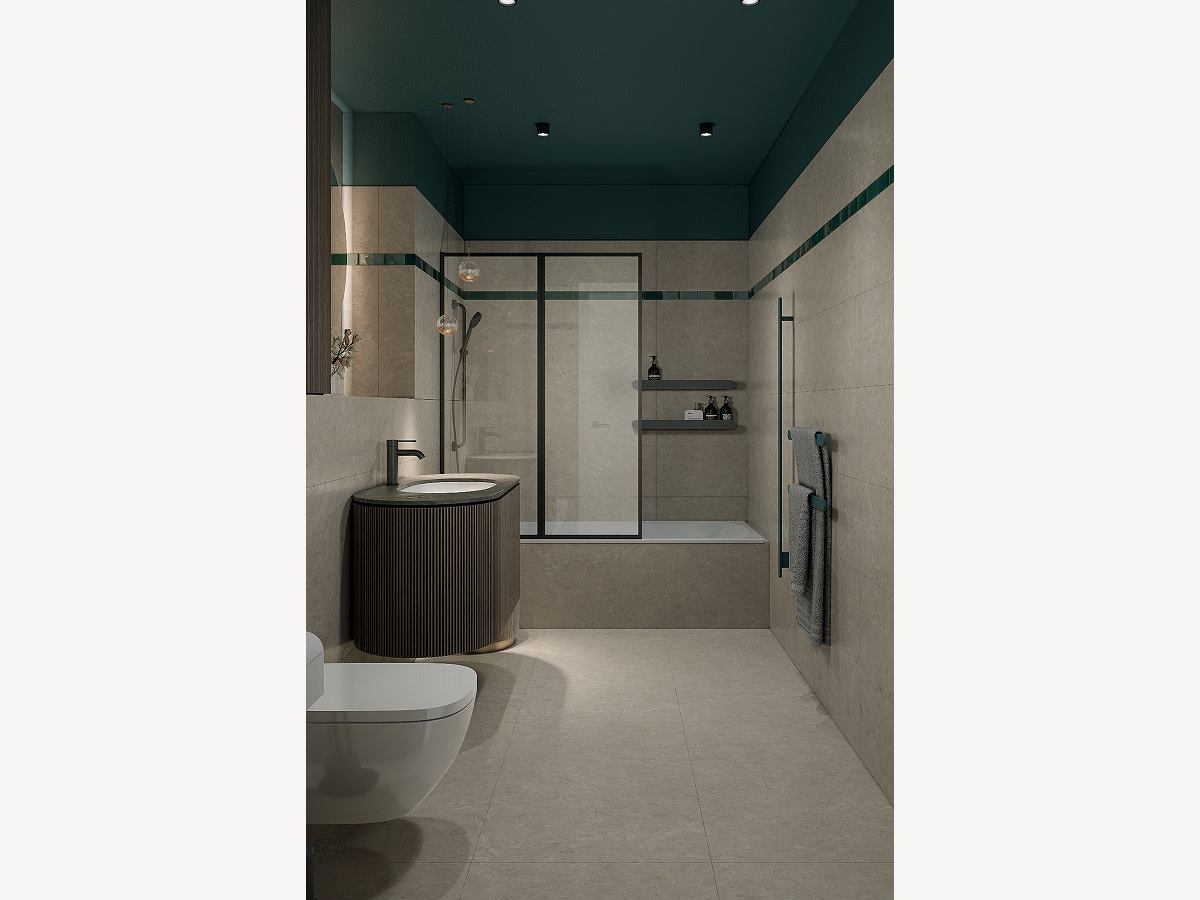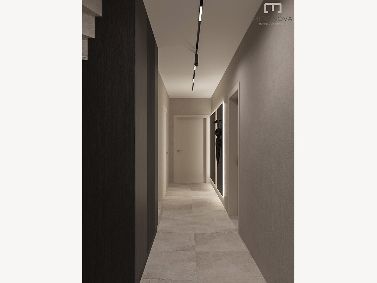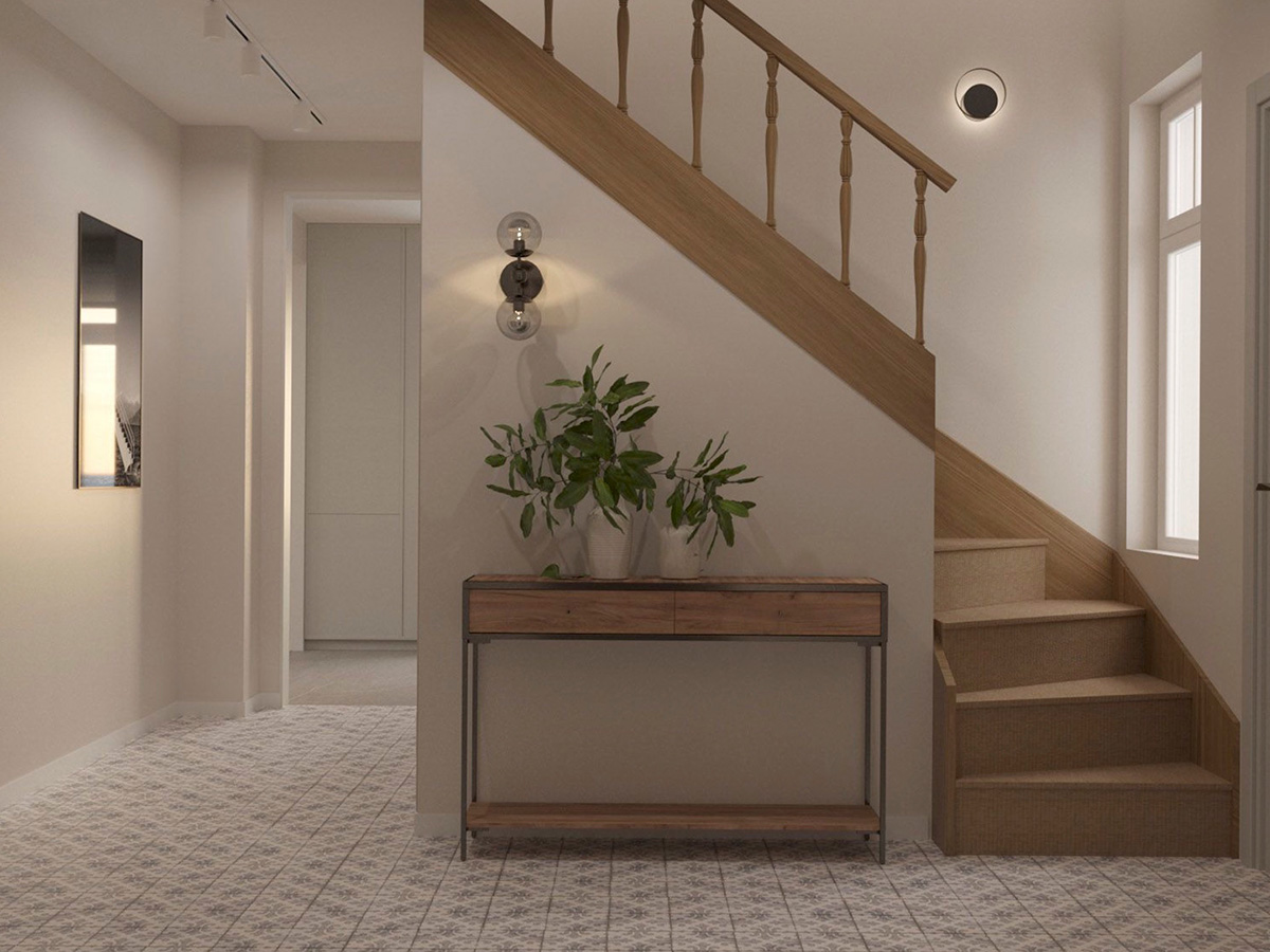 Der Flur ist hell und freundlich designed. Ein Spiegel sowie ein Kunstgemälde bilden die Highlights der Wände. Besonders auffallend sind jedoch die hochwertigen Terazzo Via Fliesen, die sich ebenfalls im Bad wieder finden und mit den verschiedenen Erdtönen harmonisieren.