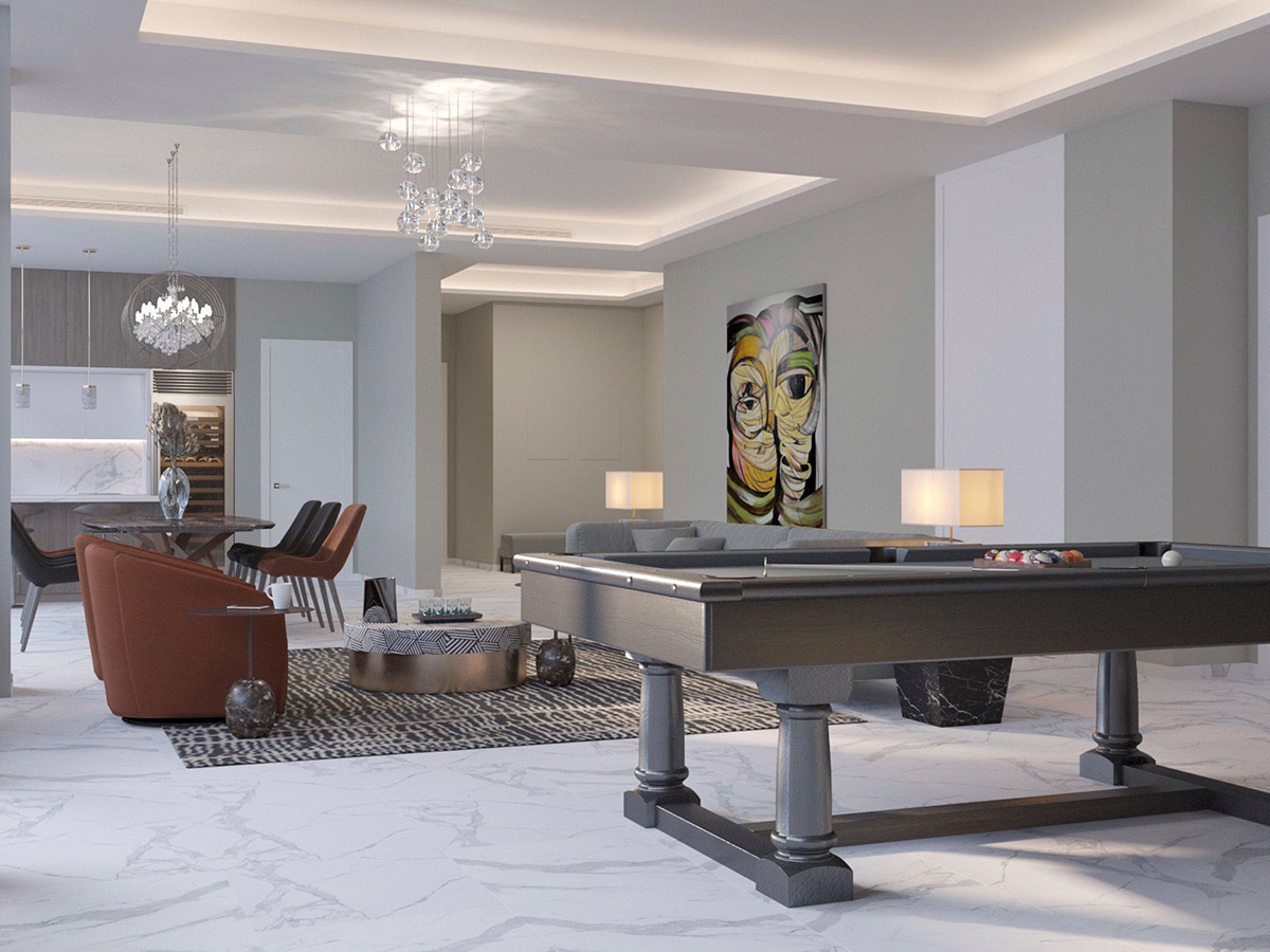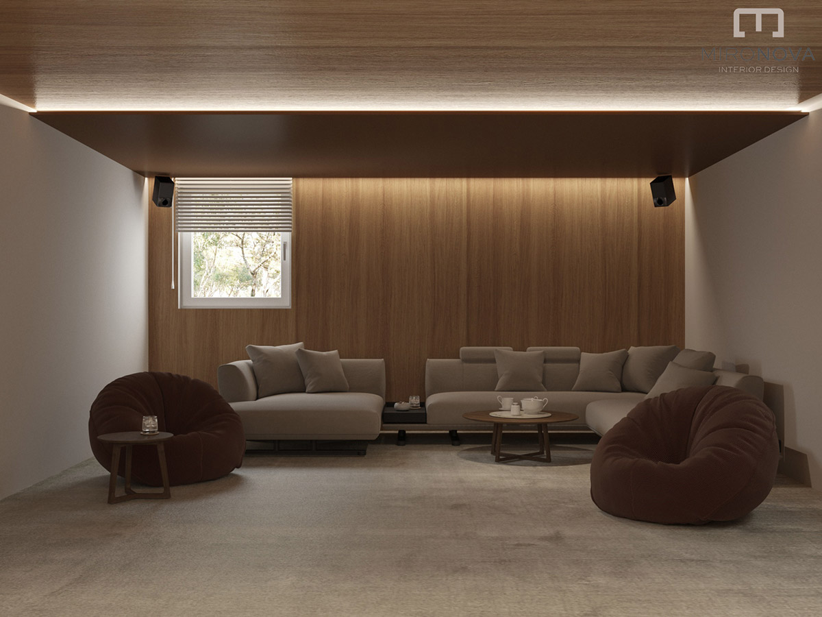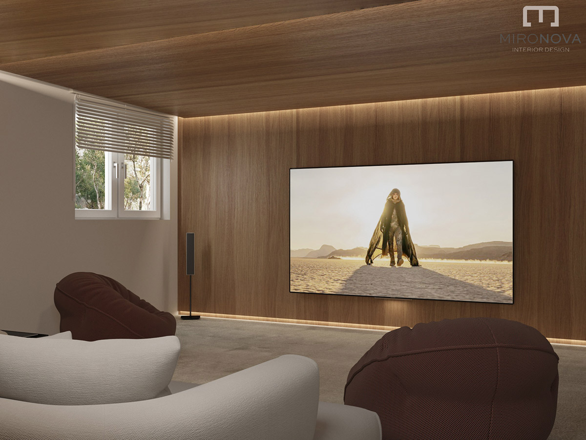 Auf Wunsch des Kunden wurden in der gesamten Wohnung neben den dunklen Farbelementen, ausgewählte, maskuline Einrichtungselemente integriert - wie z.B. ein Billard-Tisch oder ein Heimkino.