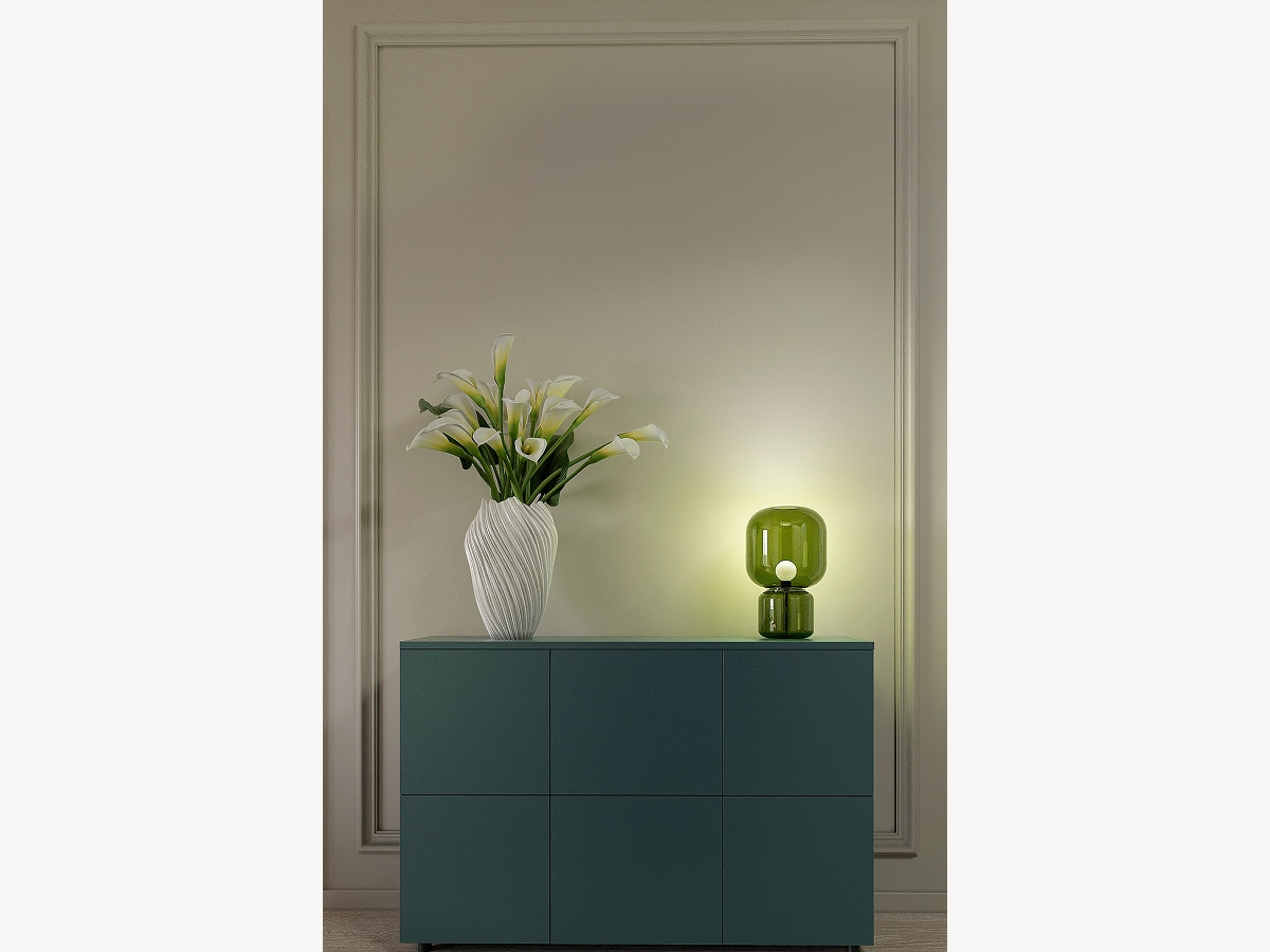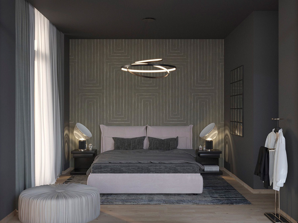 Im Schlafzimmer dominieren Anthrazit- und Schlammtöne sowie ausgefallene Lichtquellen das Stimmungsbild. Die moderne Deckenlampe sowie futuristischen Nachtischlampen unterstreichen das dynamische Design.