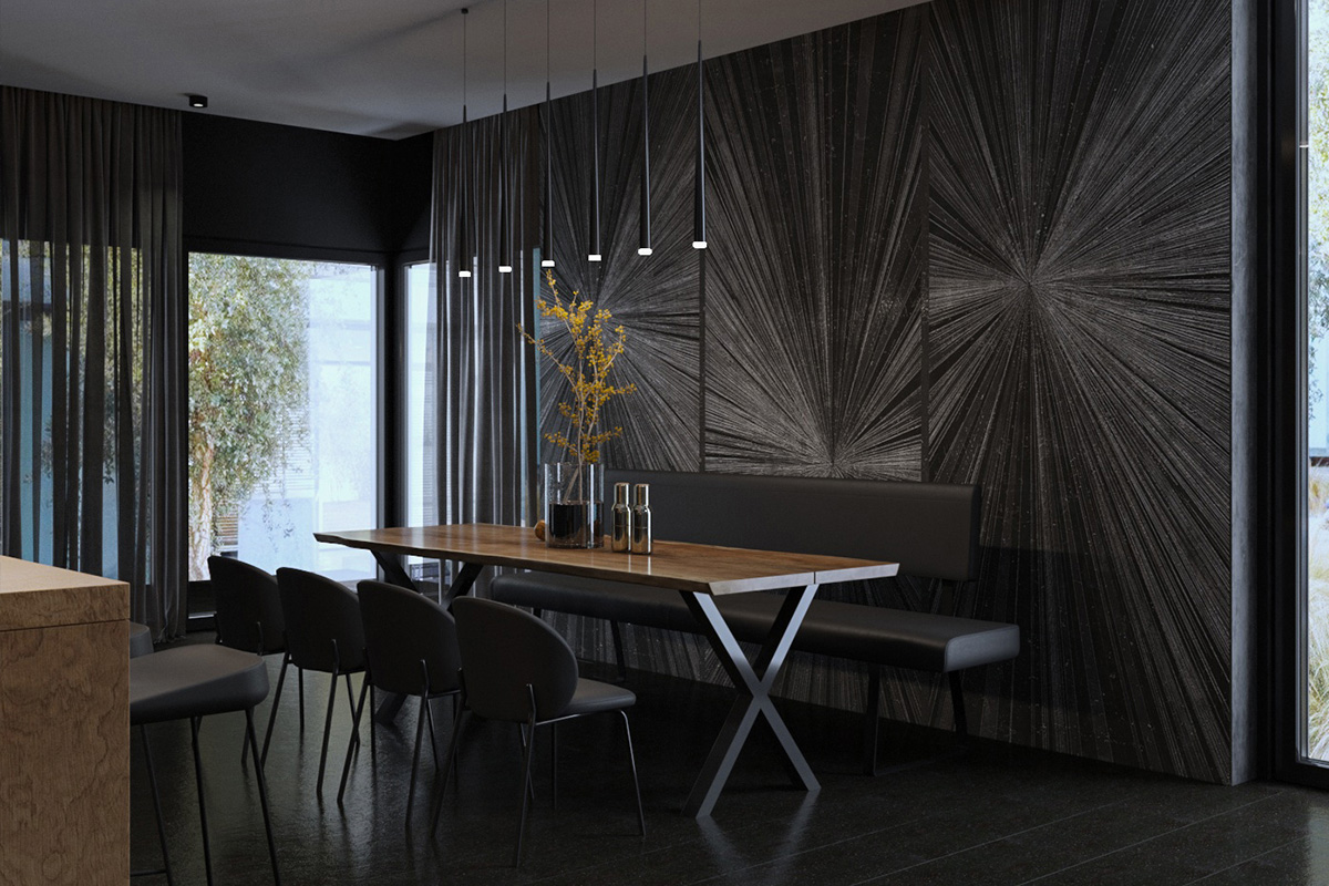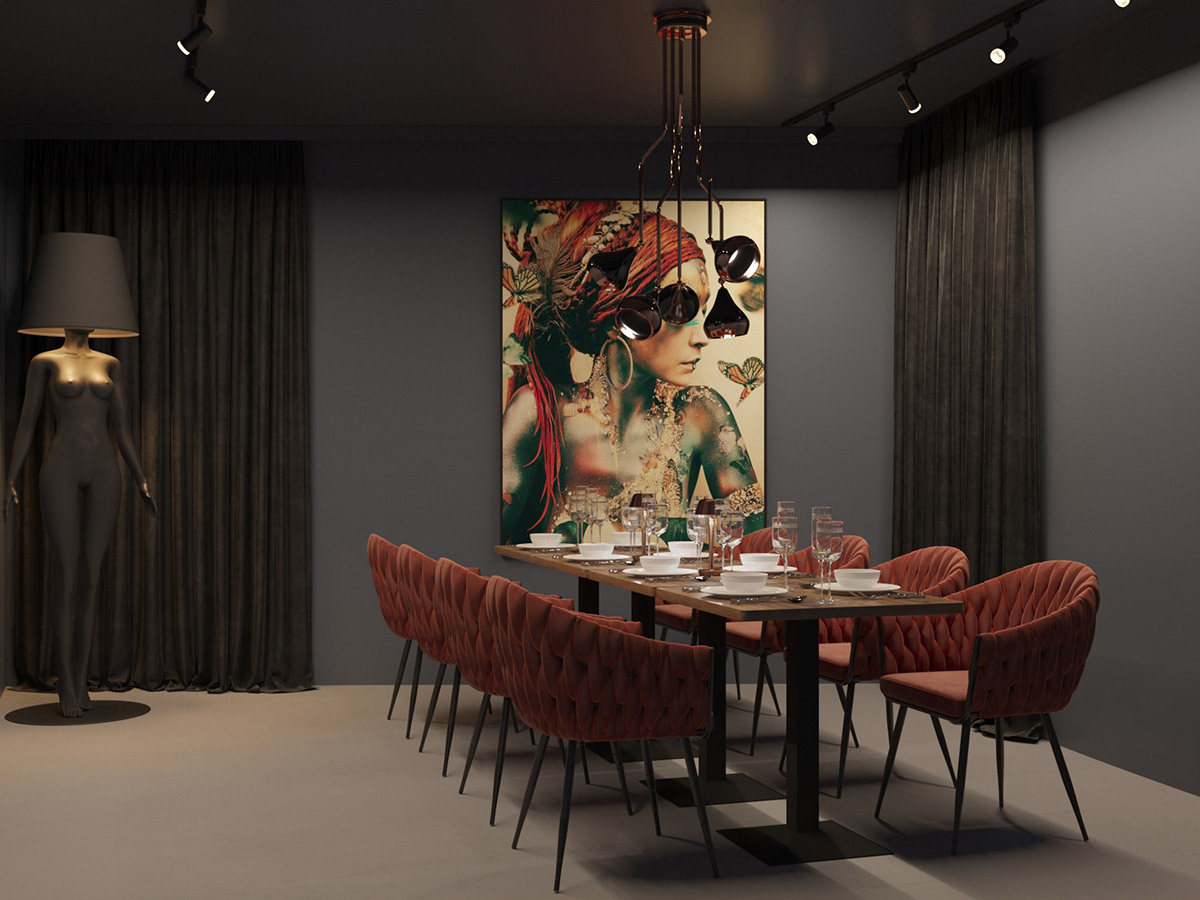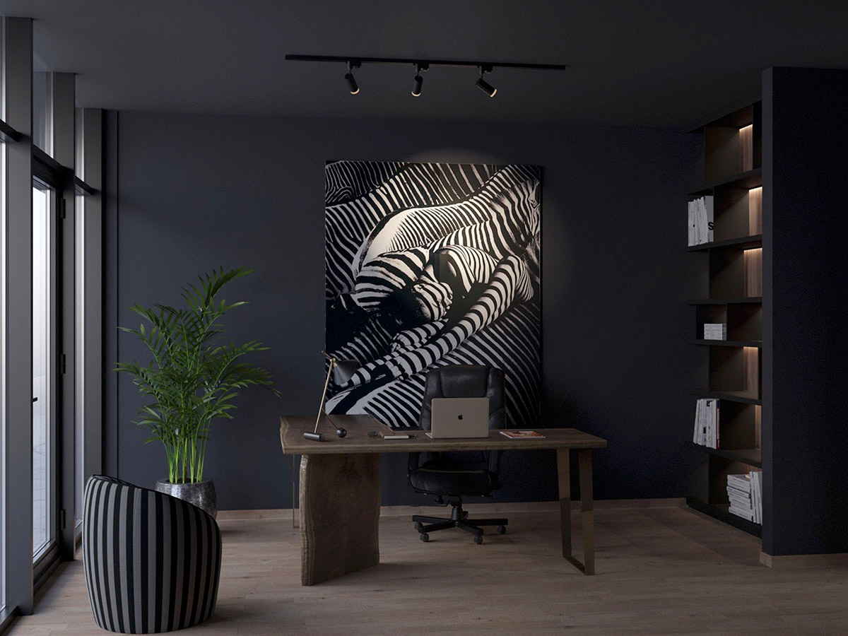 Ein dunkles Farbkonzept und maskulines Design - die luxuriöse Interieur-Gestaltung wird auch im Office stark sichtbar. Neben schwarzen Wand- und Deckenfarben, dunklen Möbeln und Lampen, bildet das Leinwandfoto den idealen Eyecatcher.