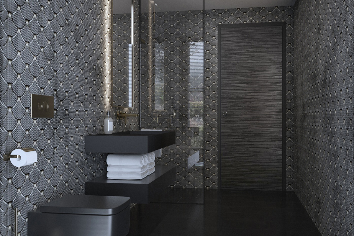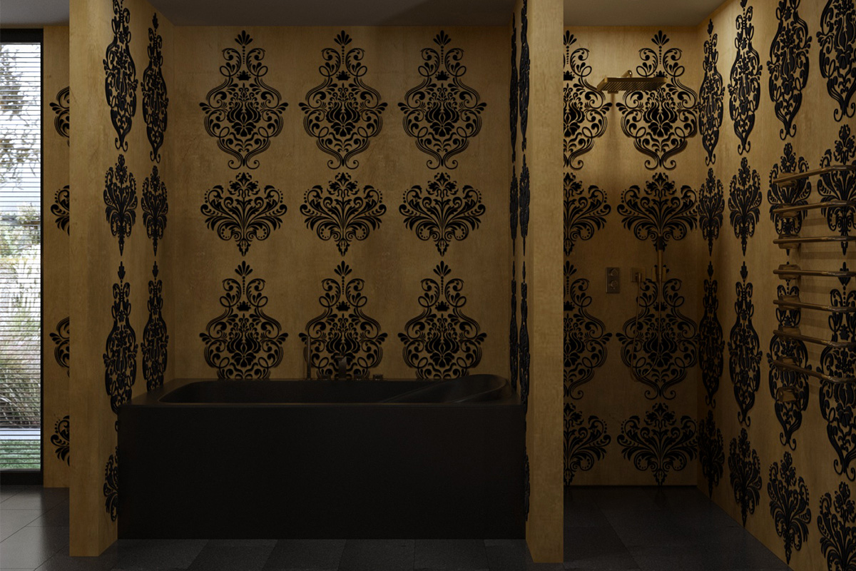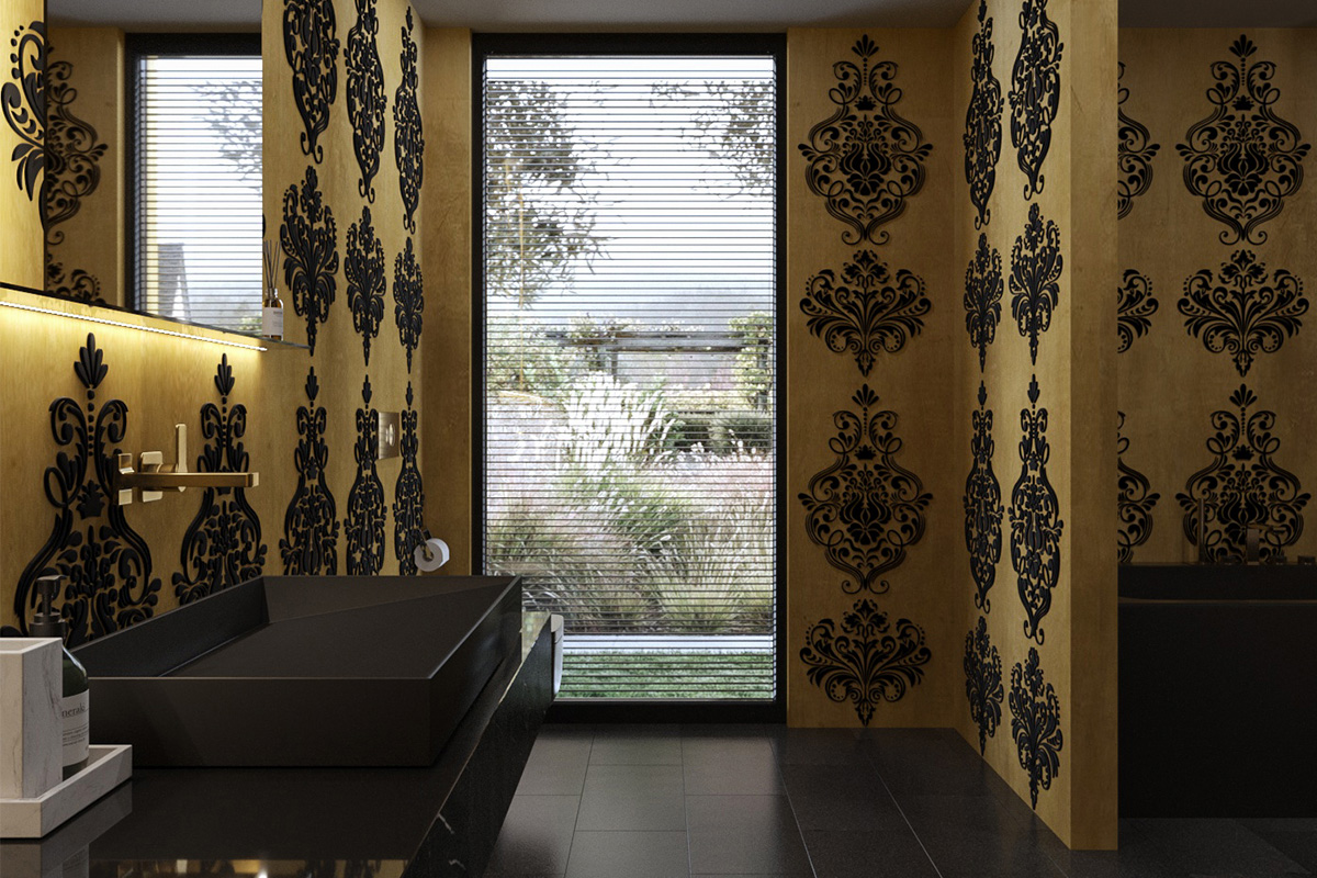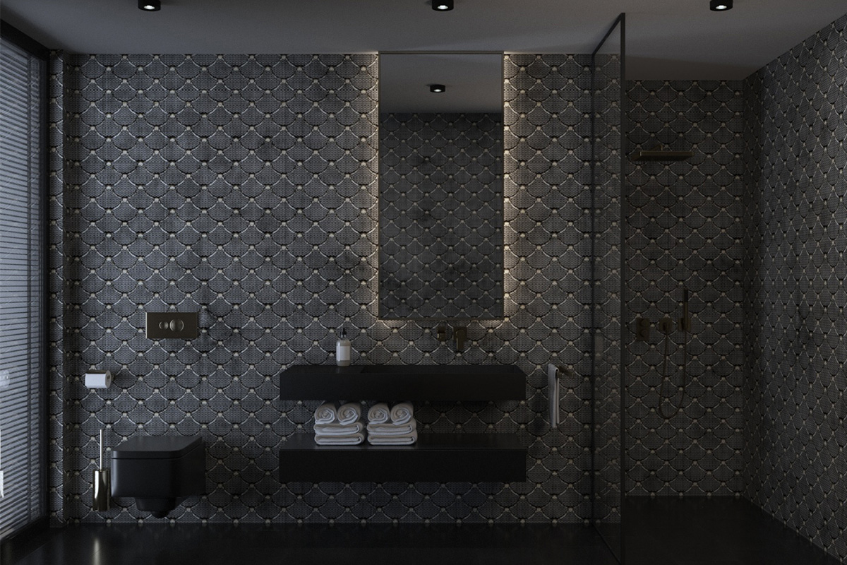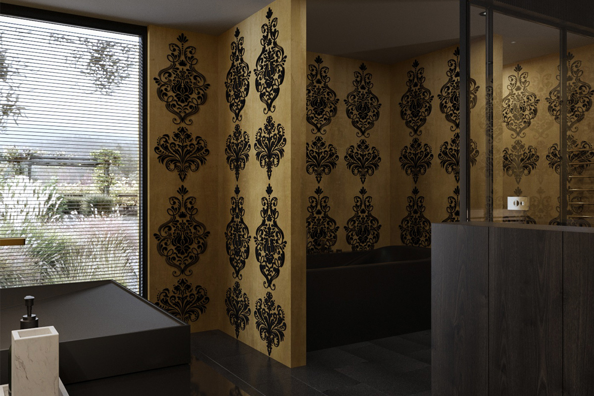 Im Badezimmer ziert eine graue Muster-Tapete den gesamten Raum. Das große Fenster lockert jedoch auch hier das Design und die dunkle Einrichtung auf und sorgt für ausreichend Tageslicht.
