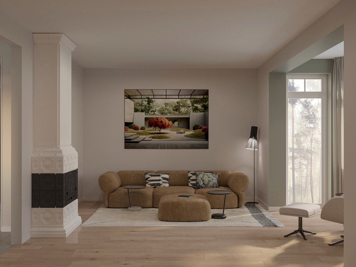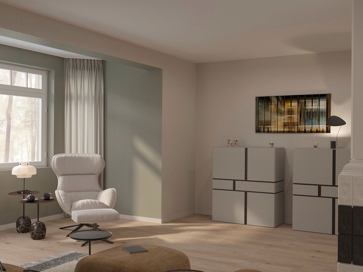 Die Auswahl der passenden Möbel und farblich abgestimmten Kunstelemente ergeben ein modernes und harmonisches Wohnen. Und die speziell angefertigten Einbauschränke sorgen für genügend Stauraum und ein aufgeräumtes Gesamtbild.