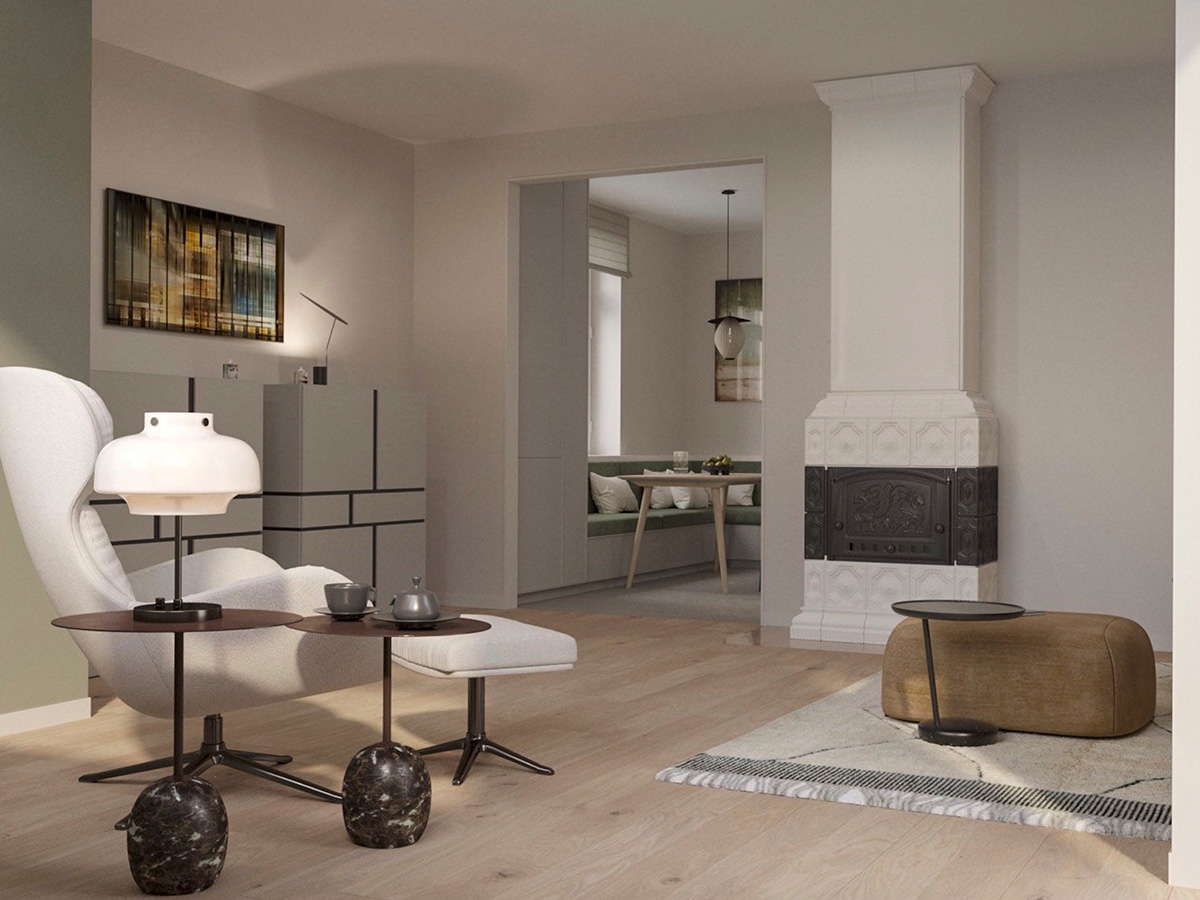 Der wunderschöne Kamin im Wohnzimmer wurde übernommen, kommt jedoch durch den neuen Bodenbelag und das gemütliche Pastell-Design besser zur Geltung.