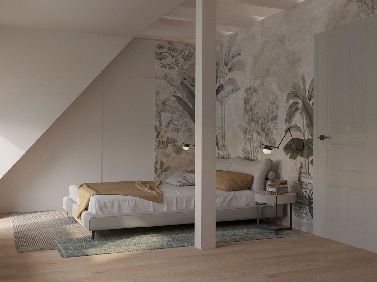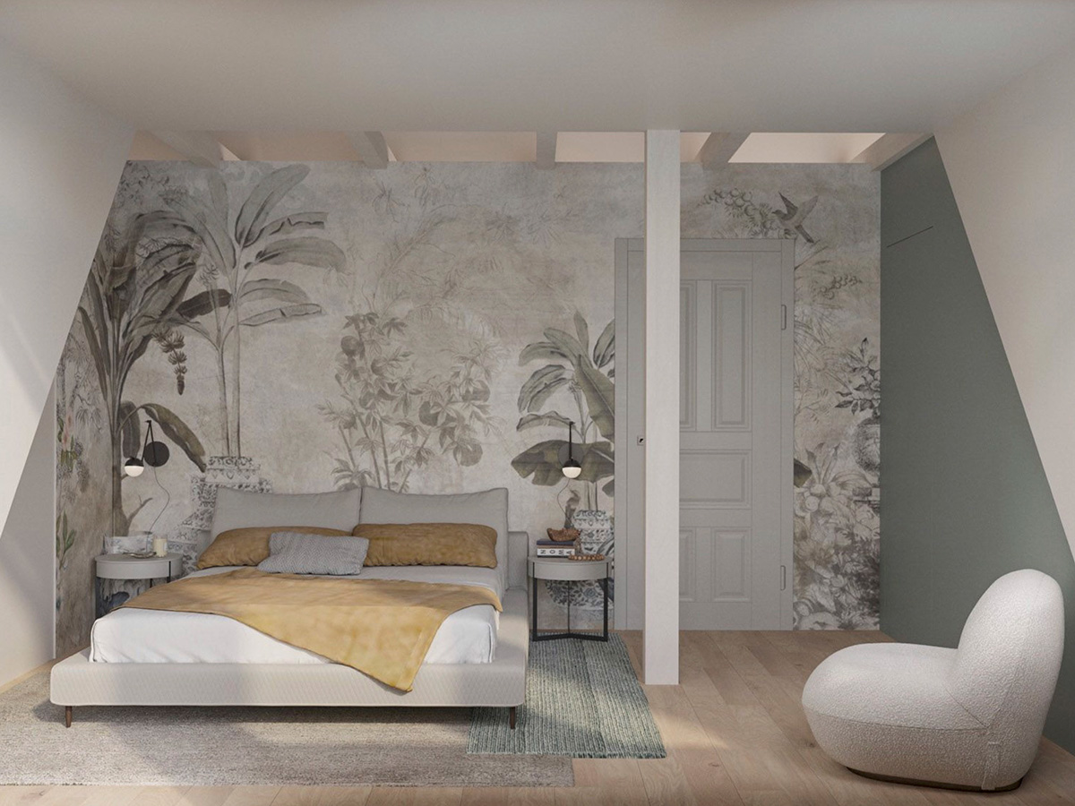 Auch im Schlafzimmer findet sich das Pastell-Farbkonzept mit grünen Details wieder. Die Tapete bildet einen Eye-Catcher und zieht eine Verbindung zur natürlichen Umgebung des Hauses. Durch die Aufteilung des Raumes wurde die Ankleide separiert, was dem Zimmer Harmonie und Ruhe verschafft.