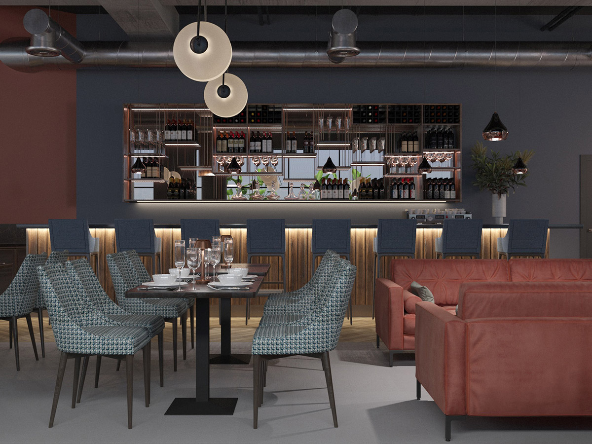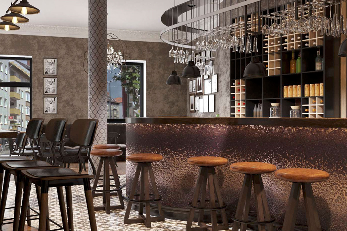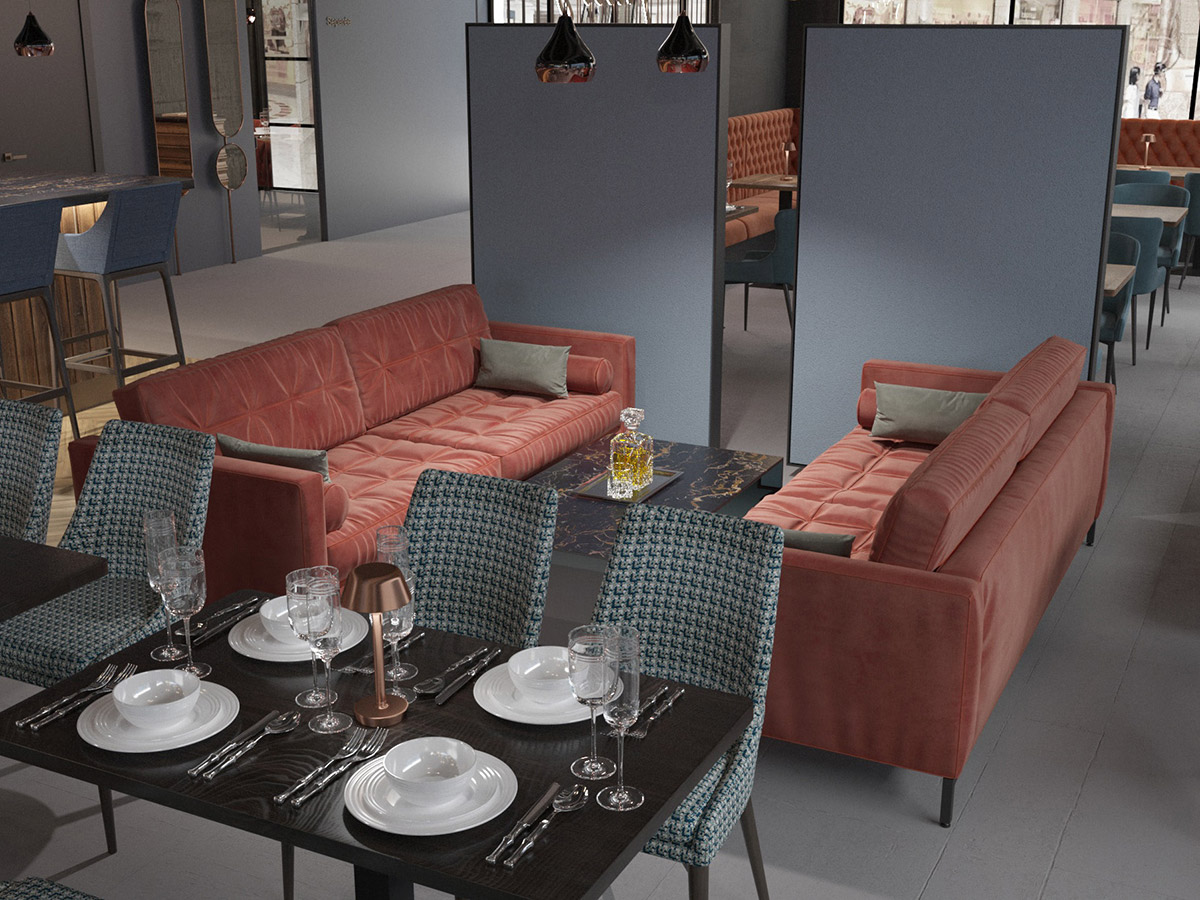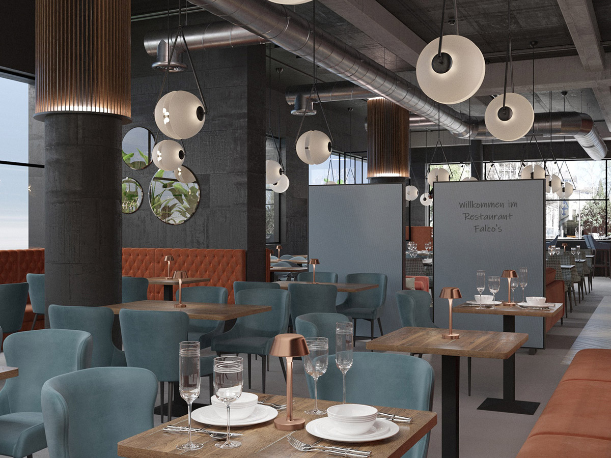 Der gesamte, offene Ess- und Bar-Bereich wirkt durch die verwendeten Farben und Materialien sehr einladend ist dank der vielen Fenster lichtdurchflutet. Die spezielle Raumaufteilung bietet, durch die Integration verschiedener Sitzgruppen, viel Platz für die Gäste und sorgt dennoch für genügend Abstand.