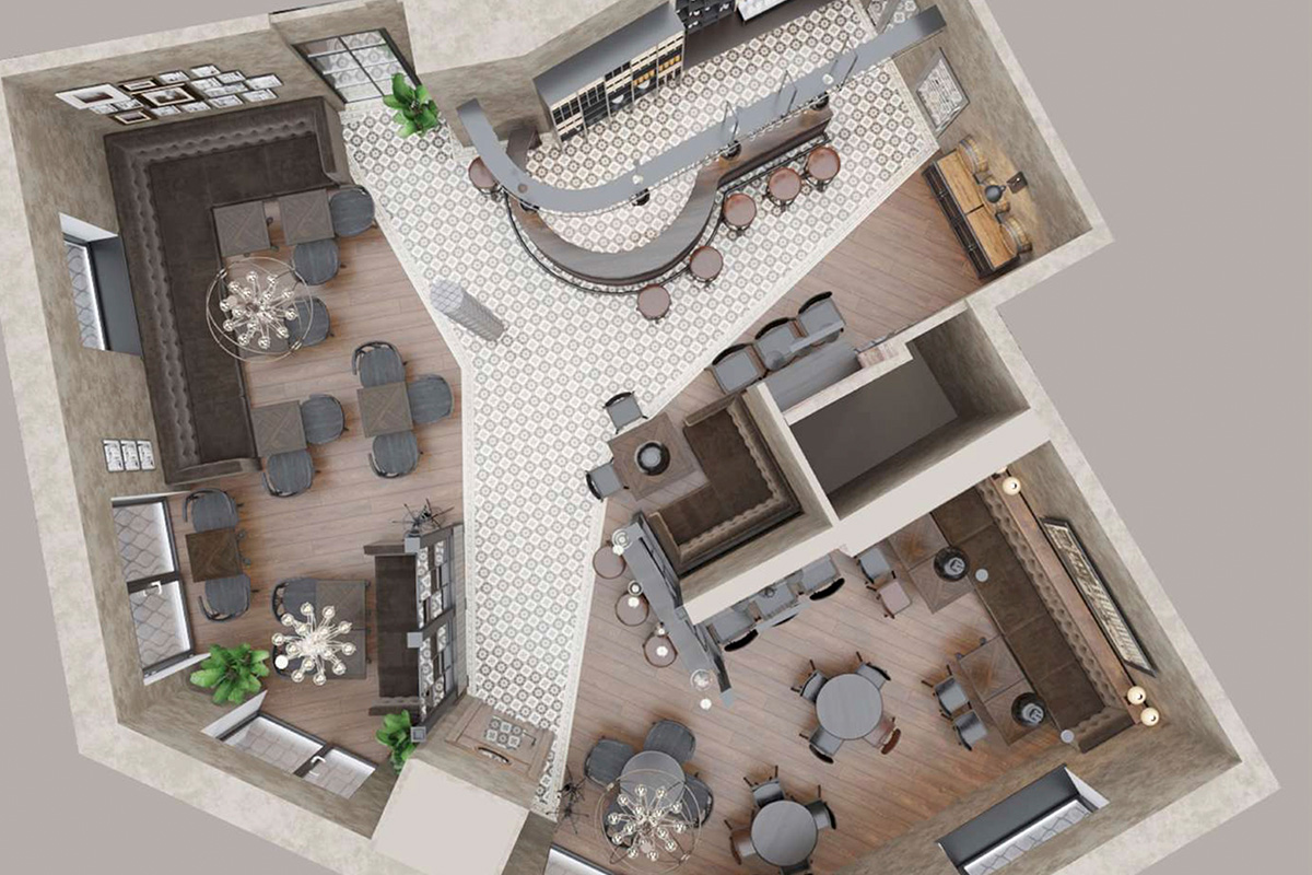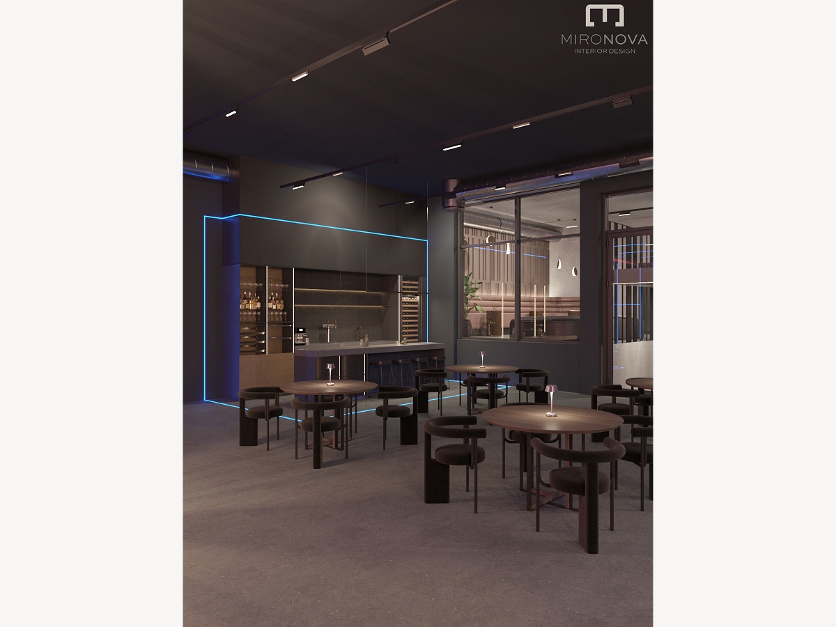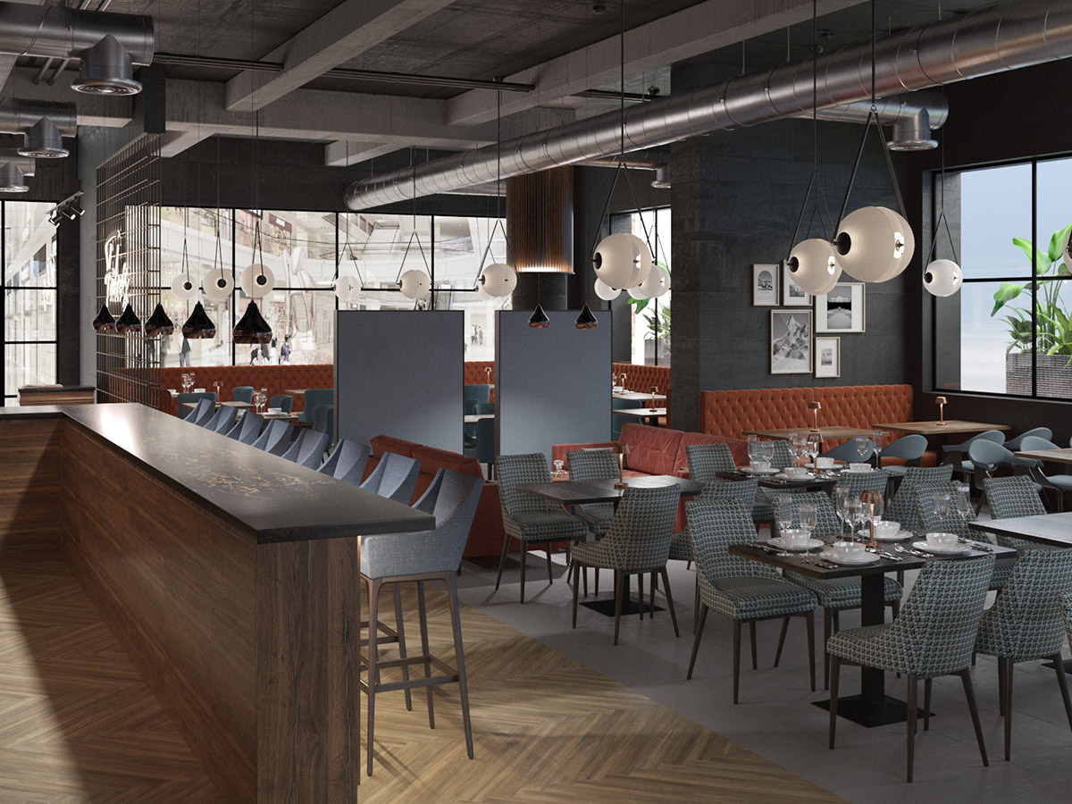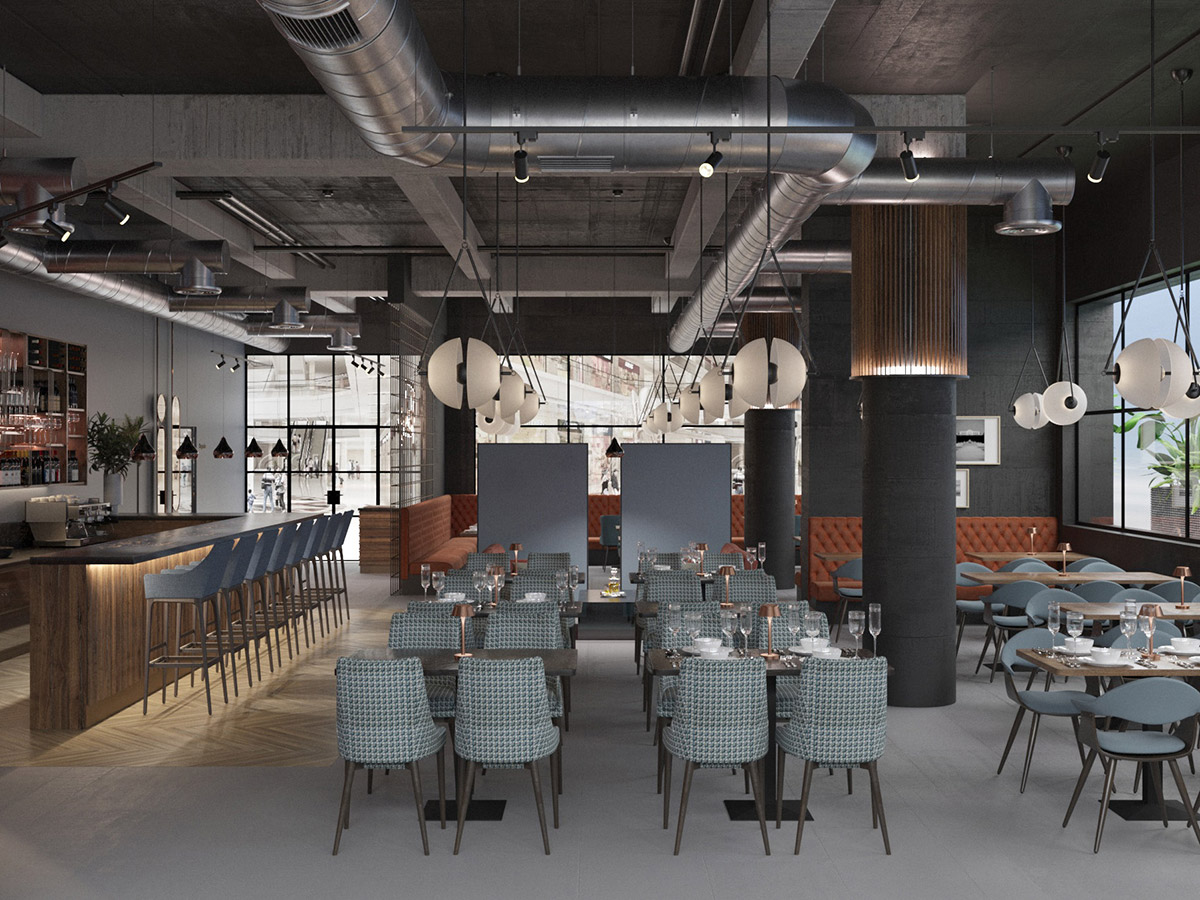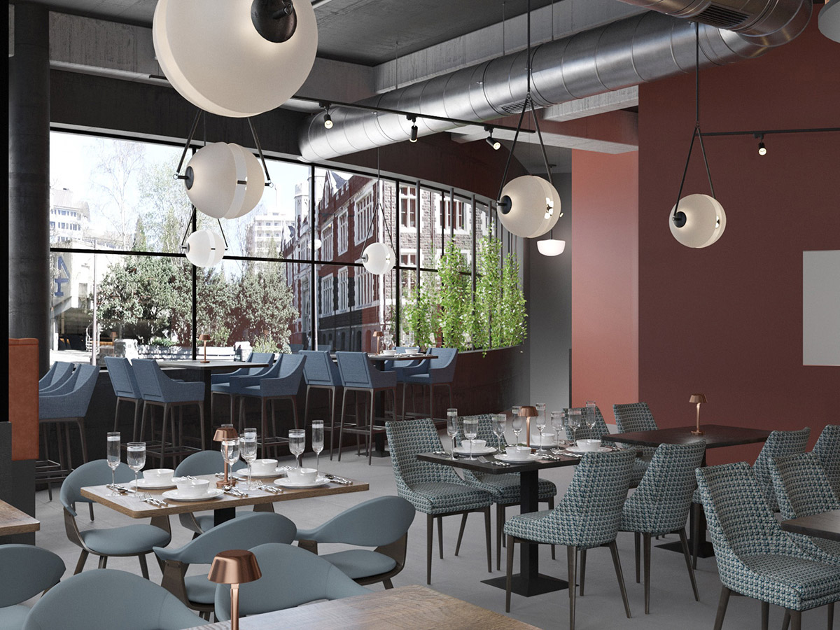Der gesamte, offene Ess- und Bar-Bereich wirkt durch die verwendeten Farben und Materialien sehr einladend ist dank der vielen Fenster lichtdurchflutet. Die spezielle Raumaufteilung bietet, durch die Integration verschiedener Sitzgruppen, viel Platz für die Gäste und sorgt dennoch für genügend Abstand.