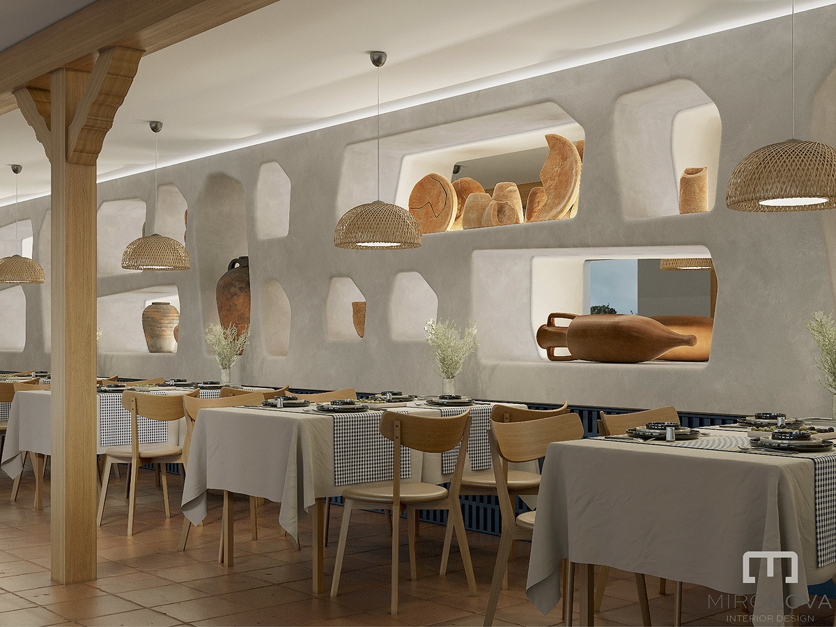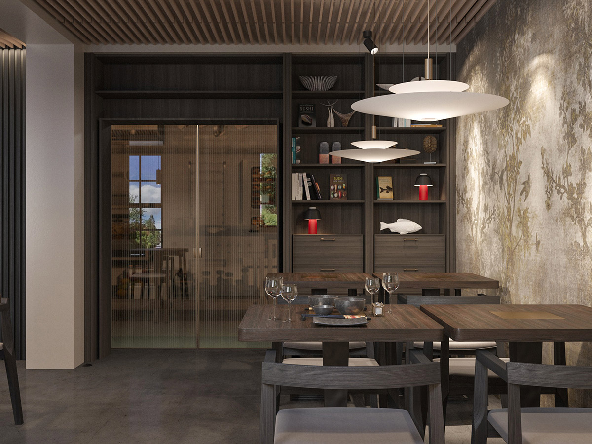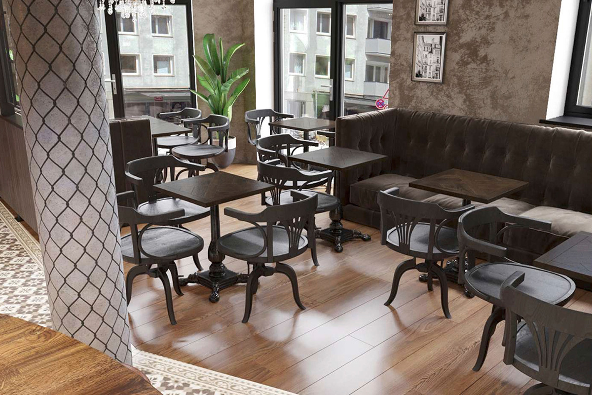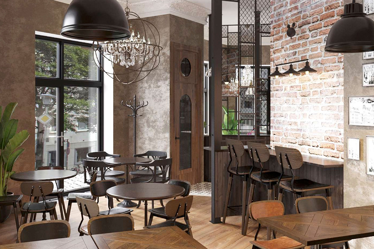 Der gesamte, offene Ess- und Bar-Bereich wirkt durch die verwendeten Farben und Materialien sehr einladend ist dank der vielen Fenster lichtdurchflutet. Die spezielle Raumaufteilung bietet, durch die Integration verschiedener Sitzgruppen, viel Platz für die Gäste und sorgt dennoch für genügend Abstand.