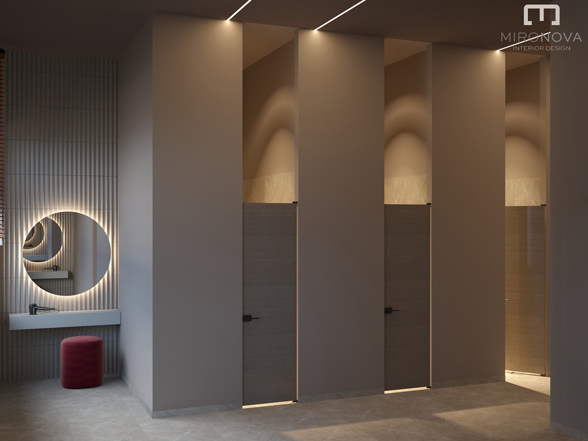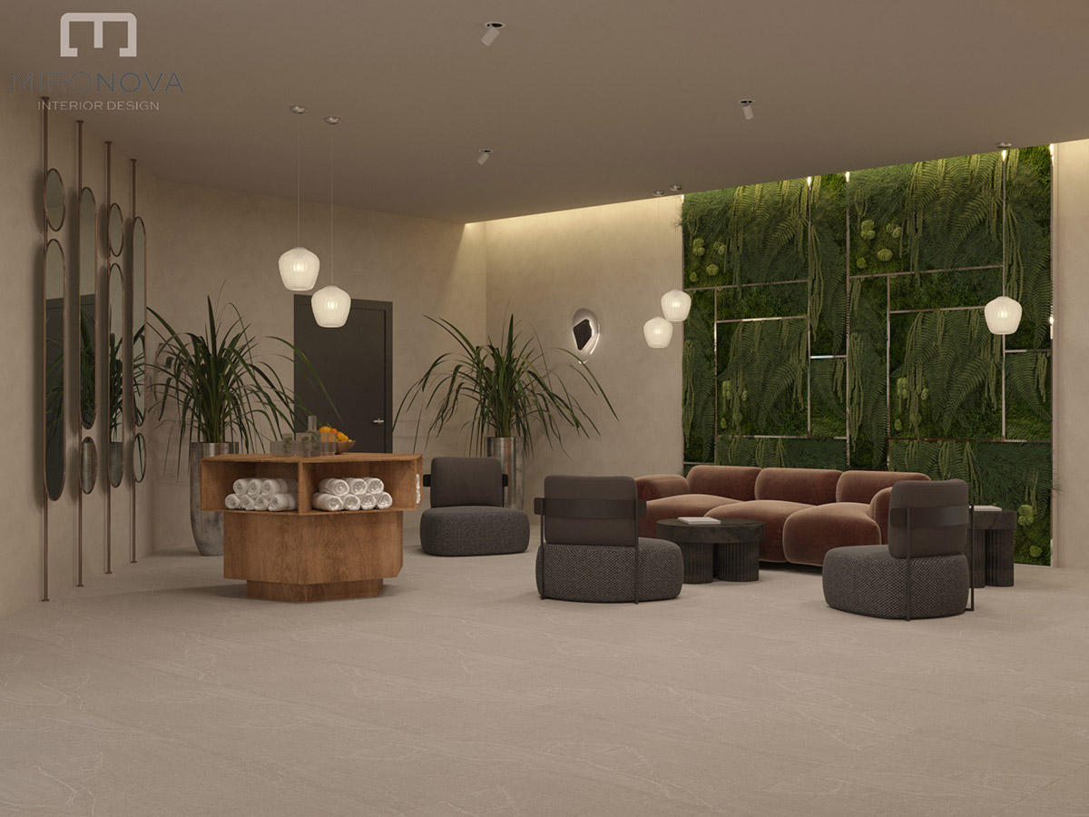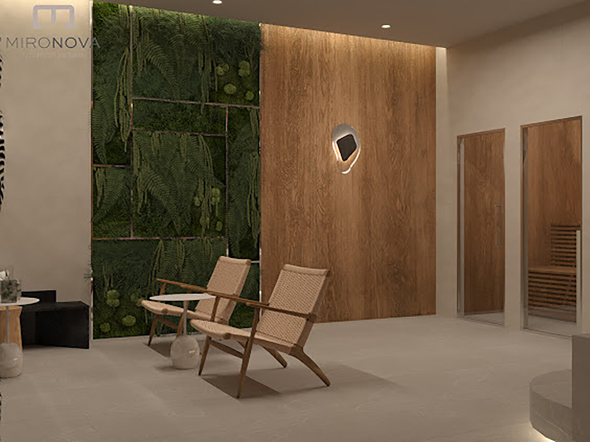 Neben den weitläufigen Trainingsflächen im Erdgeschoss und in der ersten Etage, laden Sitzbereiche zu kurzen Ruhepausen zwischen den Workouts oder zum Entspannen nach dem Training ein. Die ausgewählten Farben, Wandmuster, verspiegelten Säulen und das abgestimmte Lichtkonzept sorgen im Trainingsbereich für ein modernes Gesamtdesign und im Sauna-/Ruhebereich für eine beruhigende Atmosphäre.