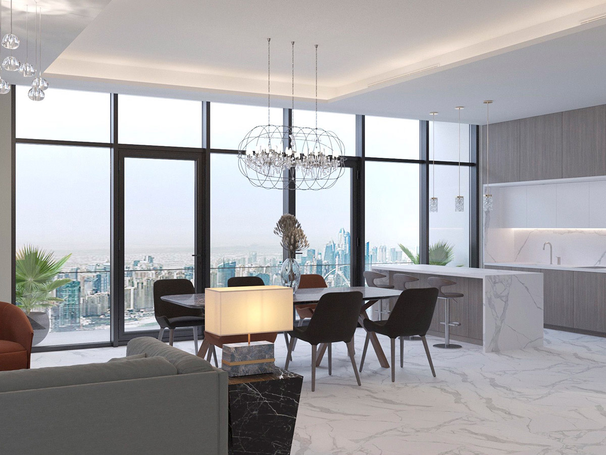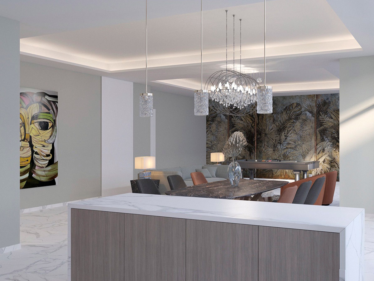 Die lange Fensterfront spendet viel Tageslicht und gibt den Blick auf die Skyline frei. Eingelassene Deckenlampen, kristallklare Hängelampen und kleinere Lichtquellen unterstützen das helle Lichtkonzept uns sorgen für ein stilvolles Ambiente im Küchen- und Essbereich.