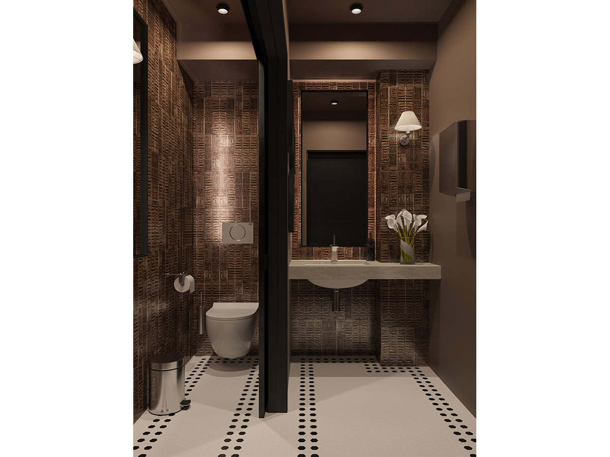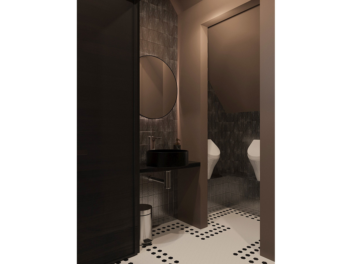 Der Industriell-Look mit den Retro-Lampen und den dunklen Farben wird durch die hellbraunen Holzstäbe der Ladies Area aufgelockert.