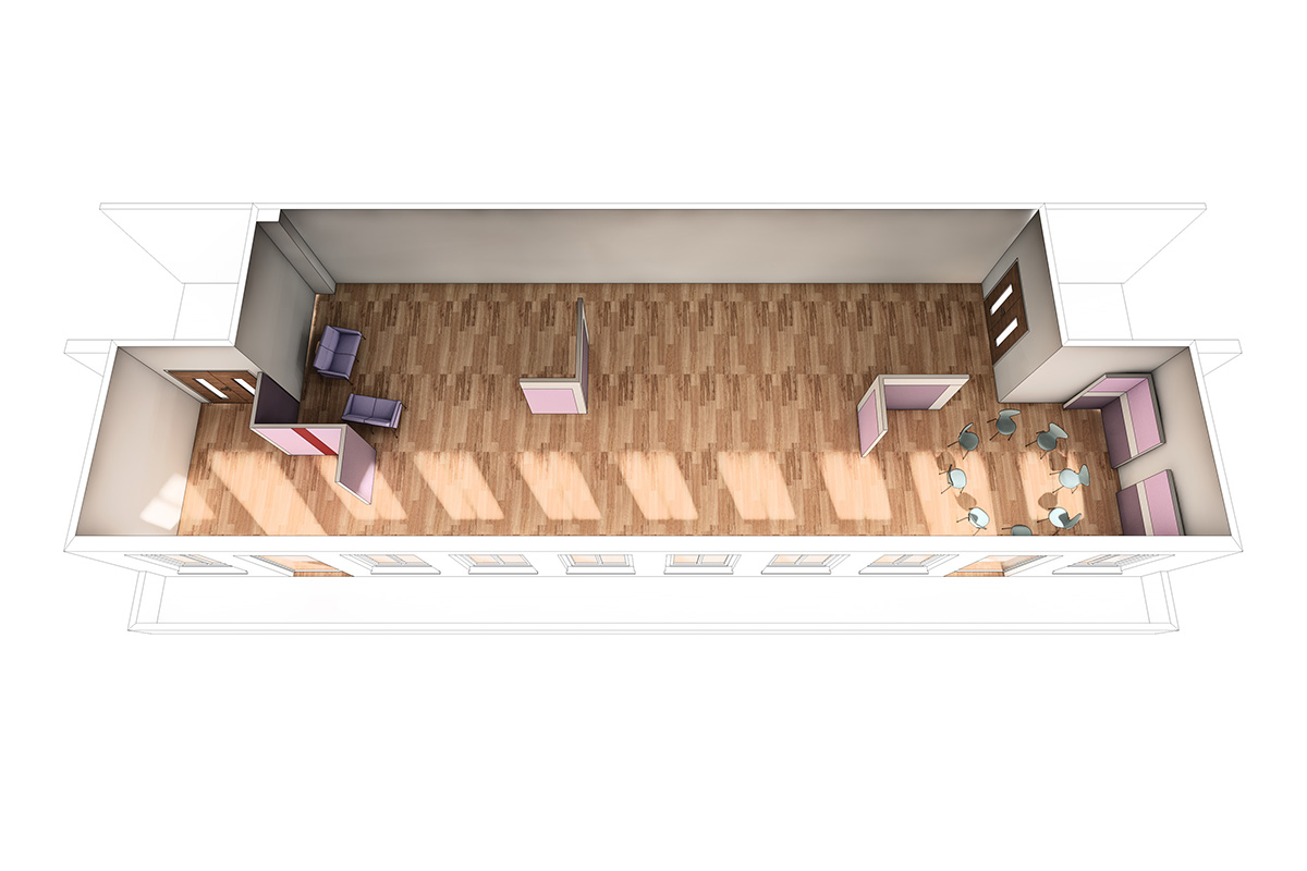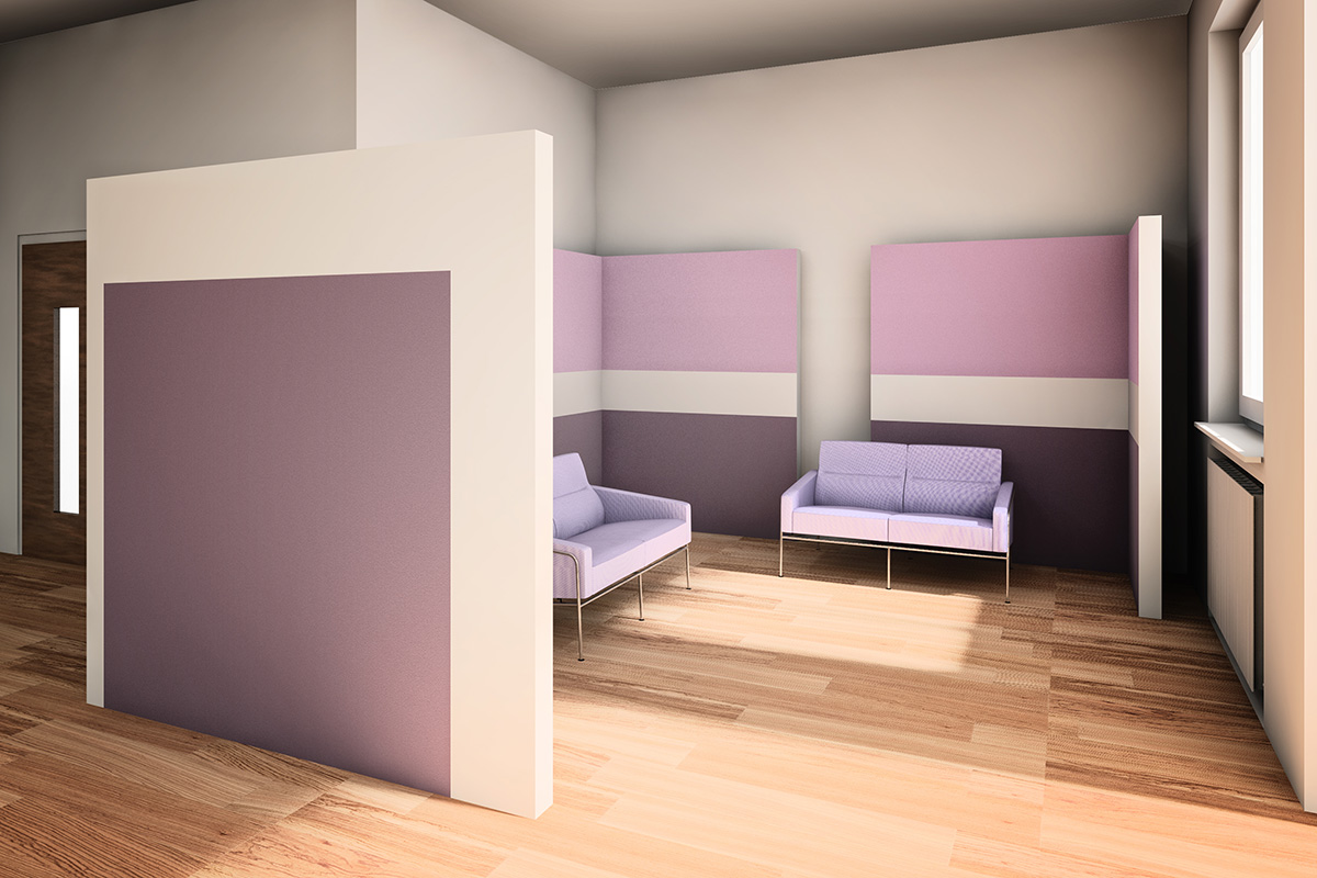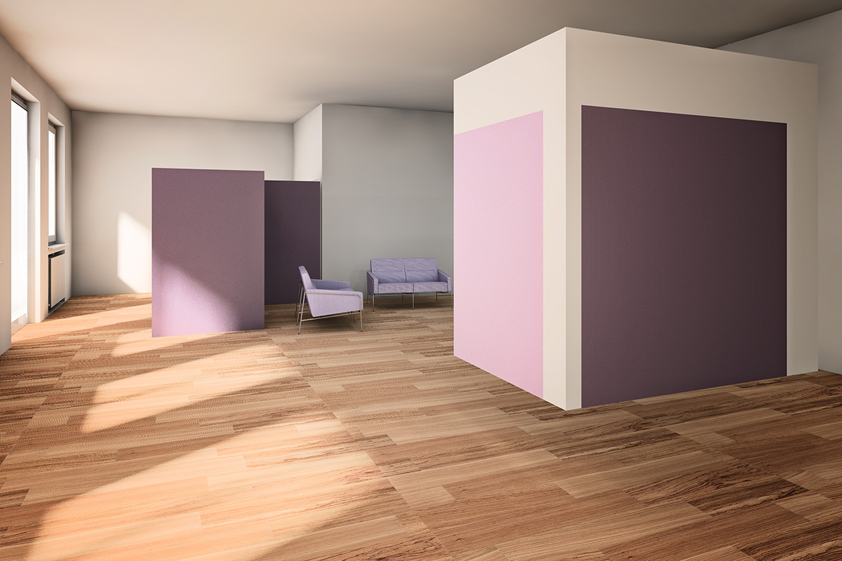 Mobile Wände schaffen verschiedene Ort, die eine eigene Aufenthaltsqualität erzeugen. Durch die schallschluckende Bespannung der Wände entstehen intime Rückzugmöglichkeiten. Flexibilität und Mehrfachnutzen standen bei der Gestaltung im Fokus.