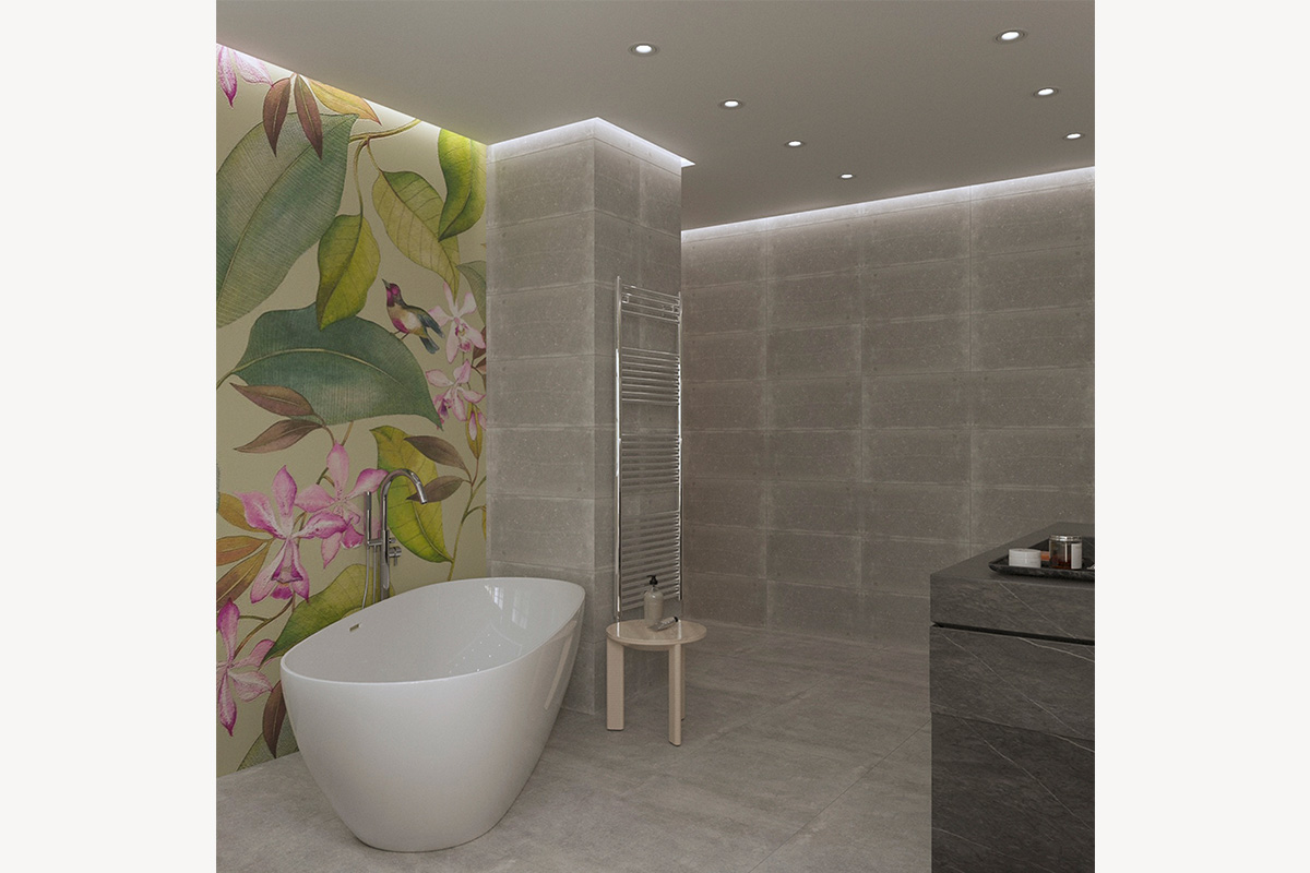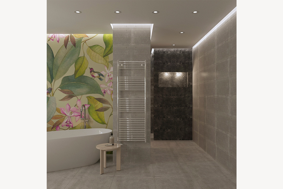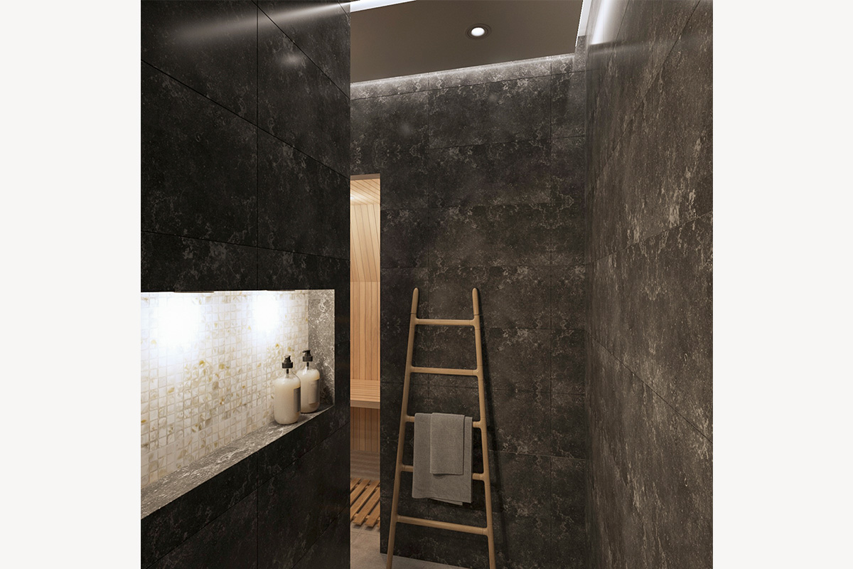 Bei diesem spannenden Projekt sind die Badewanne, eine Dusche und eine Sauna auf einer kleinen Fläche vereint. Die Tapete hinter der freistehenden Badewanne bringt eine beruhigende, natürliche Atmosphäre in den Raum. Die moderne Dusche wirkt durch den dunklen Stein hochwertig und einladend. Vom Badezimmer aus gelangt man in den dahinter liegenden Duschbereich. Daneben wurde zusätzlich die geräumige Sauna eingebaut.