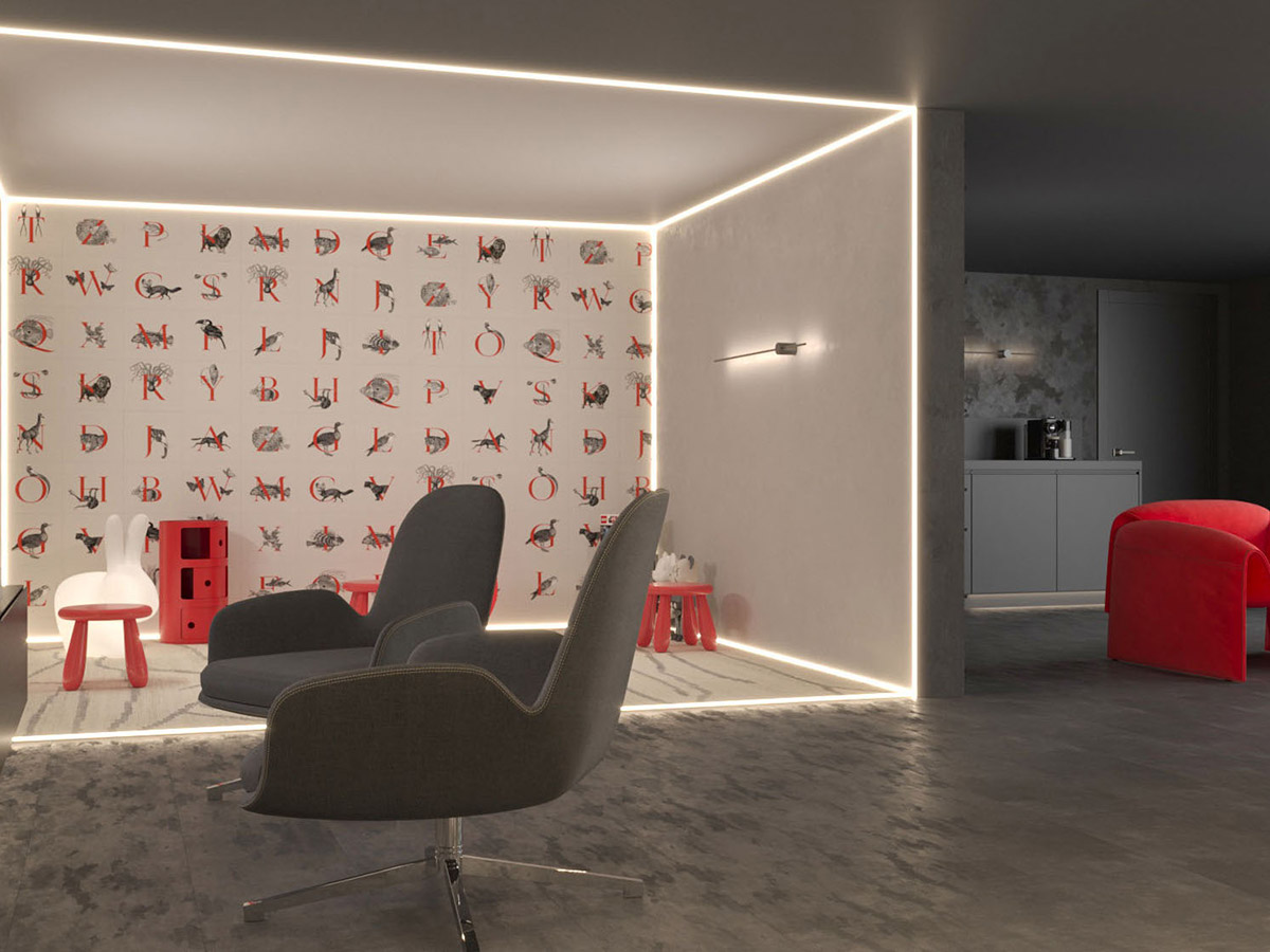 Die Aufgabe war es, aus einem kühlen Durchgangsbereich eine Atmosphäre für einen Mehrzweckraum zu schaffen, in denen sich sowohl Suchtkranke als auch Besucher geborgen fühlen.