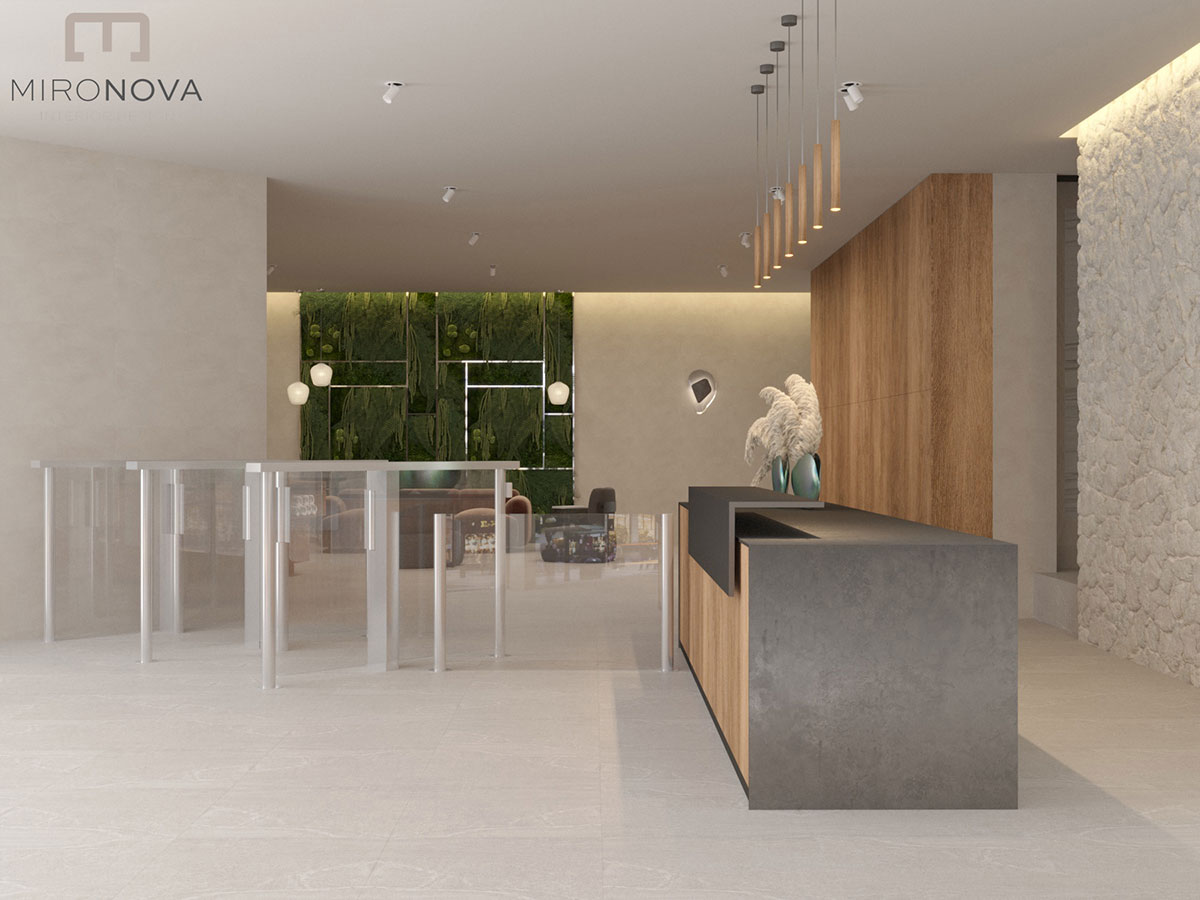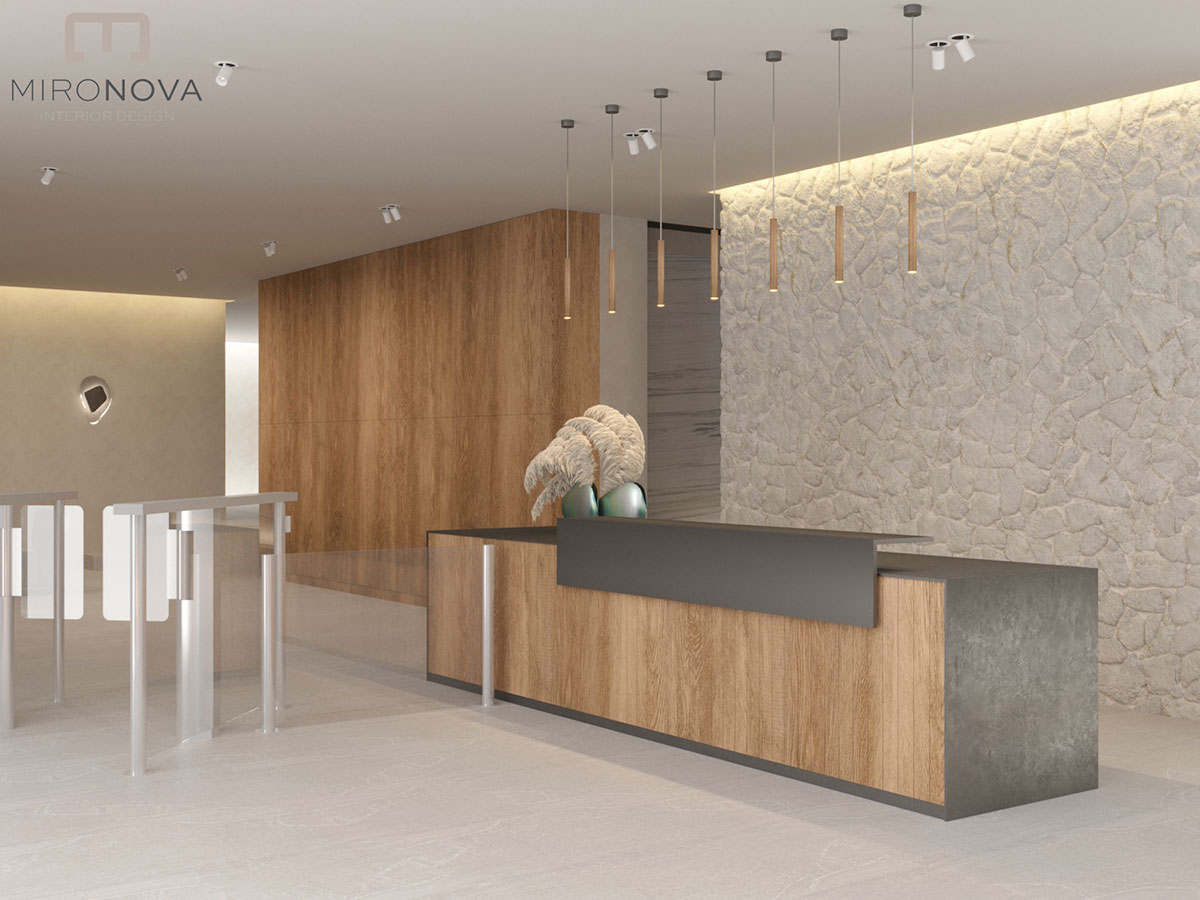 Im Eingangsbereich werden die Besucher mit einer einladenden Lounge begrüßt. Der Tresen besteht aus zwei verschiedenen Holz-Tönen und schafft eine Verbindung zwischen dem Industrial-Look und den Holz-Akzenten.